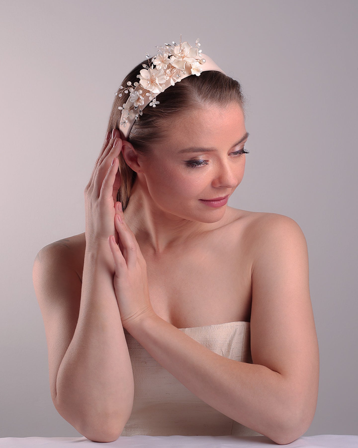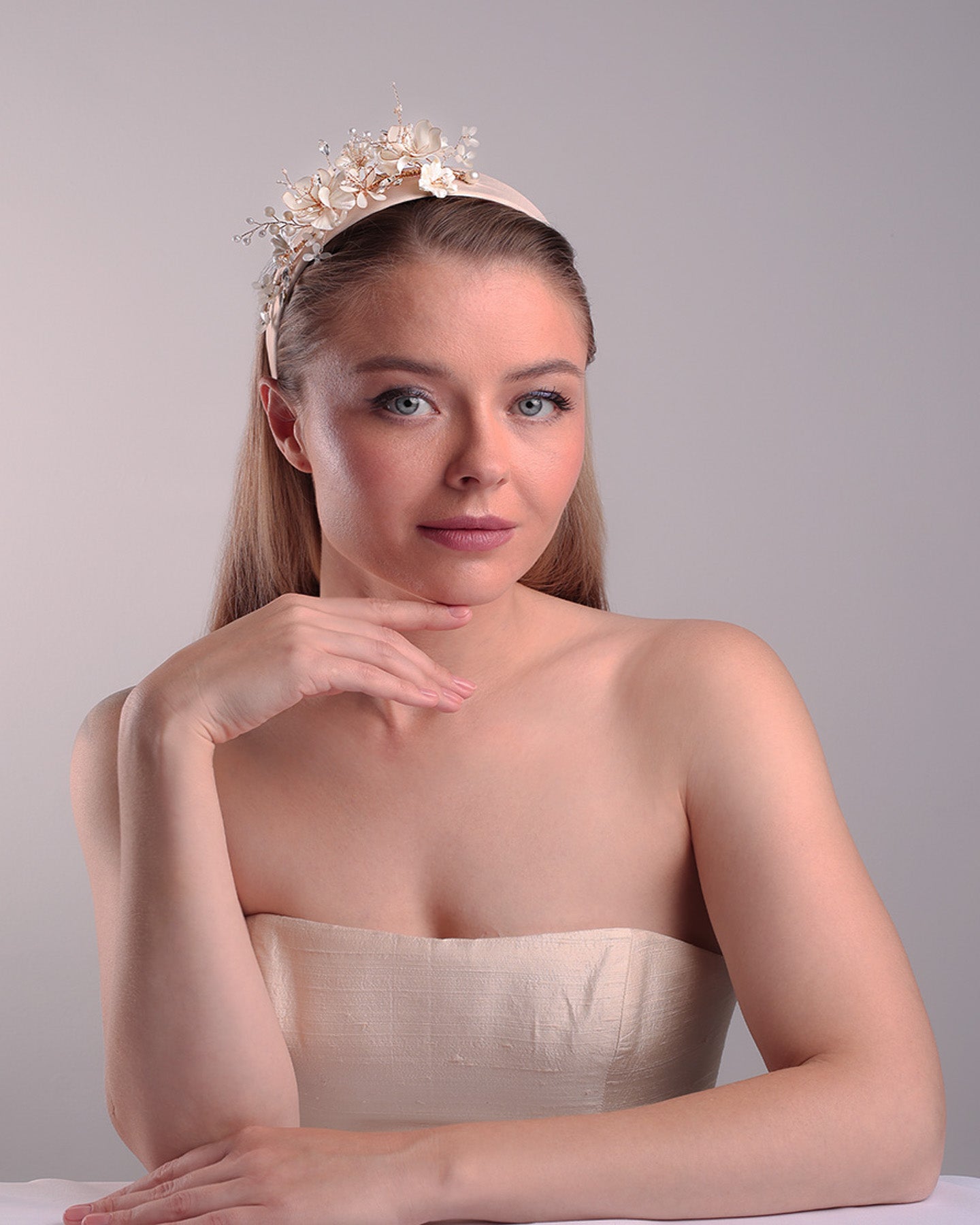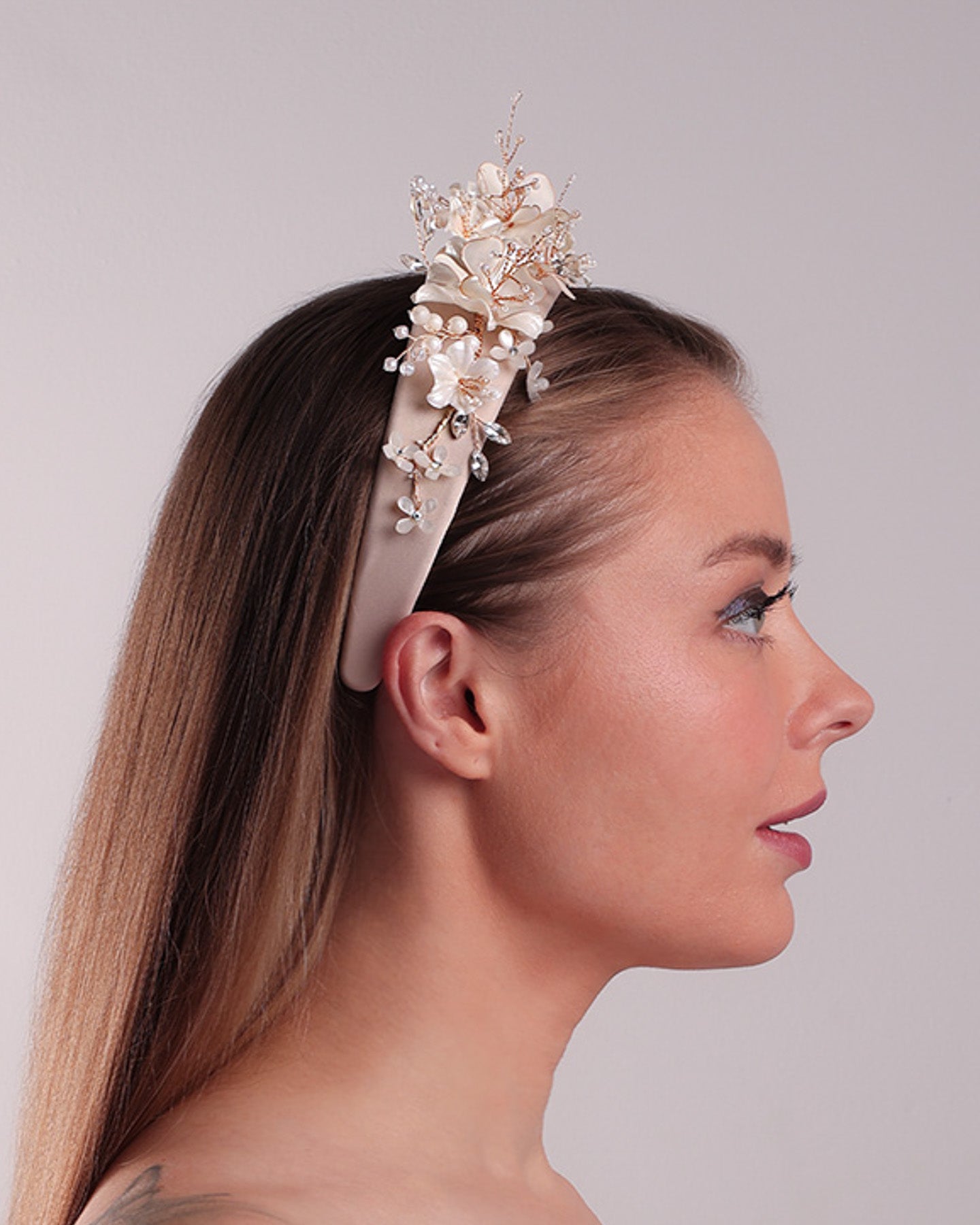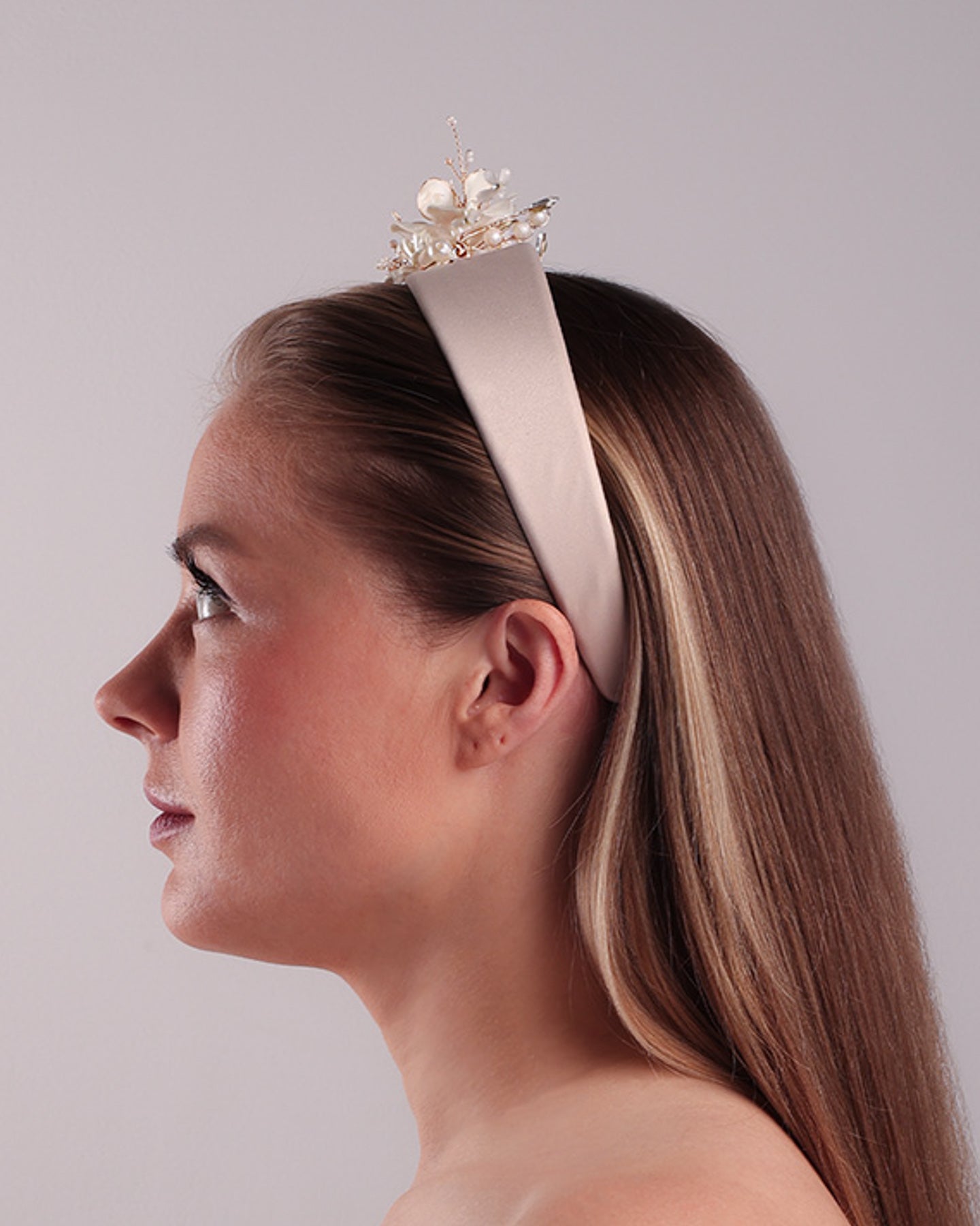 Description: Alice style flat silk headband decorated with ivory resin flower arrangment with beads.