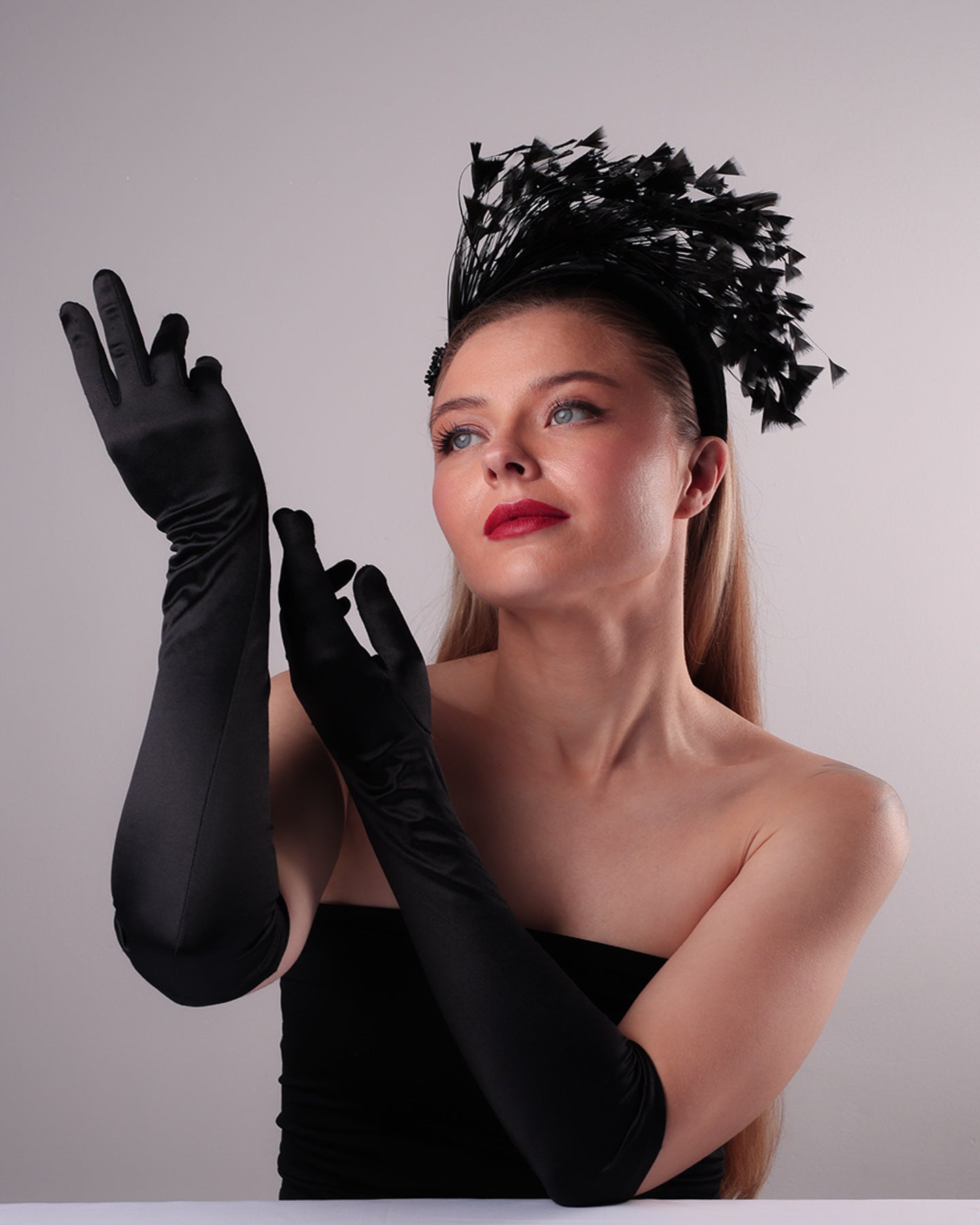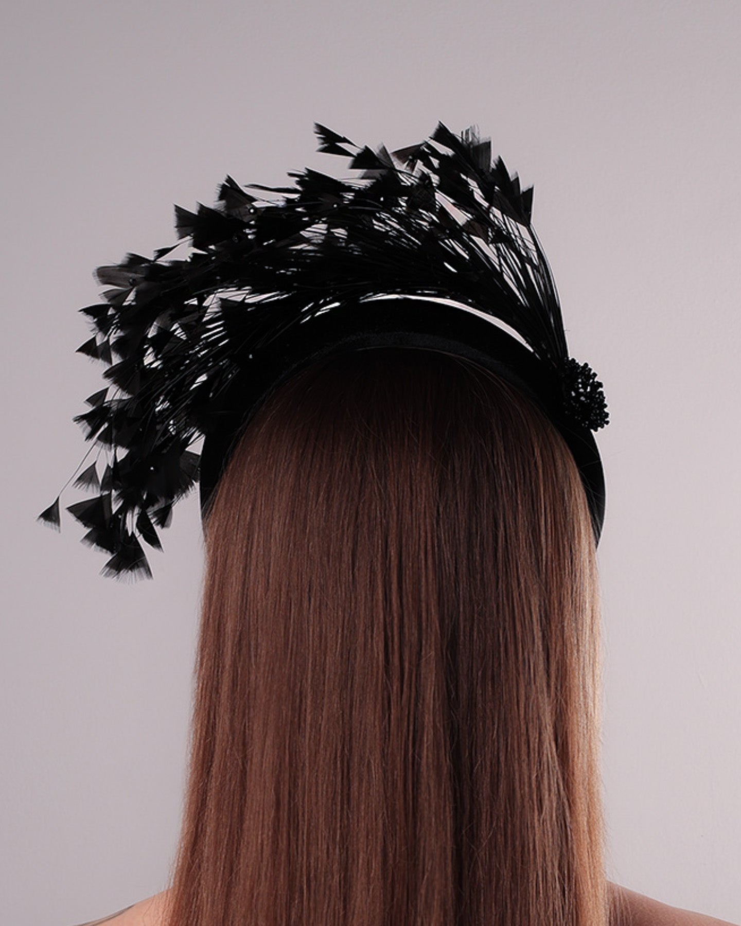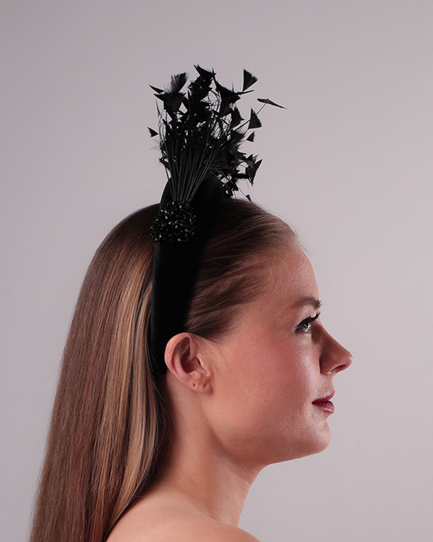 Description: Black velvet high headband decorated with arching layered high goose feathers. Embellished with crystal beads cluster at the edge.