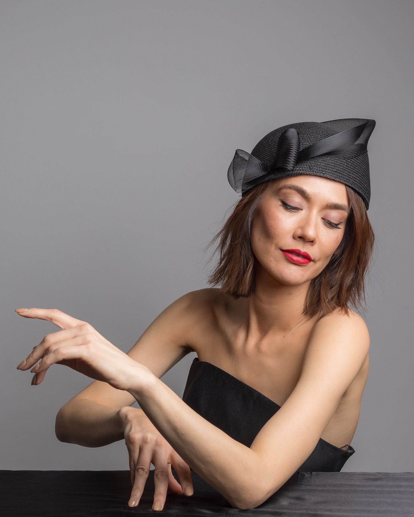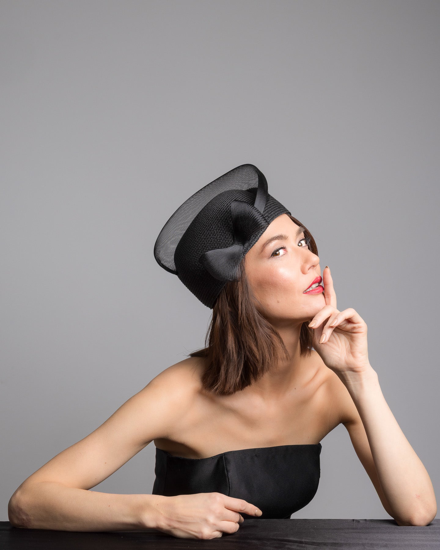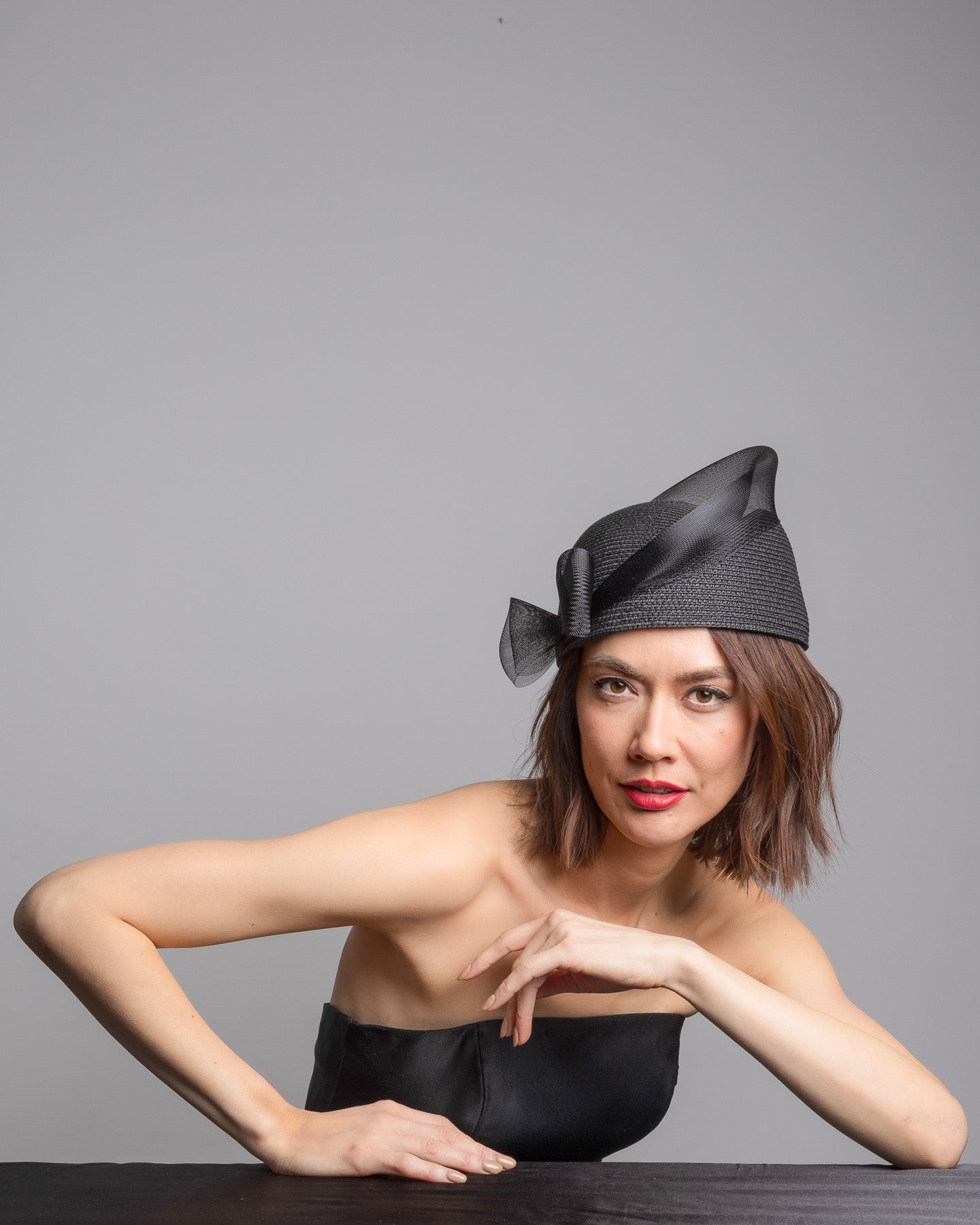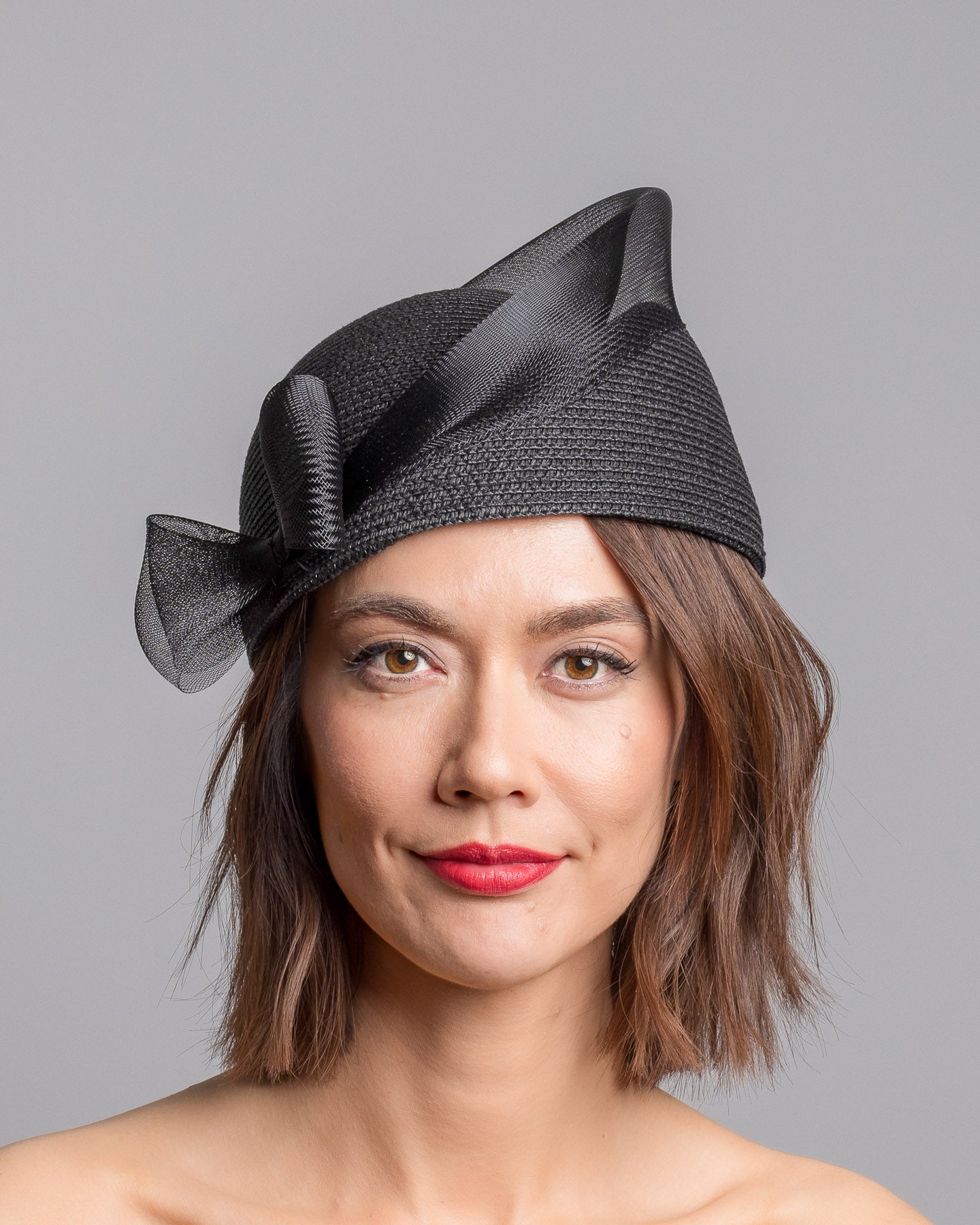 Fayne is a structured black straw pillbox hat, sculpted with clean architectural lines and finished with a soft side bow detail that adds subtle femininity. The textured straw base gives it quiet depth, while the angled silhouette creates a refined, modern profile.