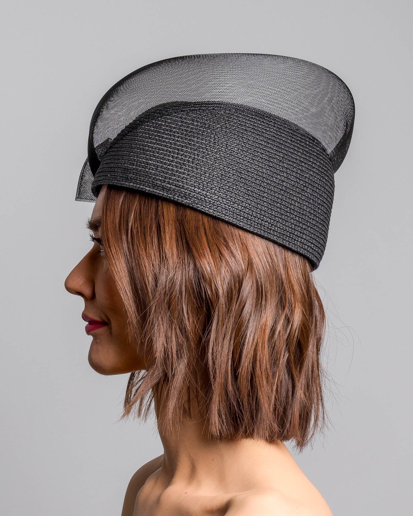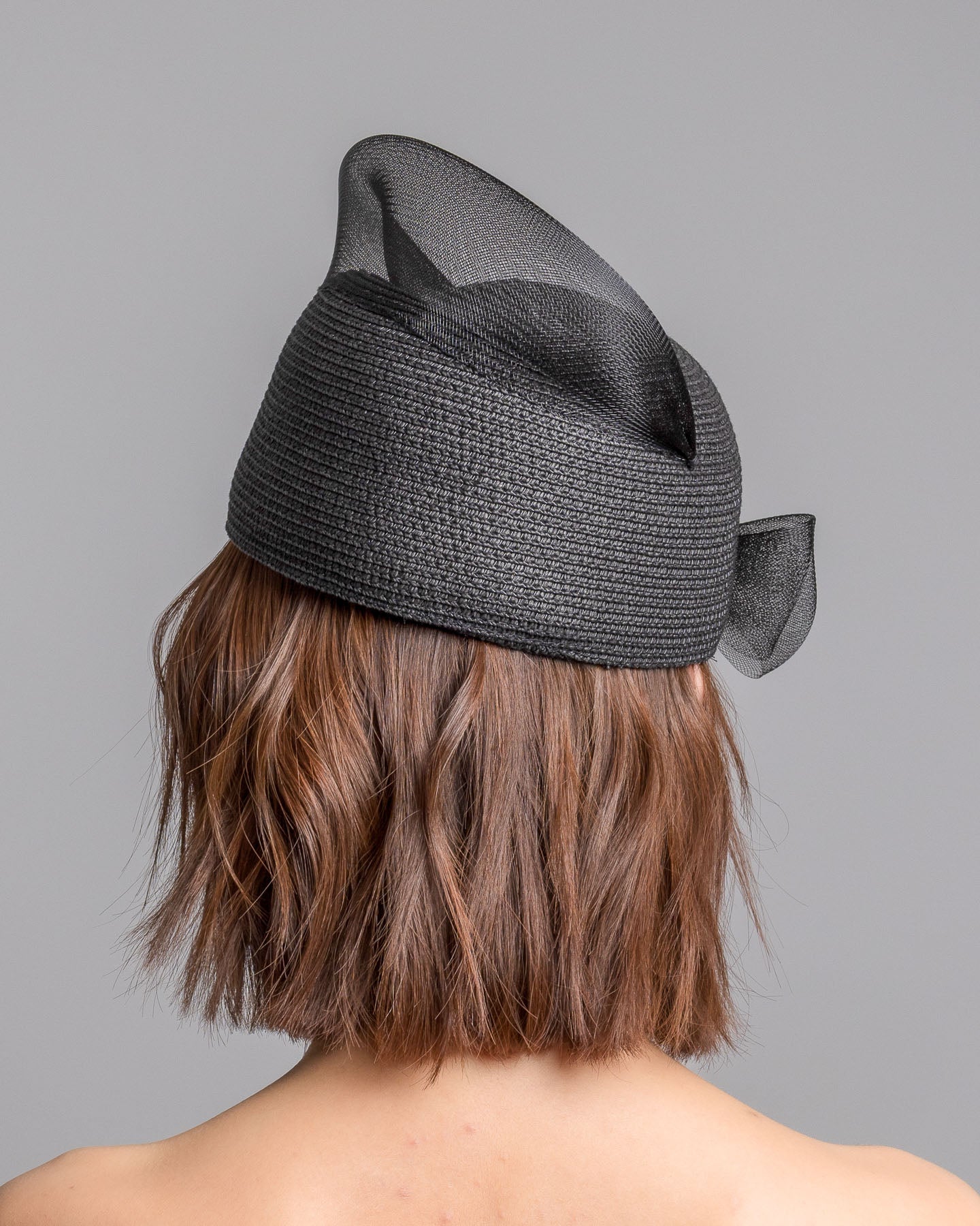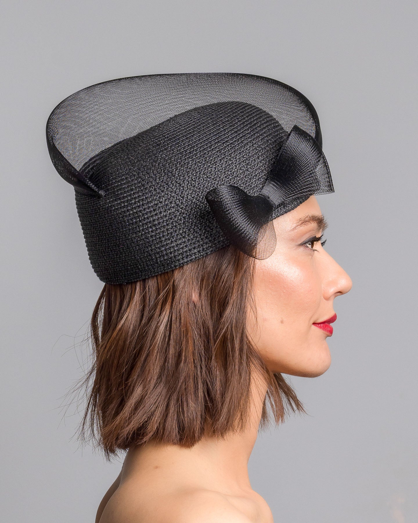 Description: Black straw pillbox hat with a structured woven crown, wrapped in a sheer sinamay band that curves around the top, finished with a delicate mesh bow detail at the side.