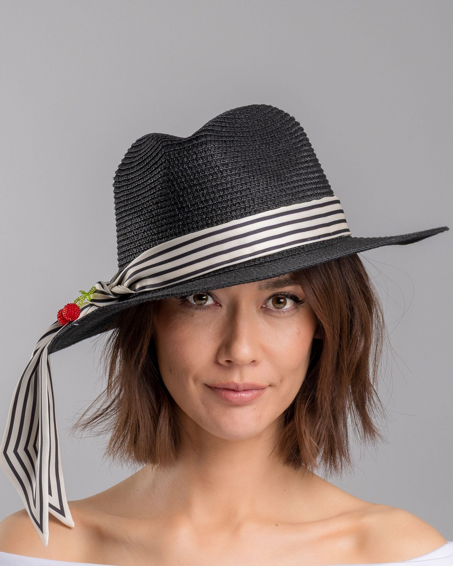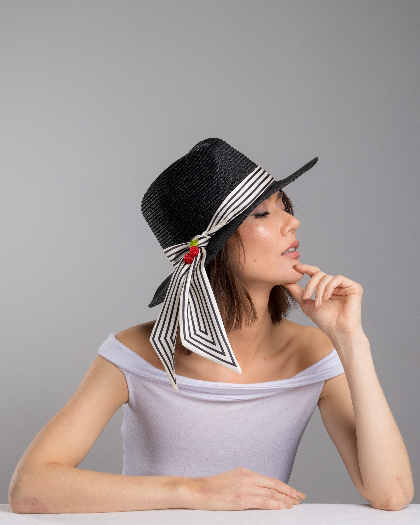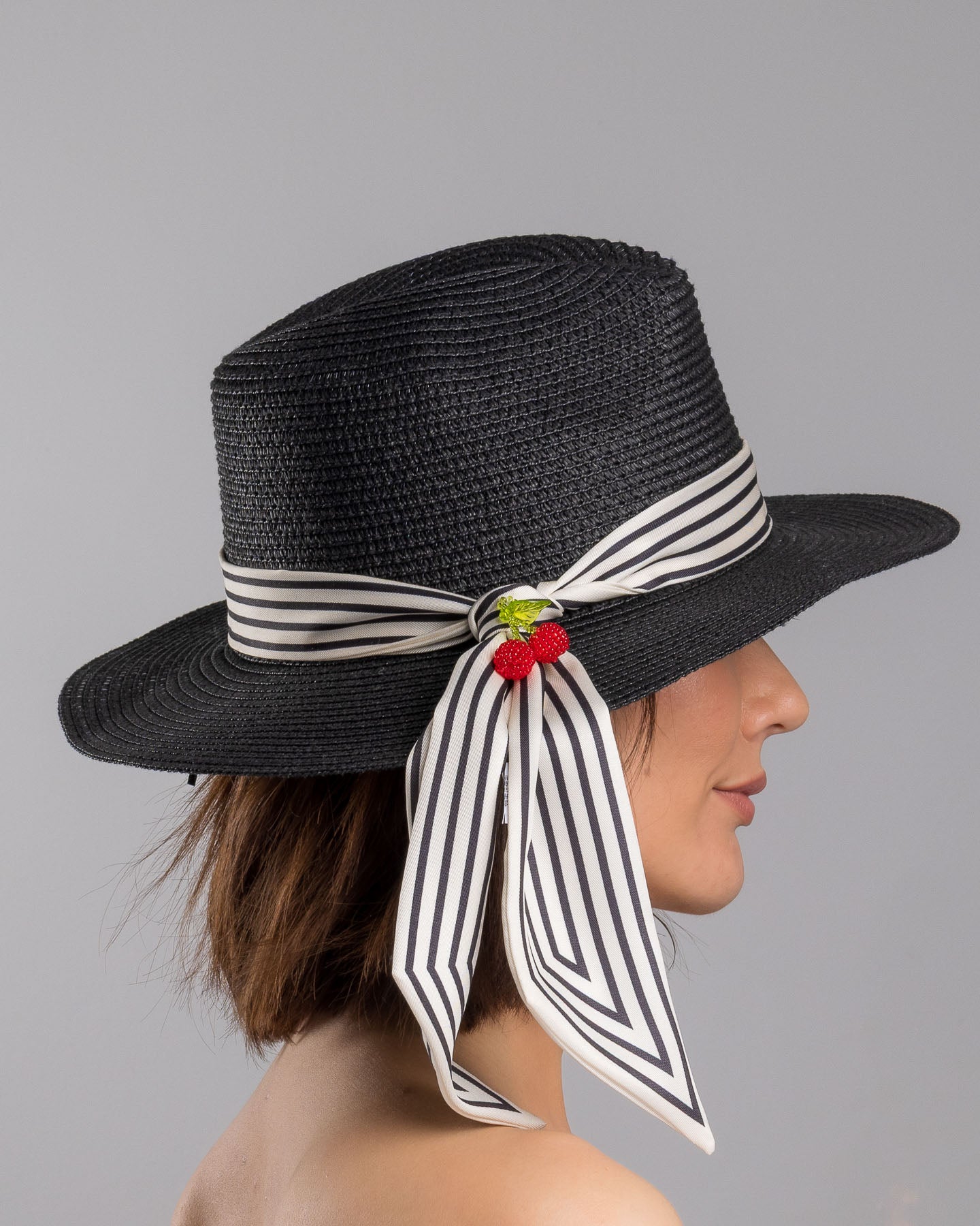 Onyxel is sharp with a sense of humor. The deep black straw gives it authority, clean and structured, while the striped silk band softens the mood with movement. Then come the cherries. Bright, glossy, slightly unexpected. A small detail that changes everything.