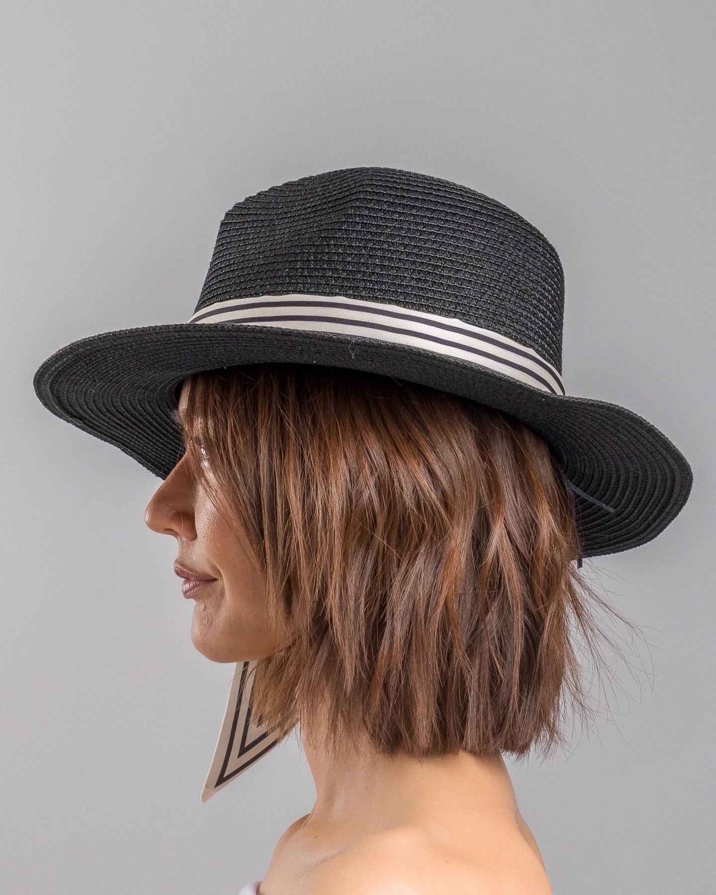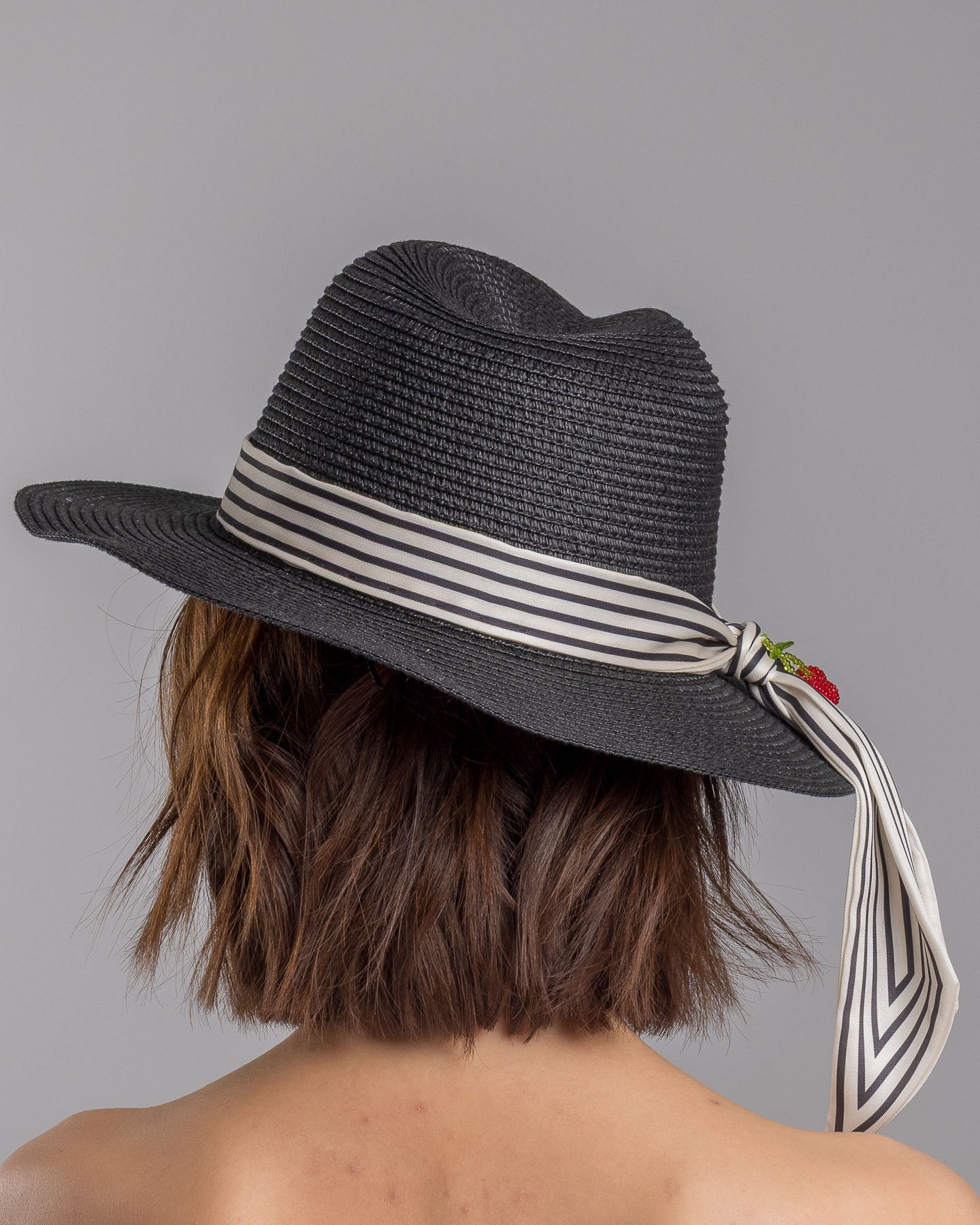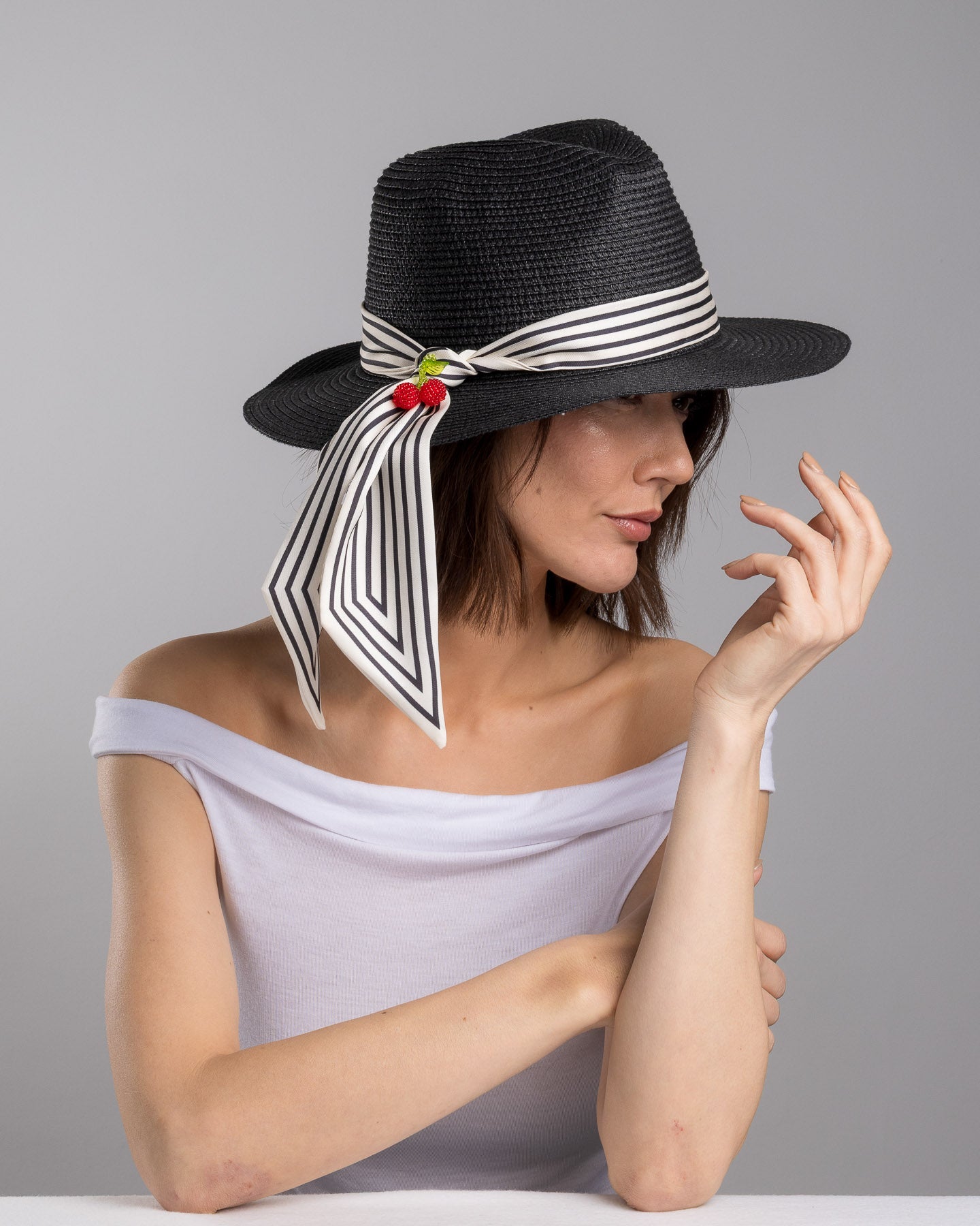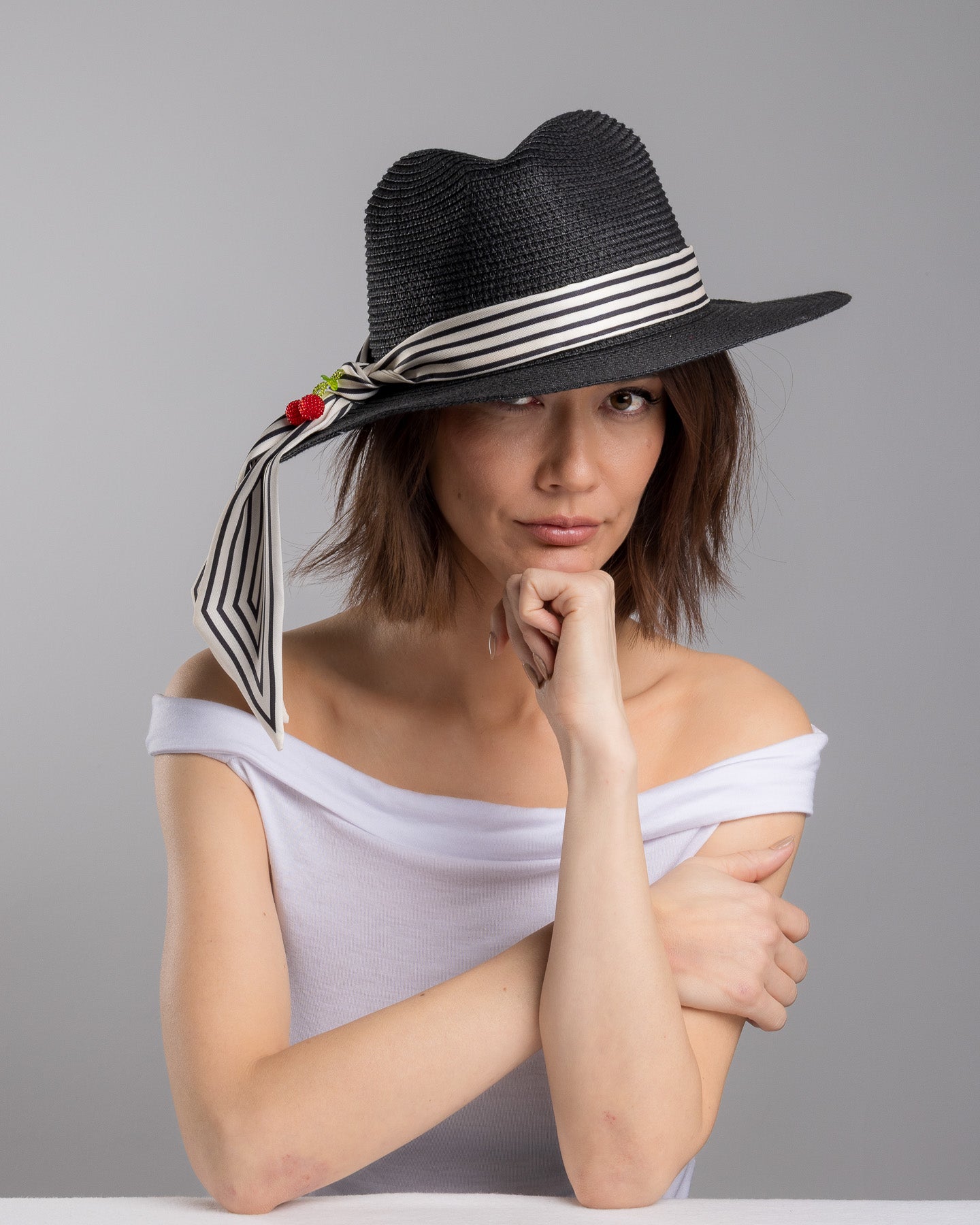 Onyxel is sharp with a sense of humor. The deep black straw gives it authority, clean and structured, while the striped silk band softens the mood with movement. Then come the cherries. Bright, glossy, slightly unexpected. A small detail that changes everything.
