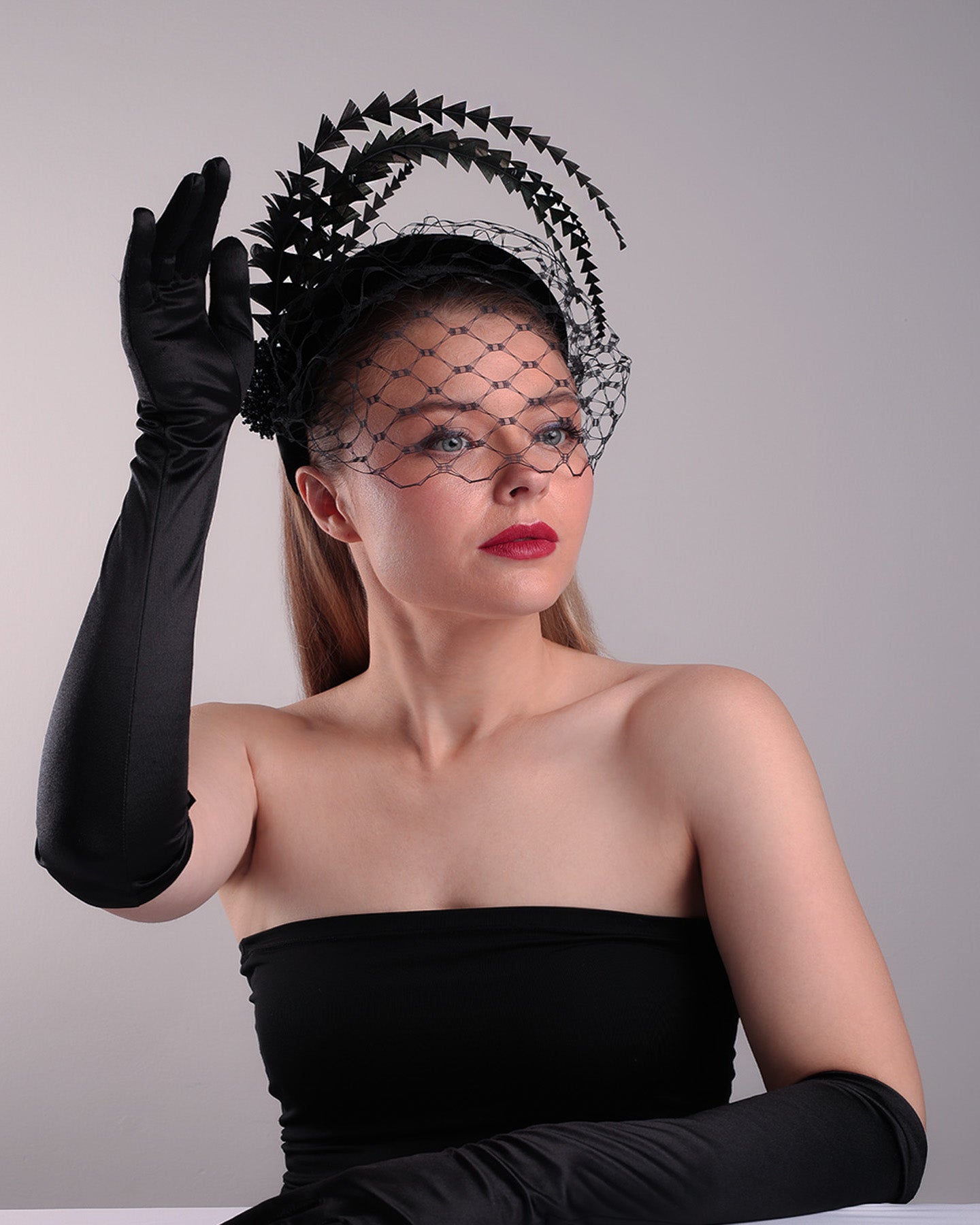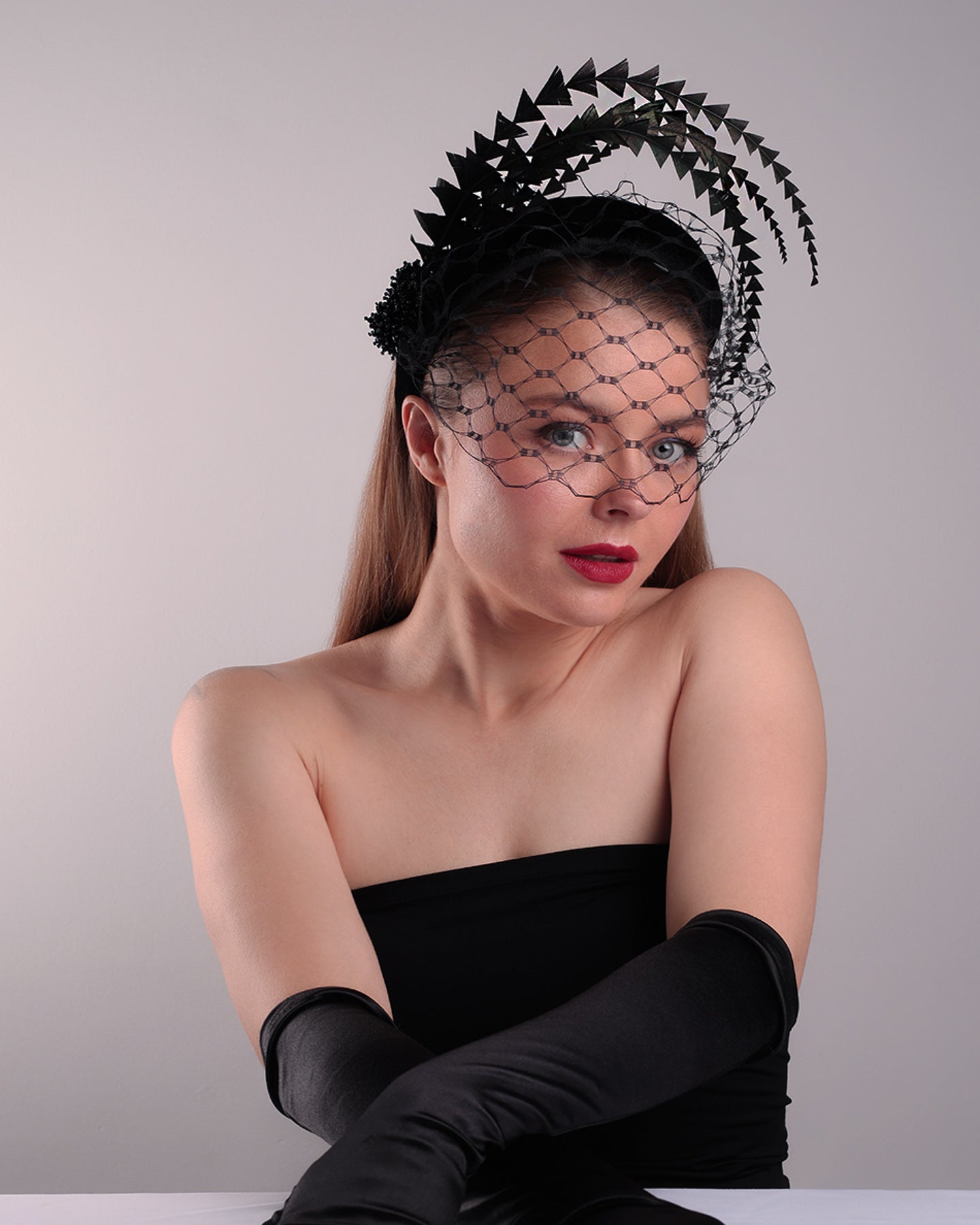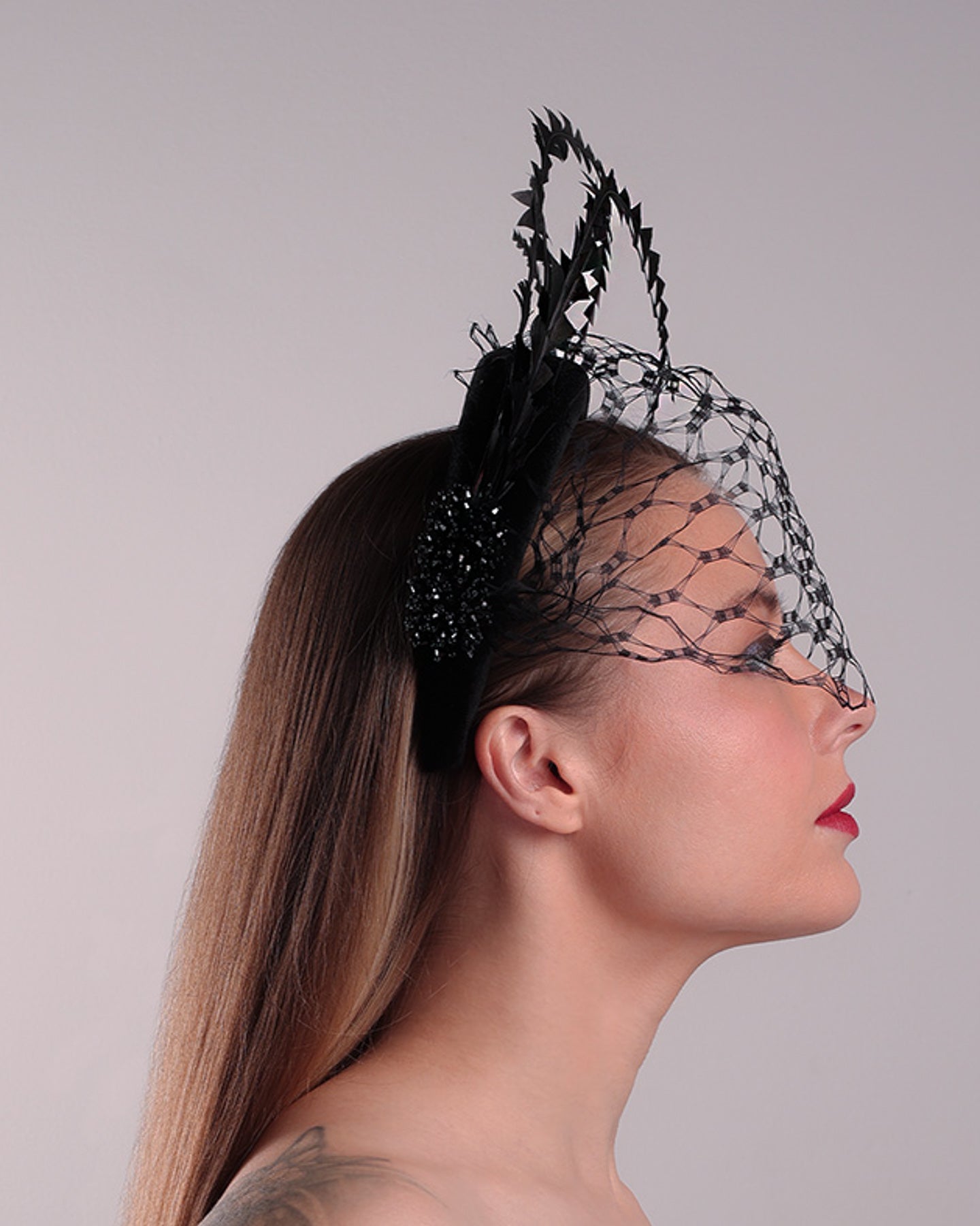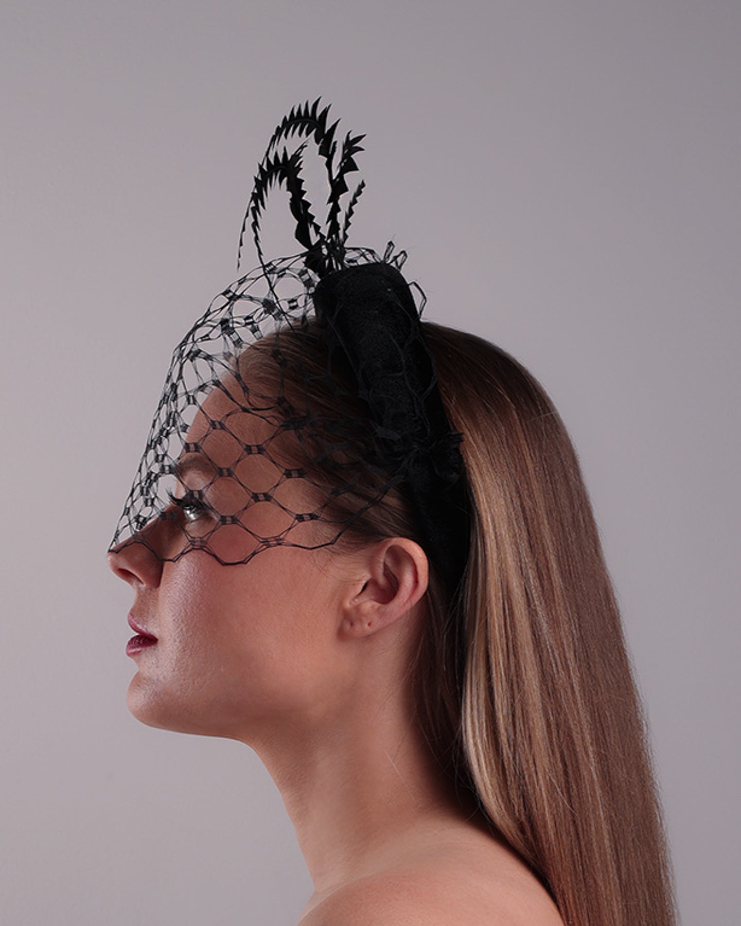 Description: The black high headband is decorated with widdow style veil, adorned with custom trimmed black rooster feathers curving on top of the headband. The end of the feathers is embellished with black crystal cluster where they meet with the headband.