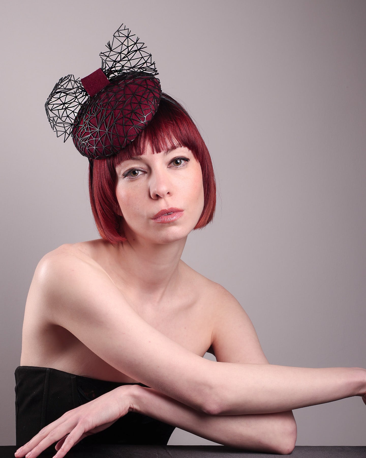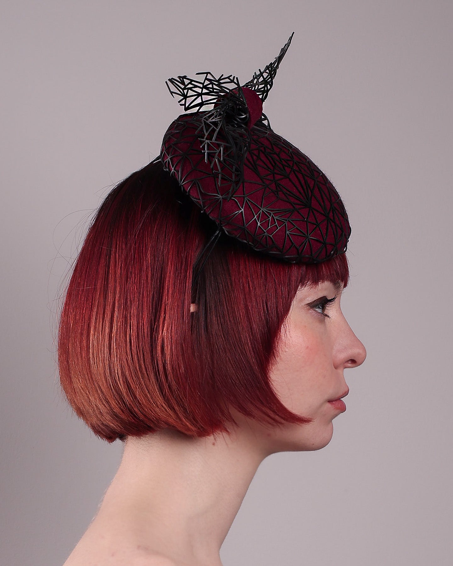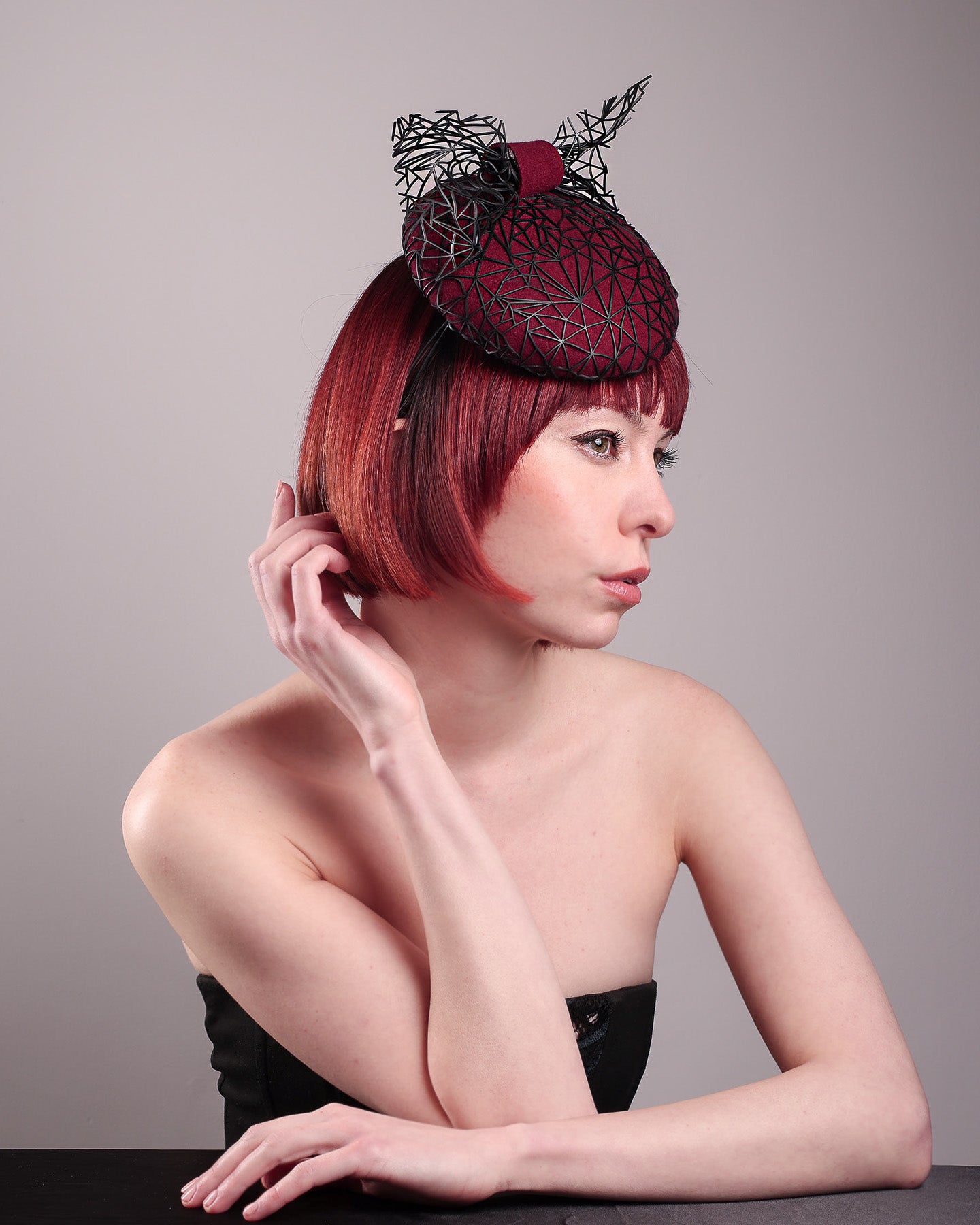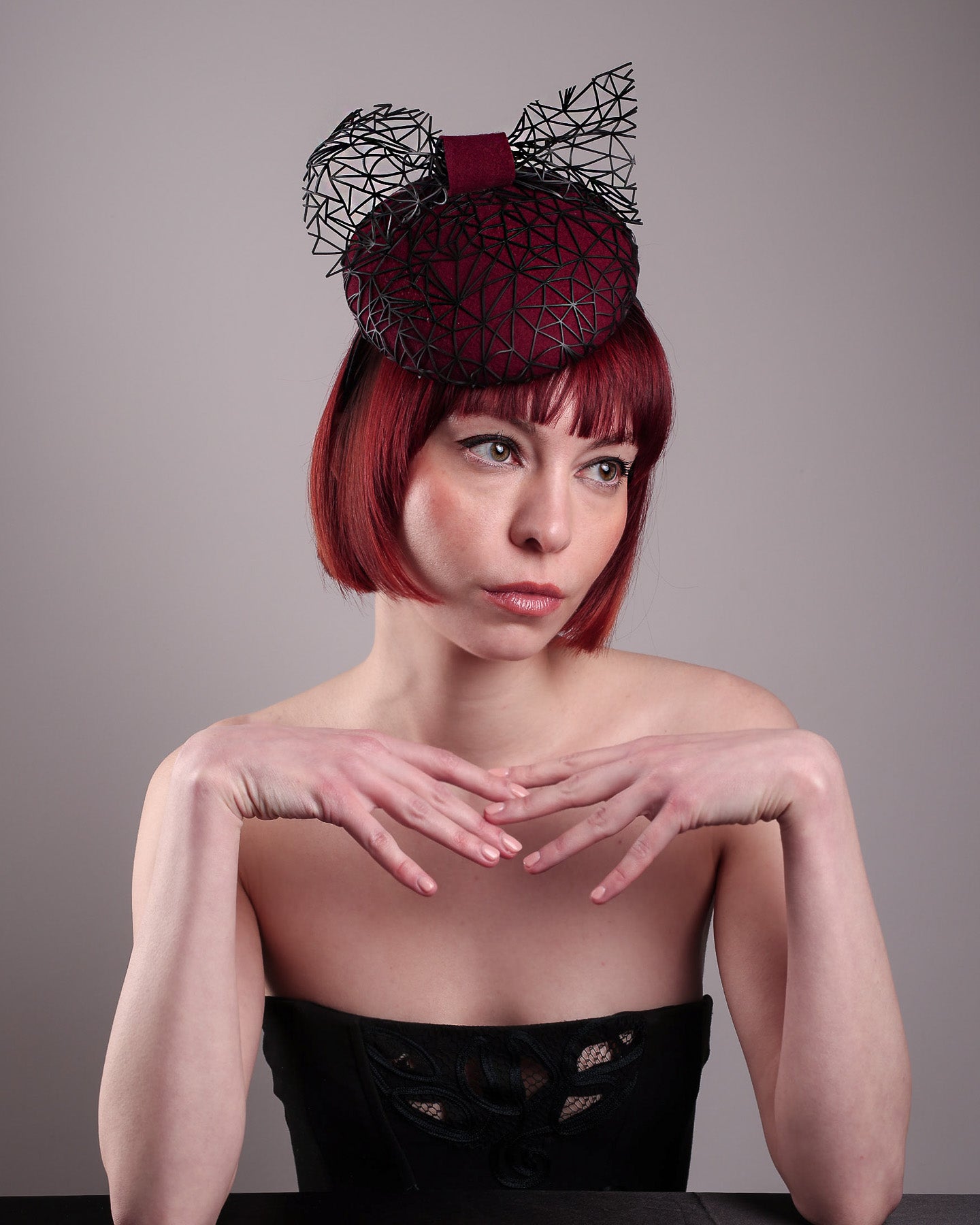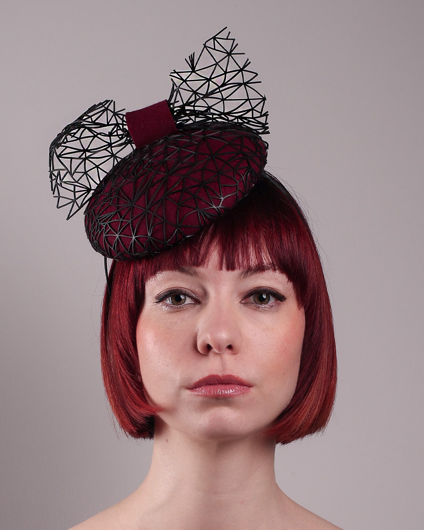 Commanding and contemporary, Bijoue redefines the classic pillbox with a geometric twist. Crafted in a rich burgundy felt, its structured base is overlaid with an angular black netting design and crowned with an architectural bow that fuses avant-garde with elegance.