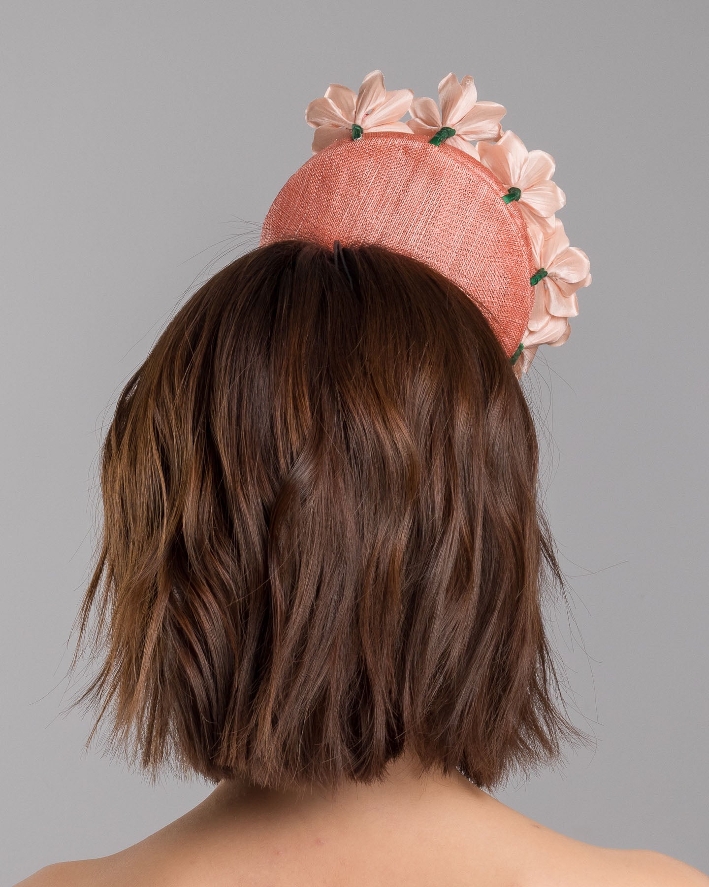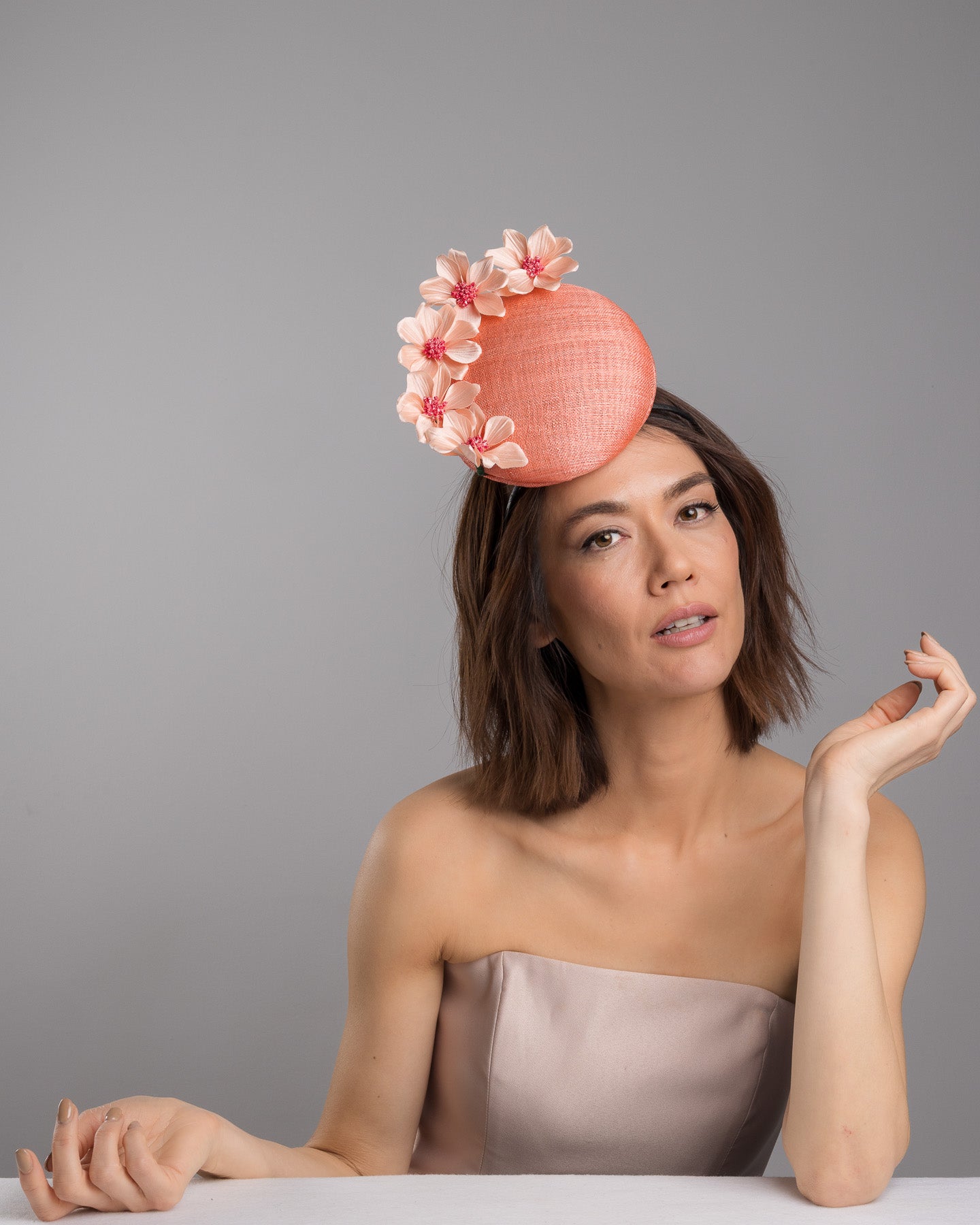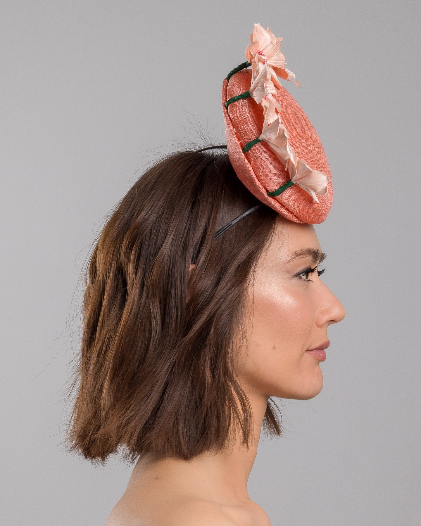 The double button style coral fascinator hat is suitable for Royal Ascot including Royal Enclosure & Kentucky Derby as well as weddings.