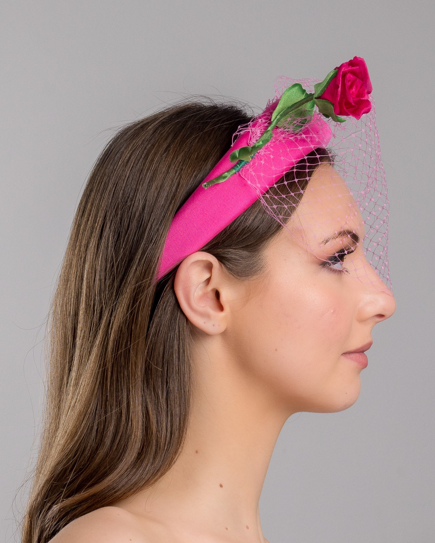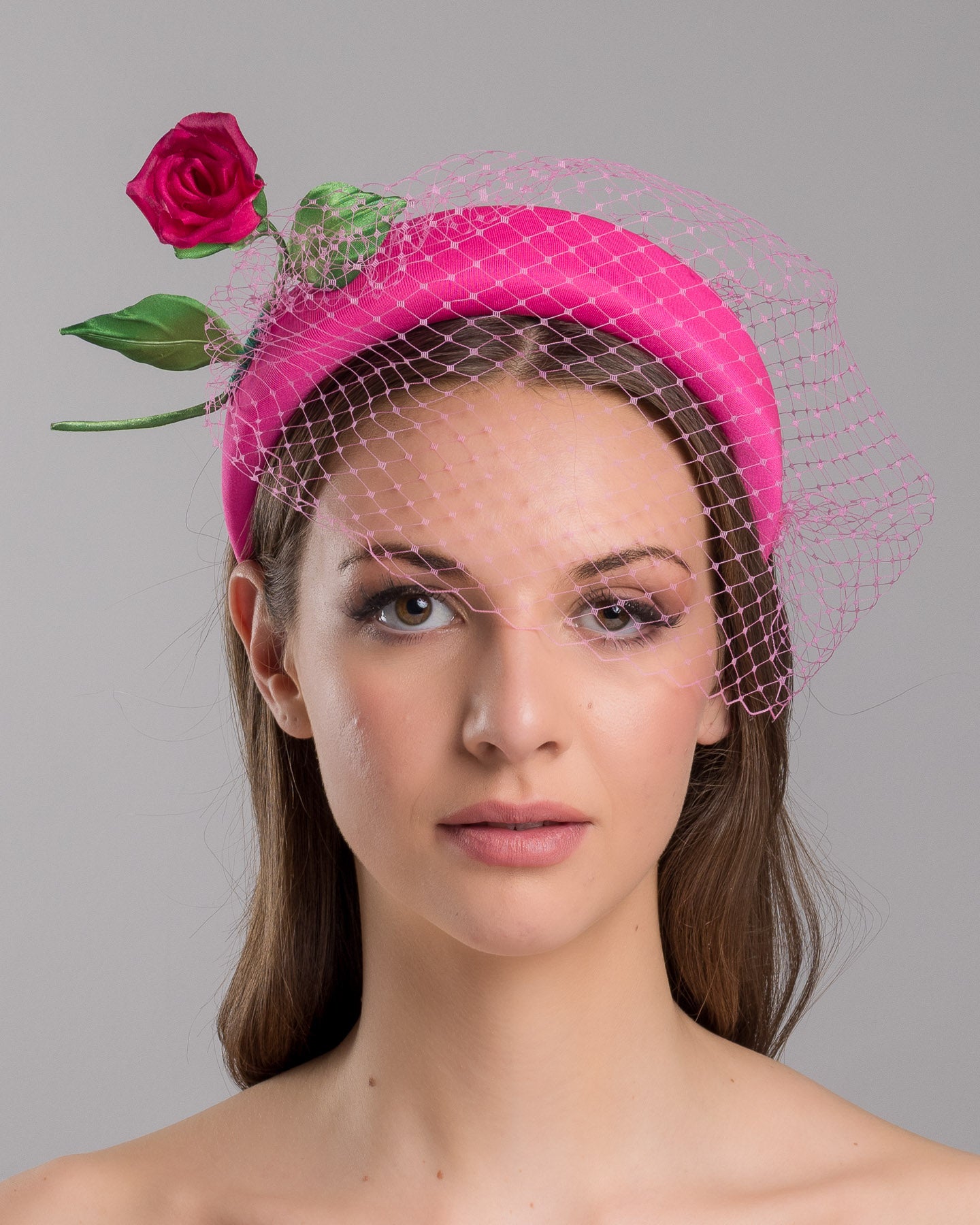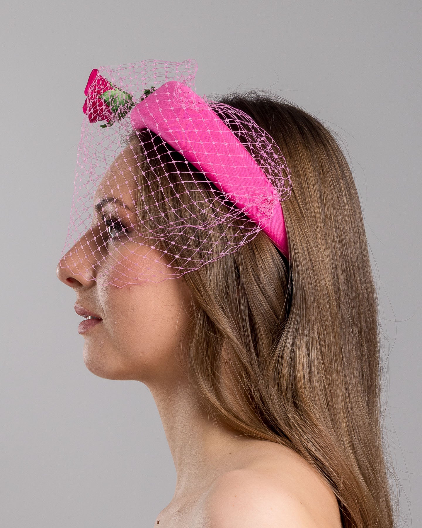 The pink fascinator headband with veil and pink rose is perfect for garden events and weddings.