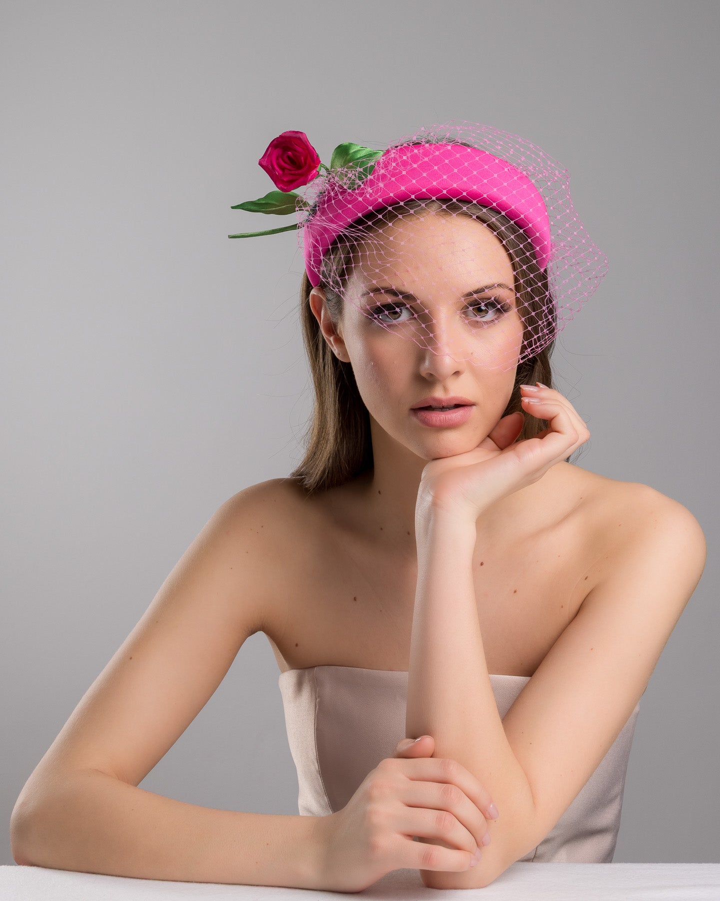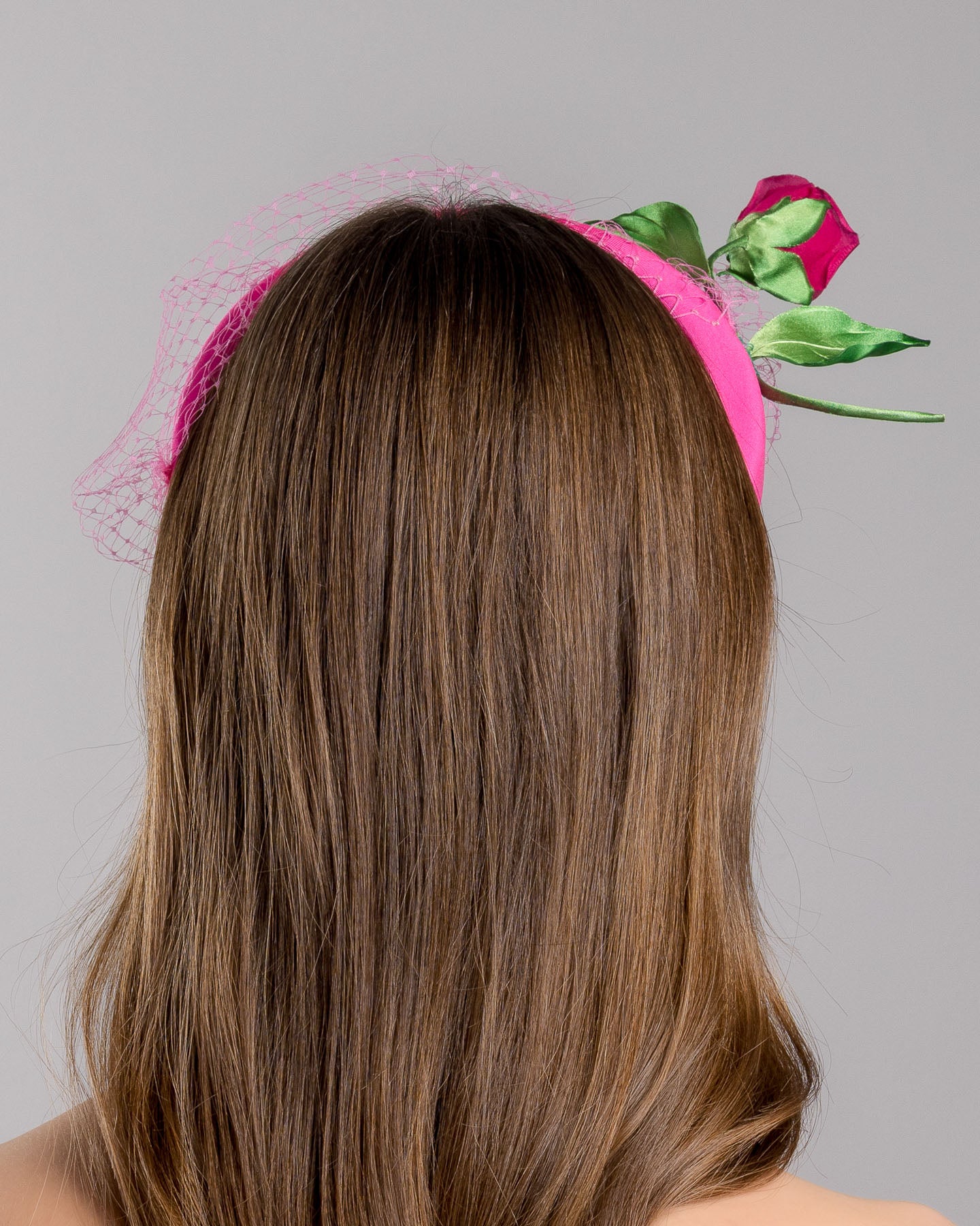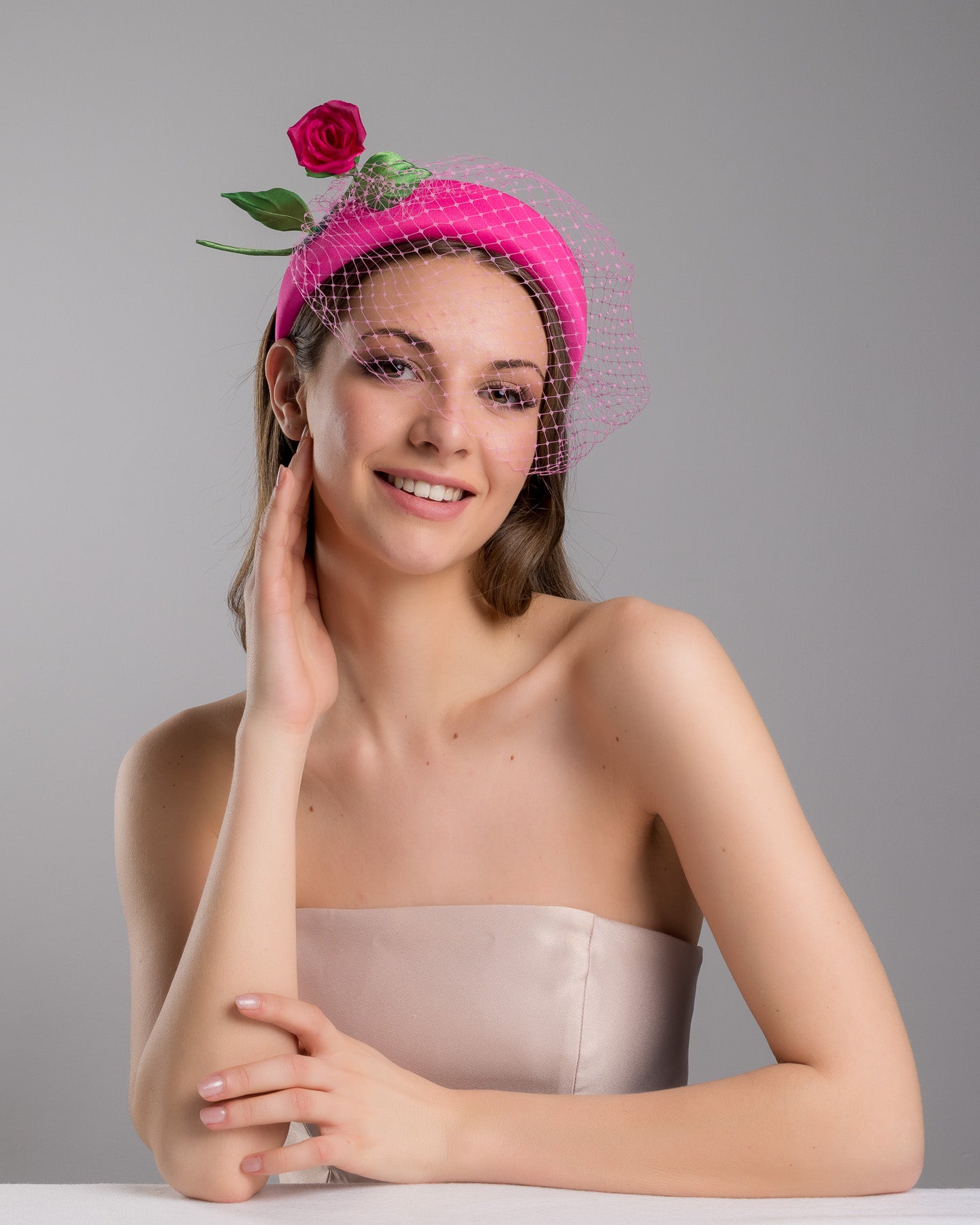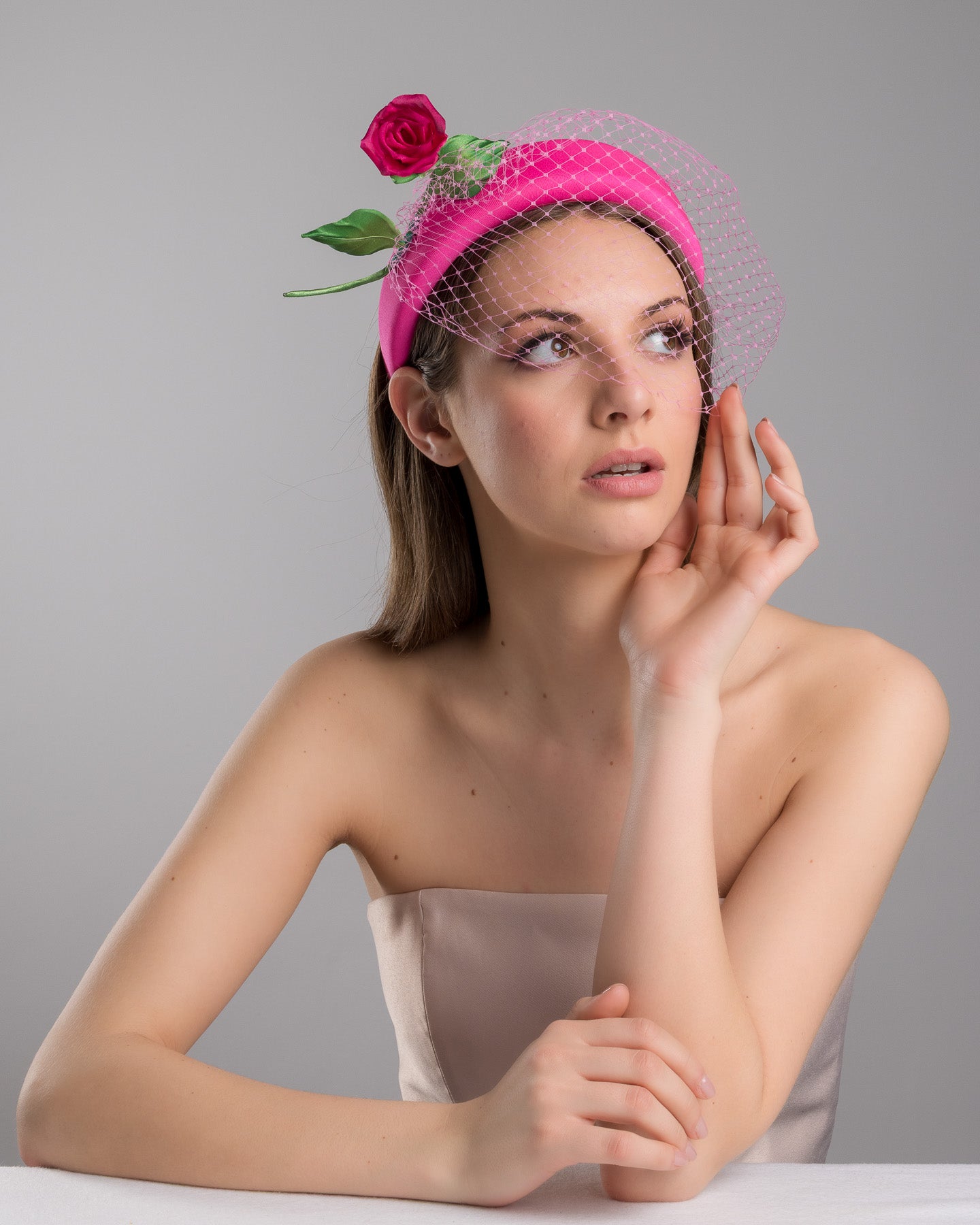 The pink fascinator headband with veil and pink rose is perfect for garden events and weddings.