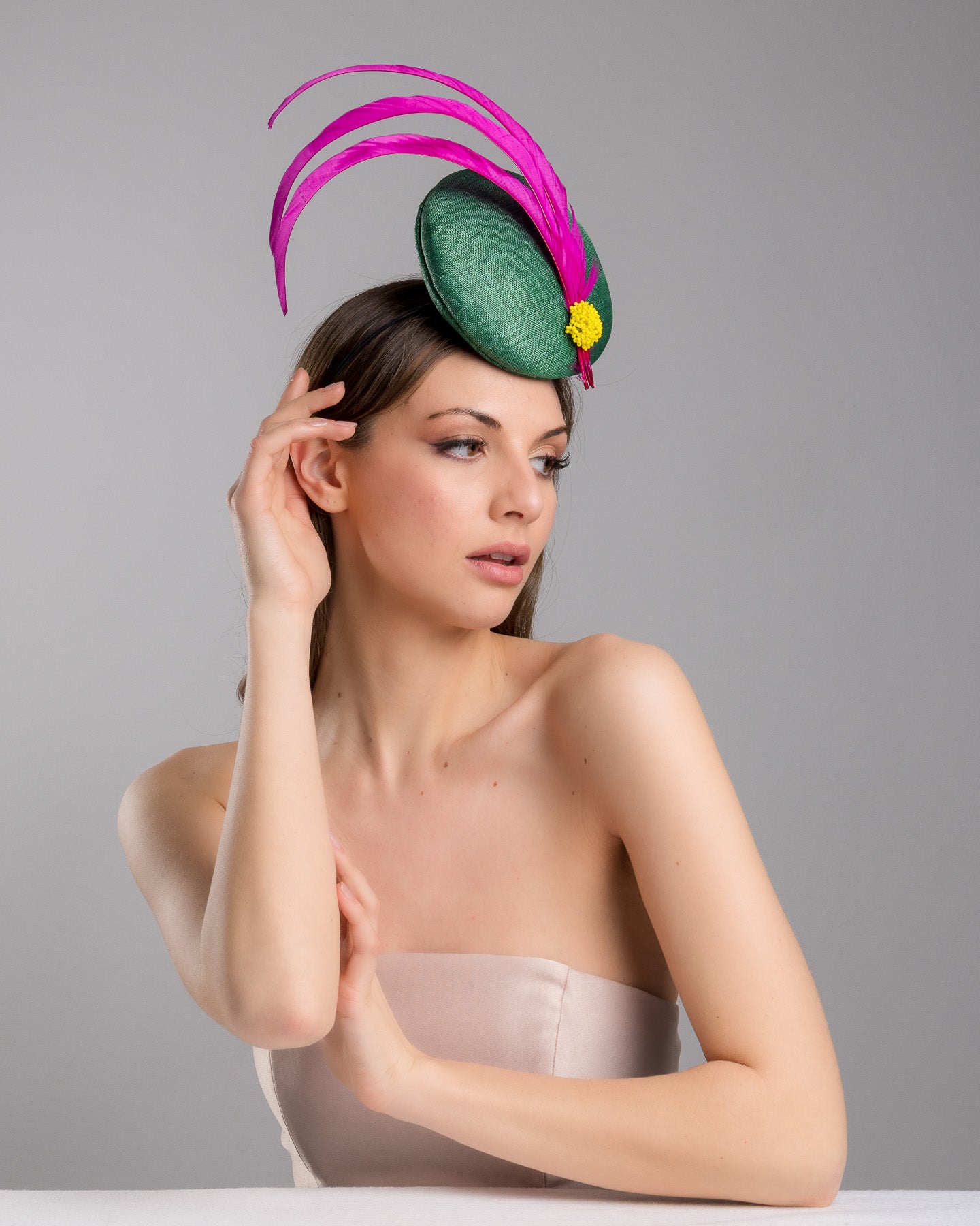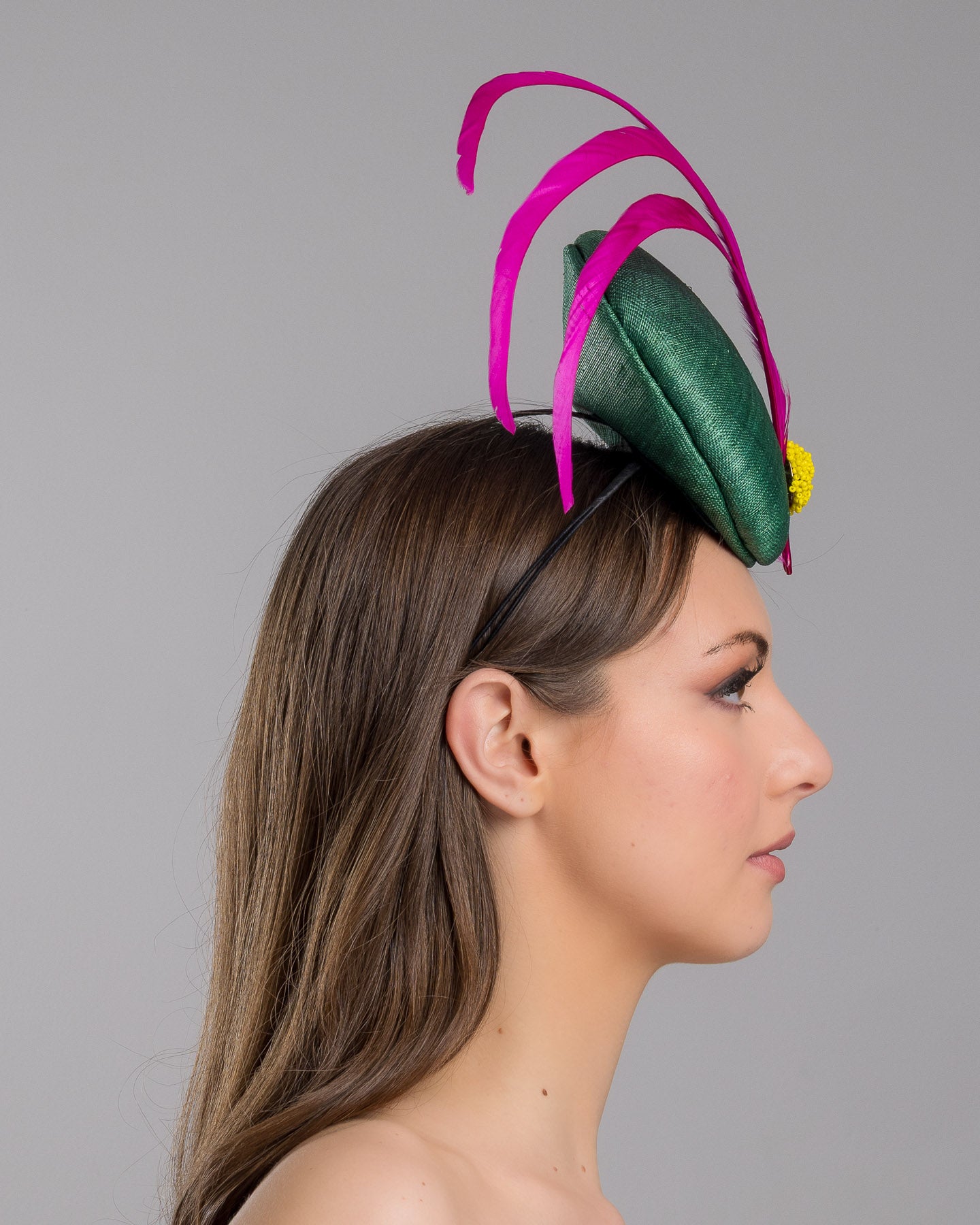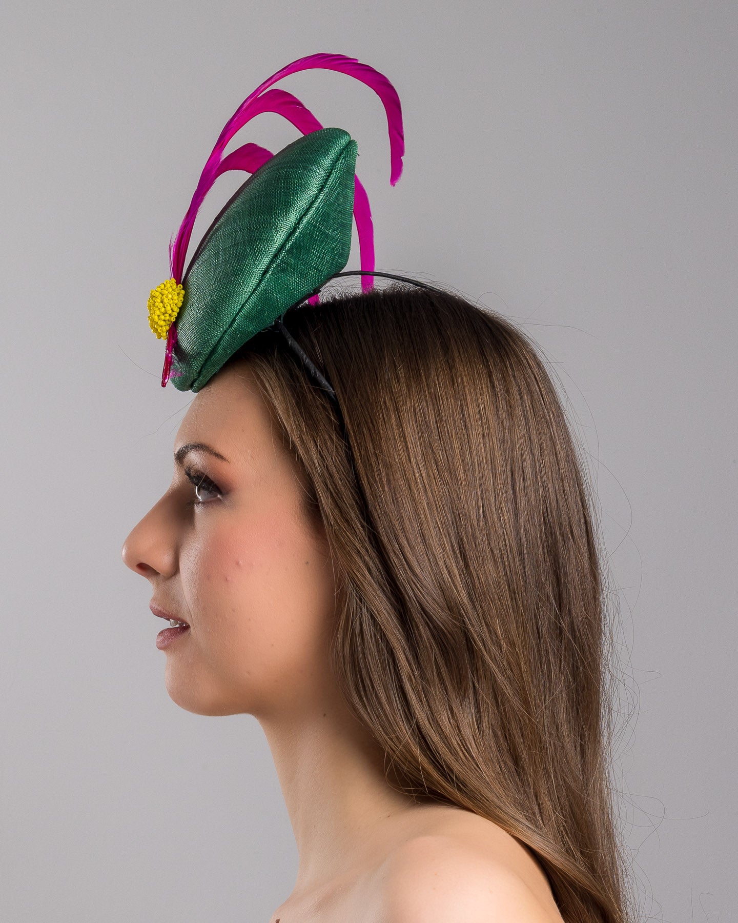 Description: Forest green high button fascinator that is adorned with hot pink feathers and rounded yellow beads.