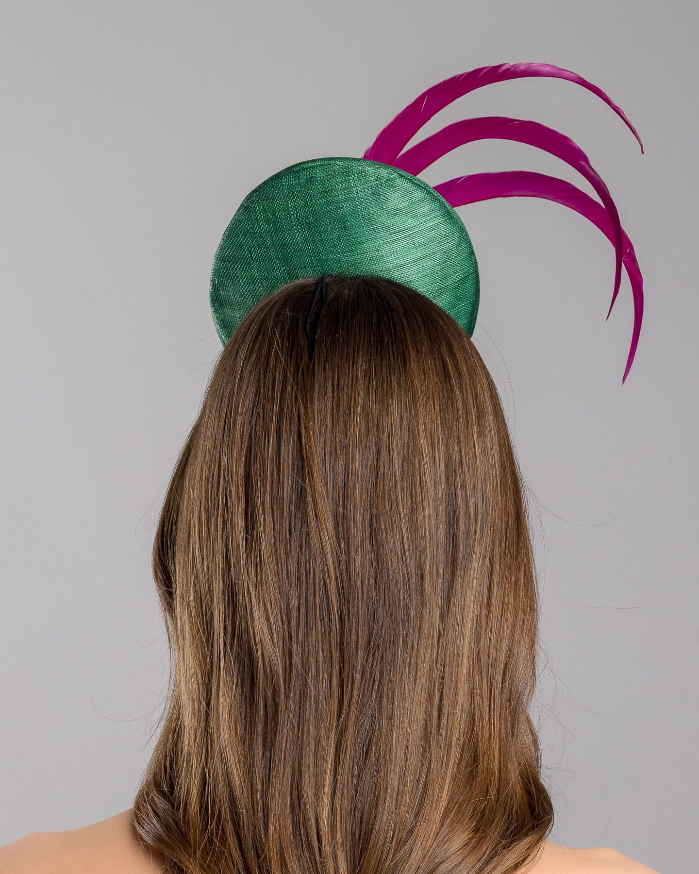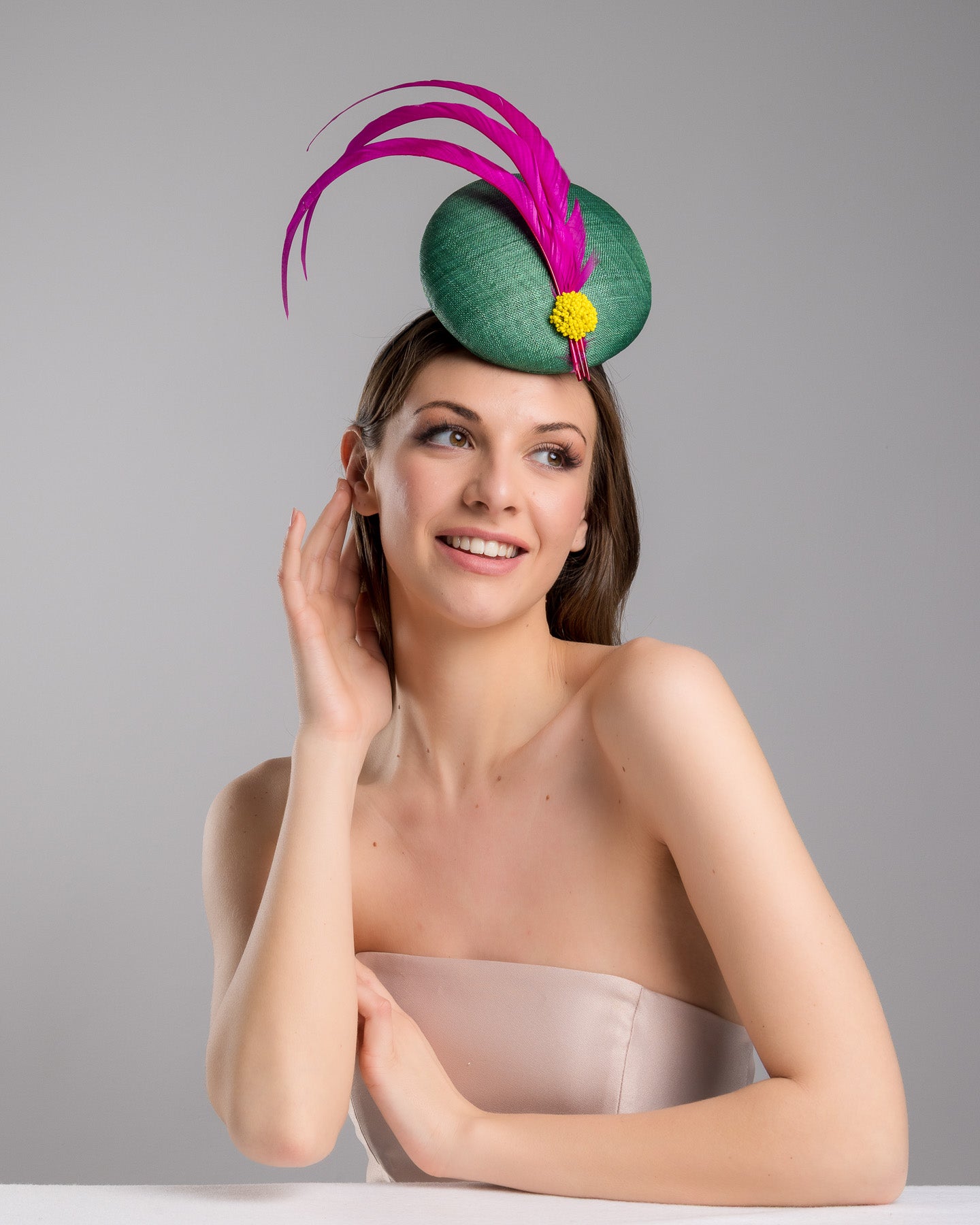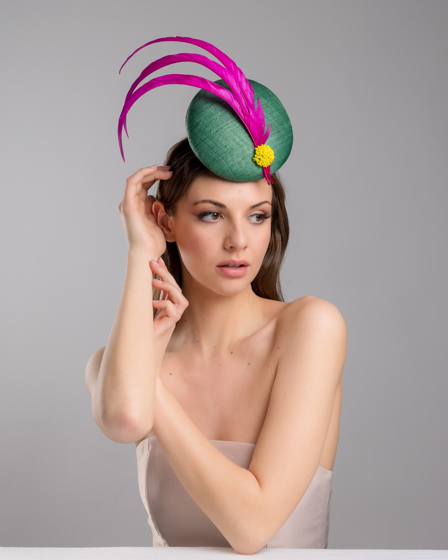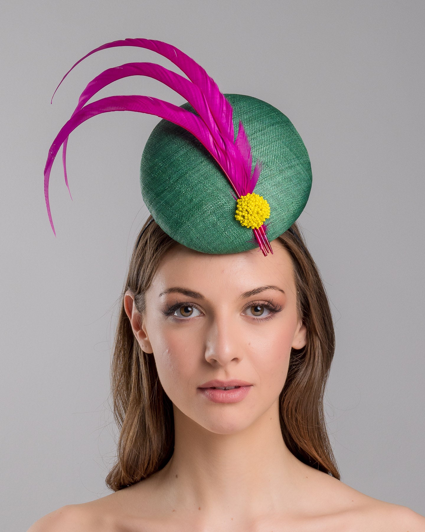 Description: Forest green high button fascinator that is adorned with hot pink feathers and rounded yellow beads.
