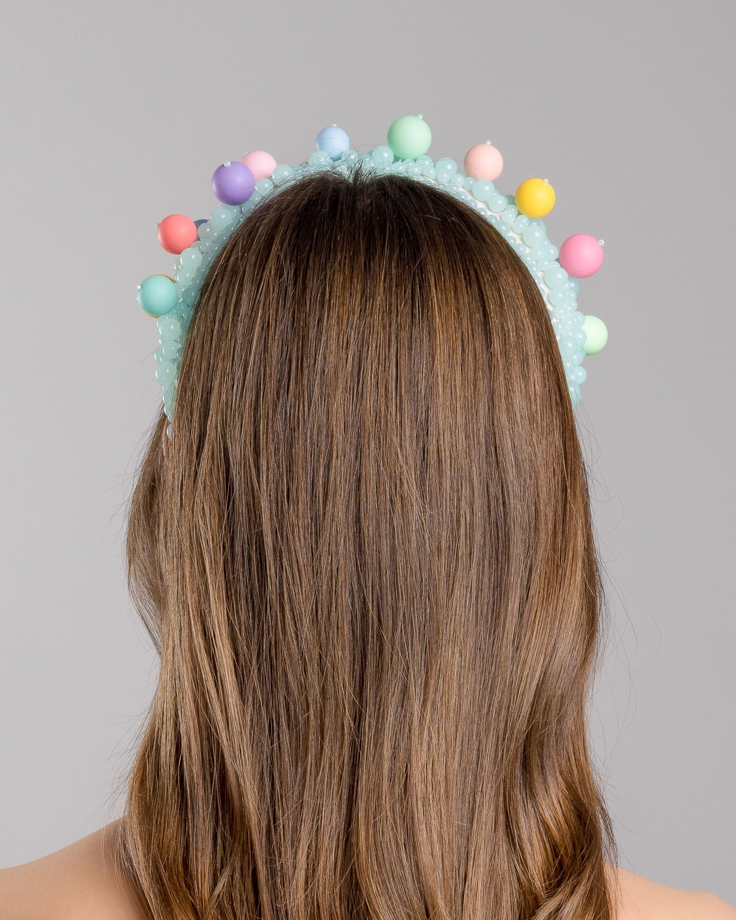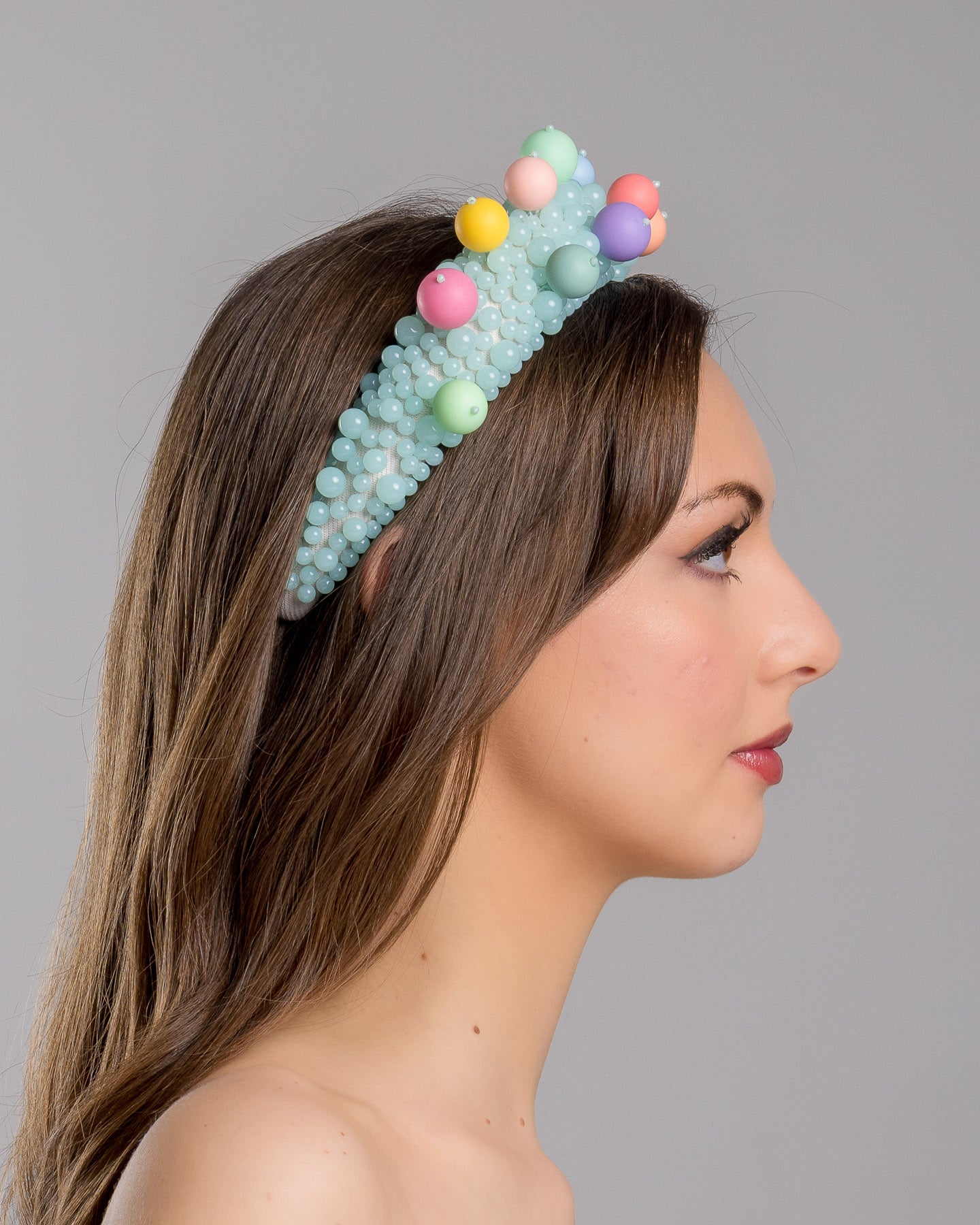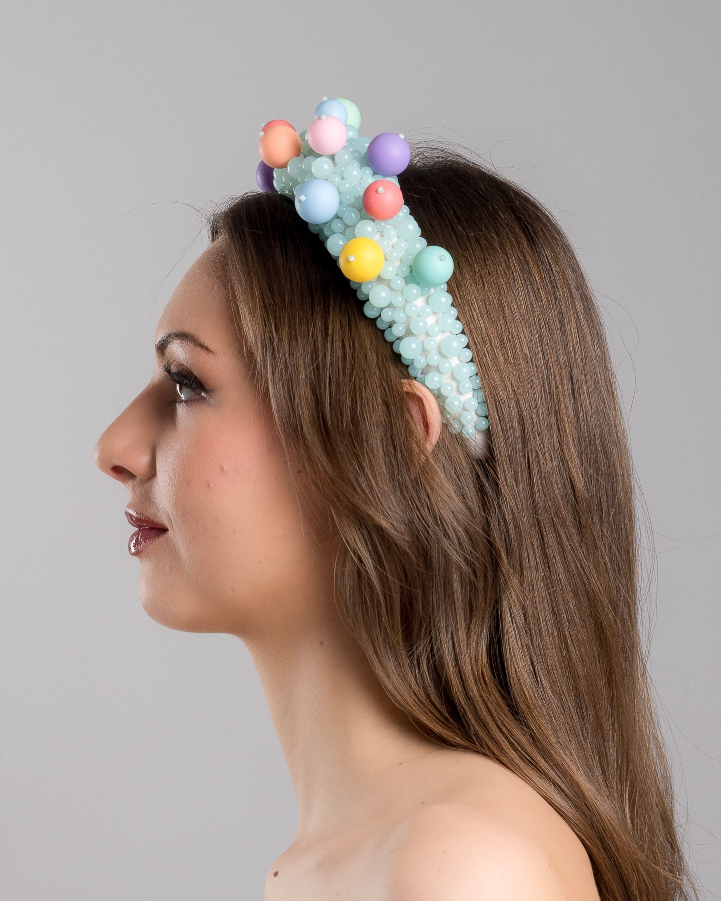Mint is a vibrant and playful headband adorned with a delightful array of pastel-coloured beads. The headband's base is covered in mint-coloured beads, providing a soft and elegant backdrop. On top of this, larger spherical beads in various pastel hues, including lavender, mint green, pale yellow, baby blue, and soft pink, are strategically placed, creating a whimsical and eye-catching design.