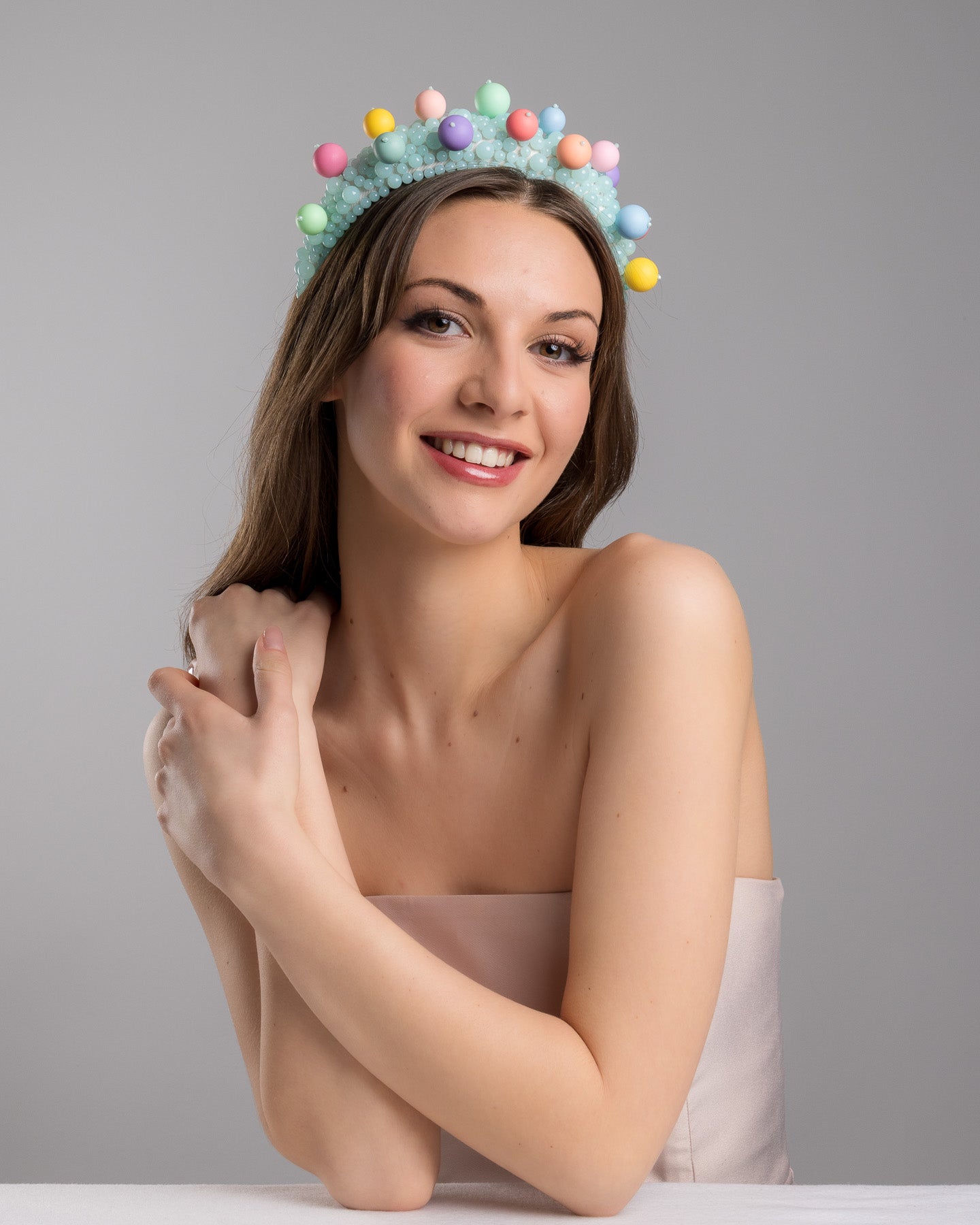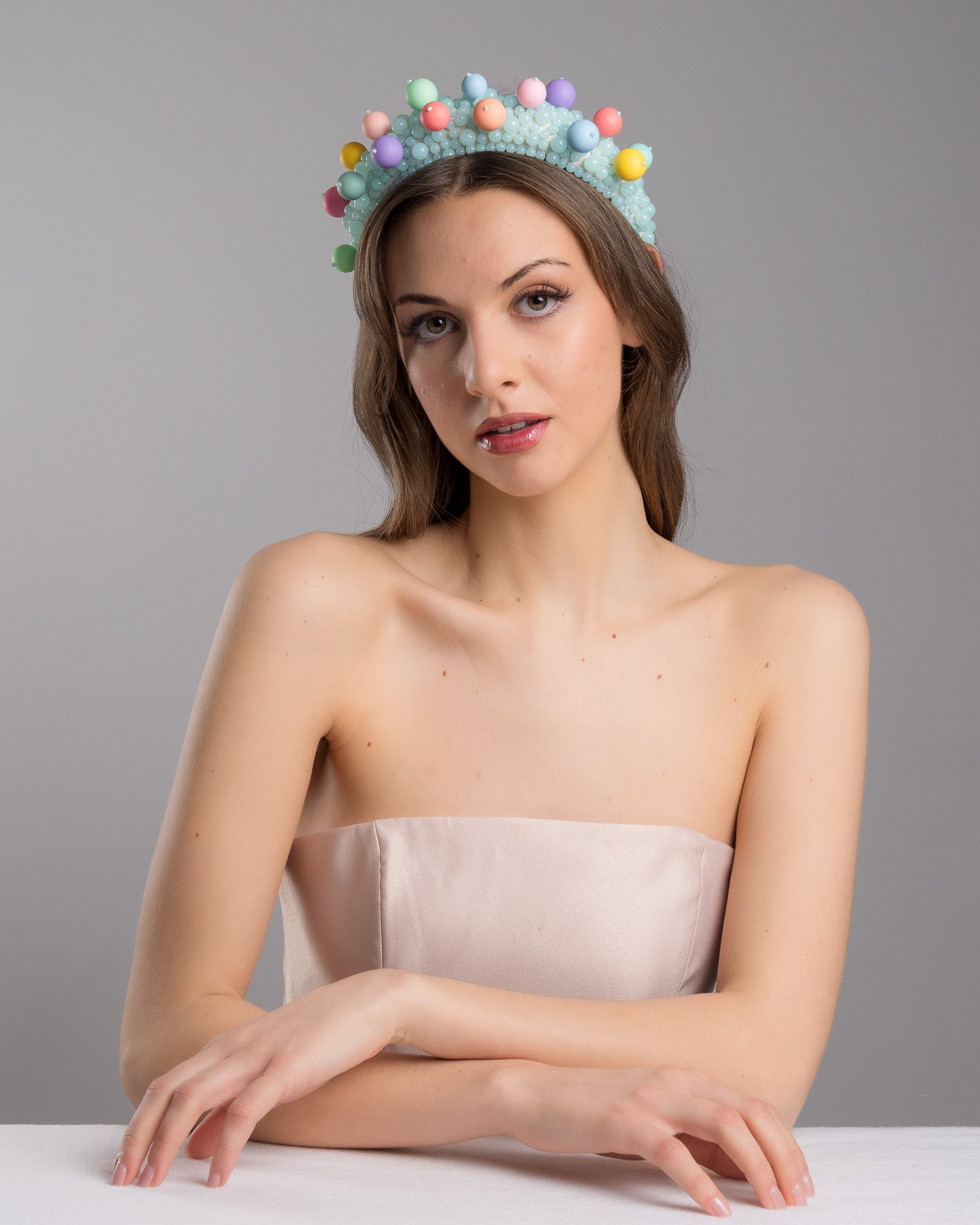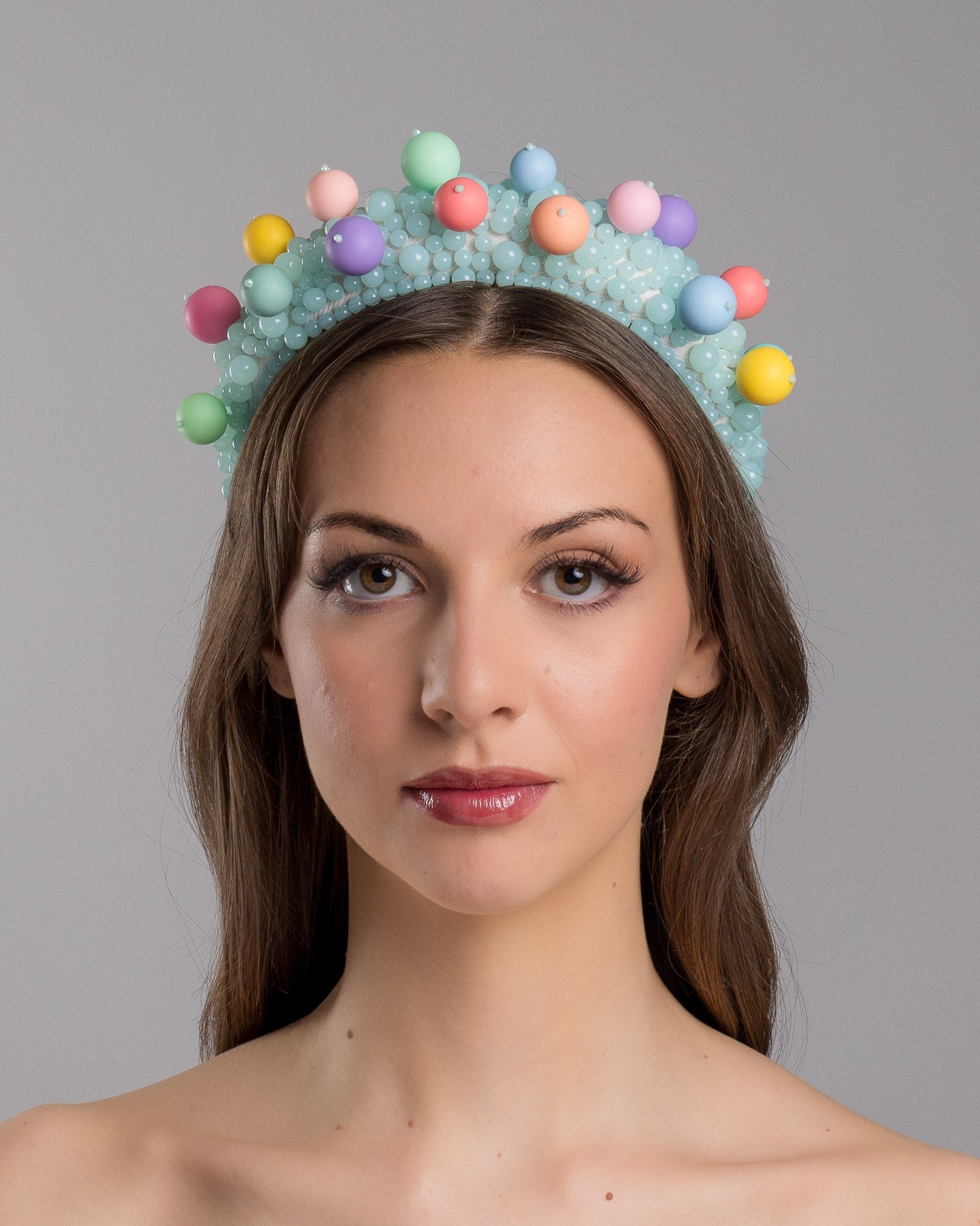 Mint is a vibrant and playful headband adorned with a delightful array of pastel-coloured beads. The headband's base is covered in mint-coloured beads, providing a soft and elegant backdrop. On top of this, larger spherical beads in various pastel hues, including lavender, mint green, pale yellow, baby blue, and soft pink, are strategically placed, creating a whimsical and eye-catching design.