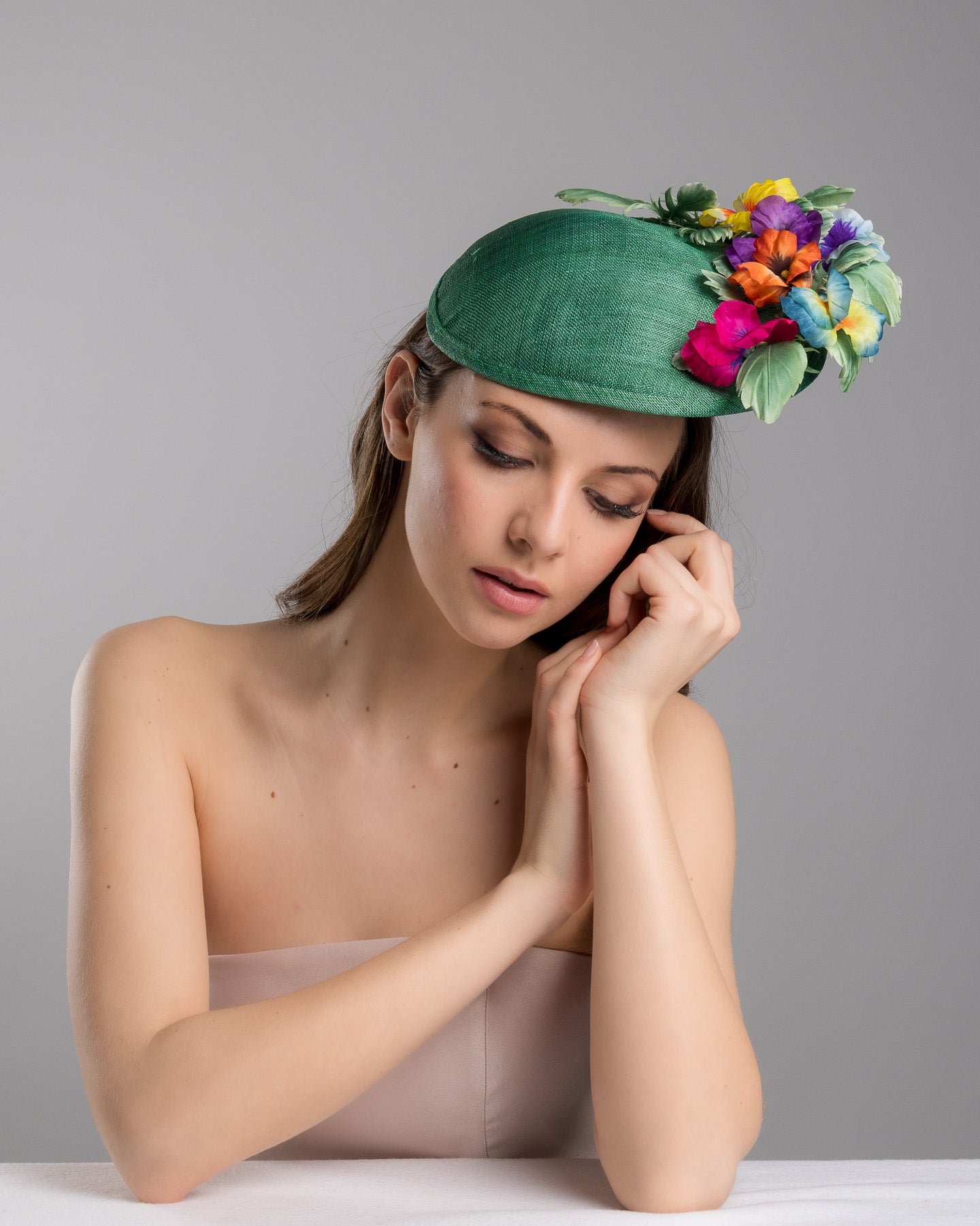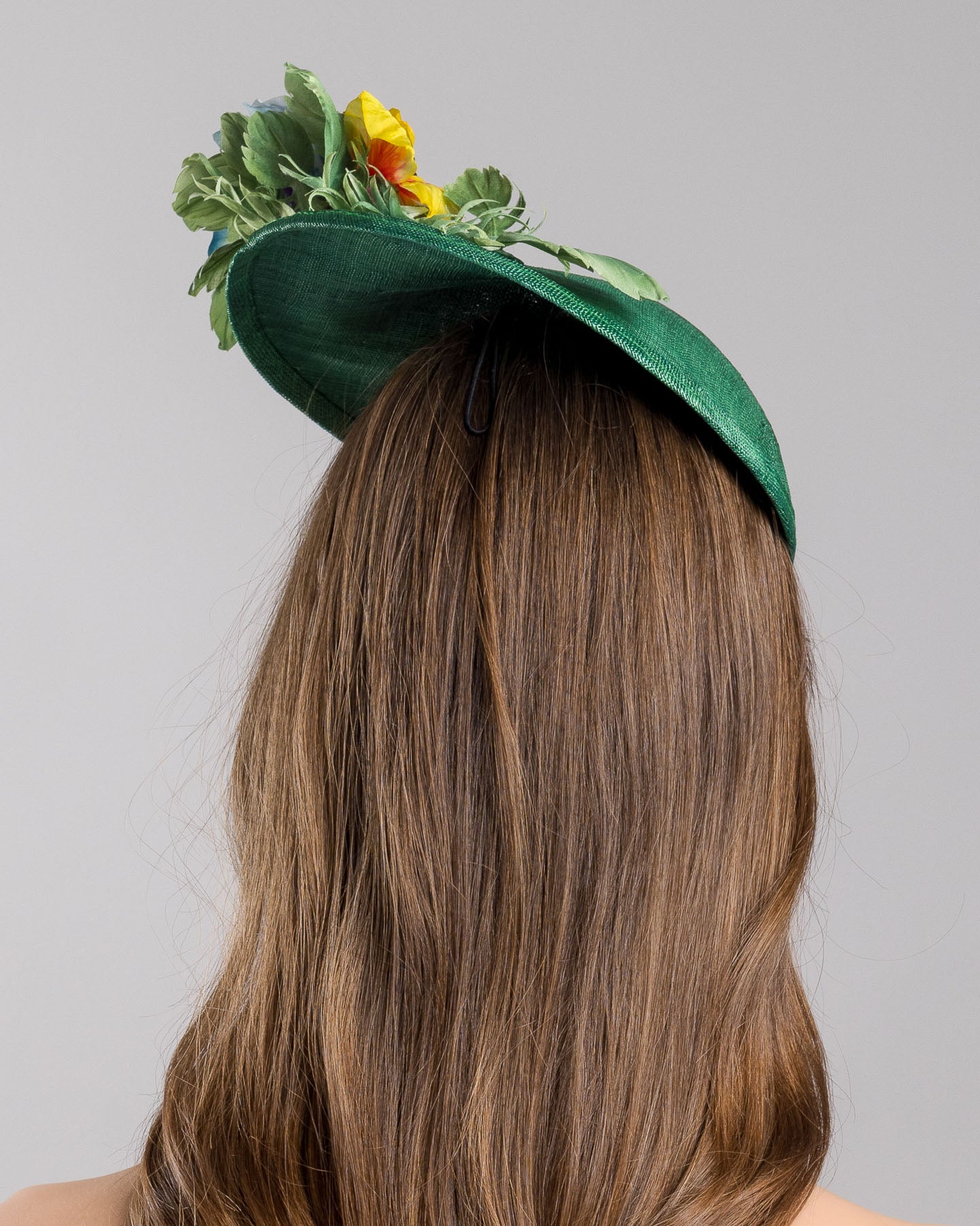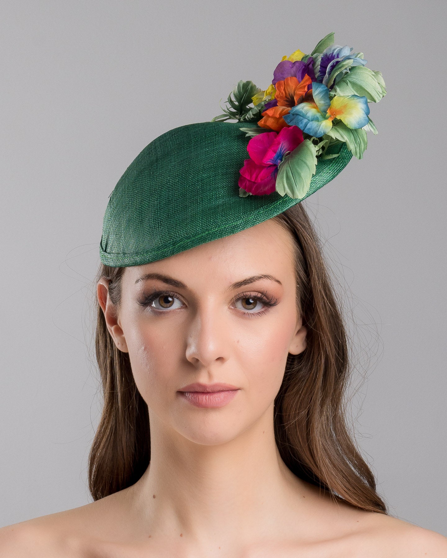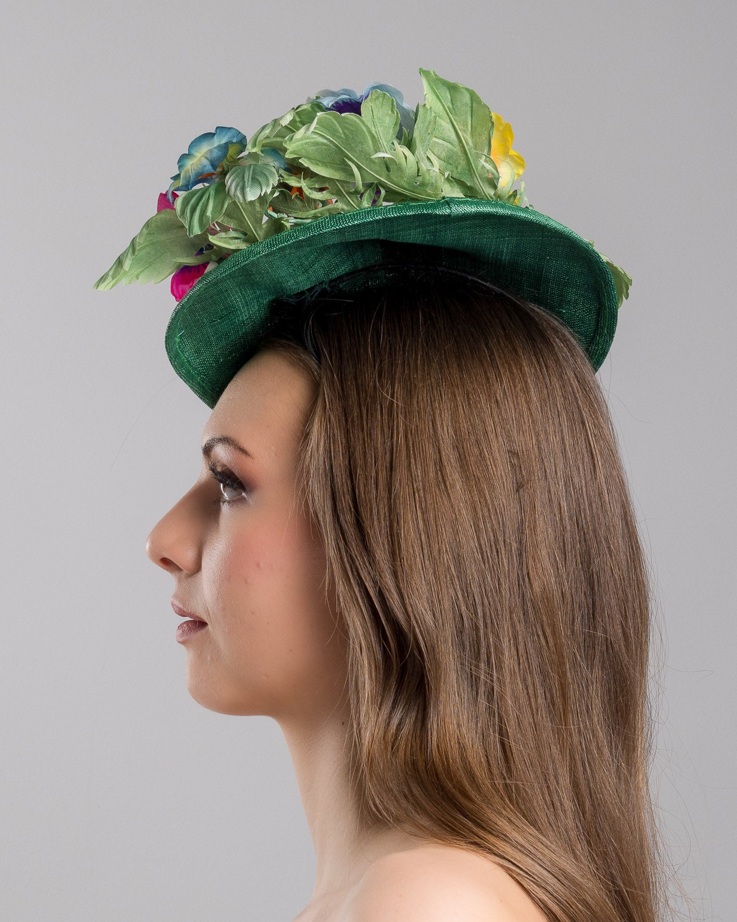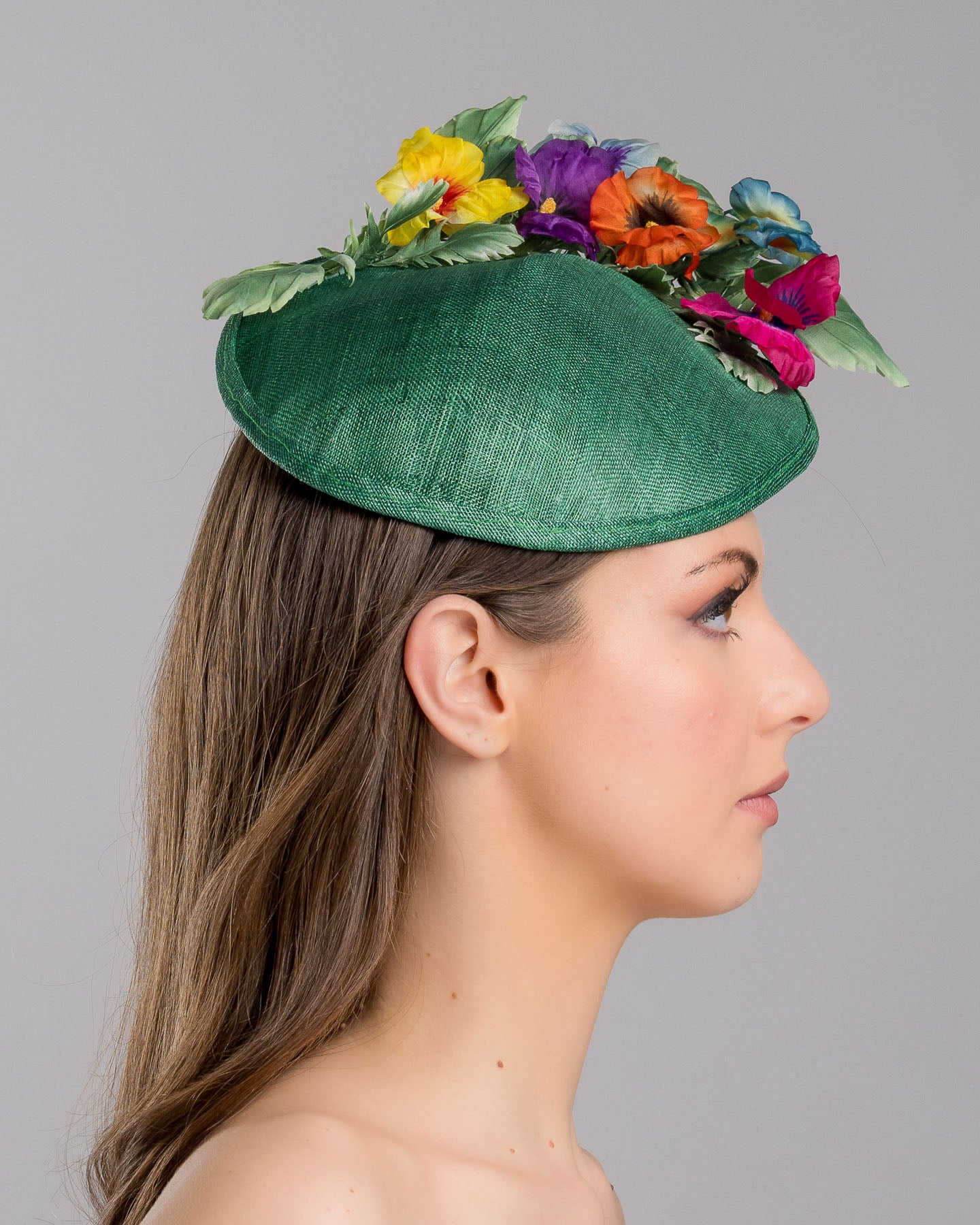 Description: Peyton is a small, asymmetric emerald green floral saucer hat decorated with multi colored violets on the left.