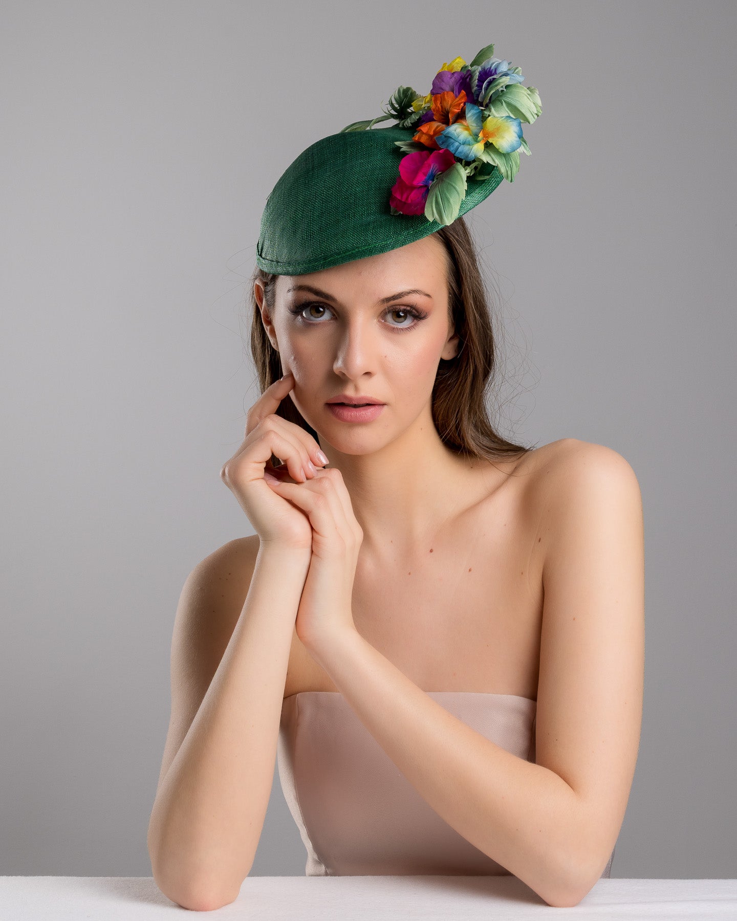 The Peyton hat is an elegant and vibrant piece that captures the essence of spring and summer with its rich green base and colourful floral embellishments. The base is crafted from fine green sinamay fabric. The emerald green hat's shape is a unique saucer designed to sit elegantly at an angle on the head.