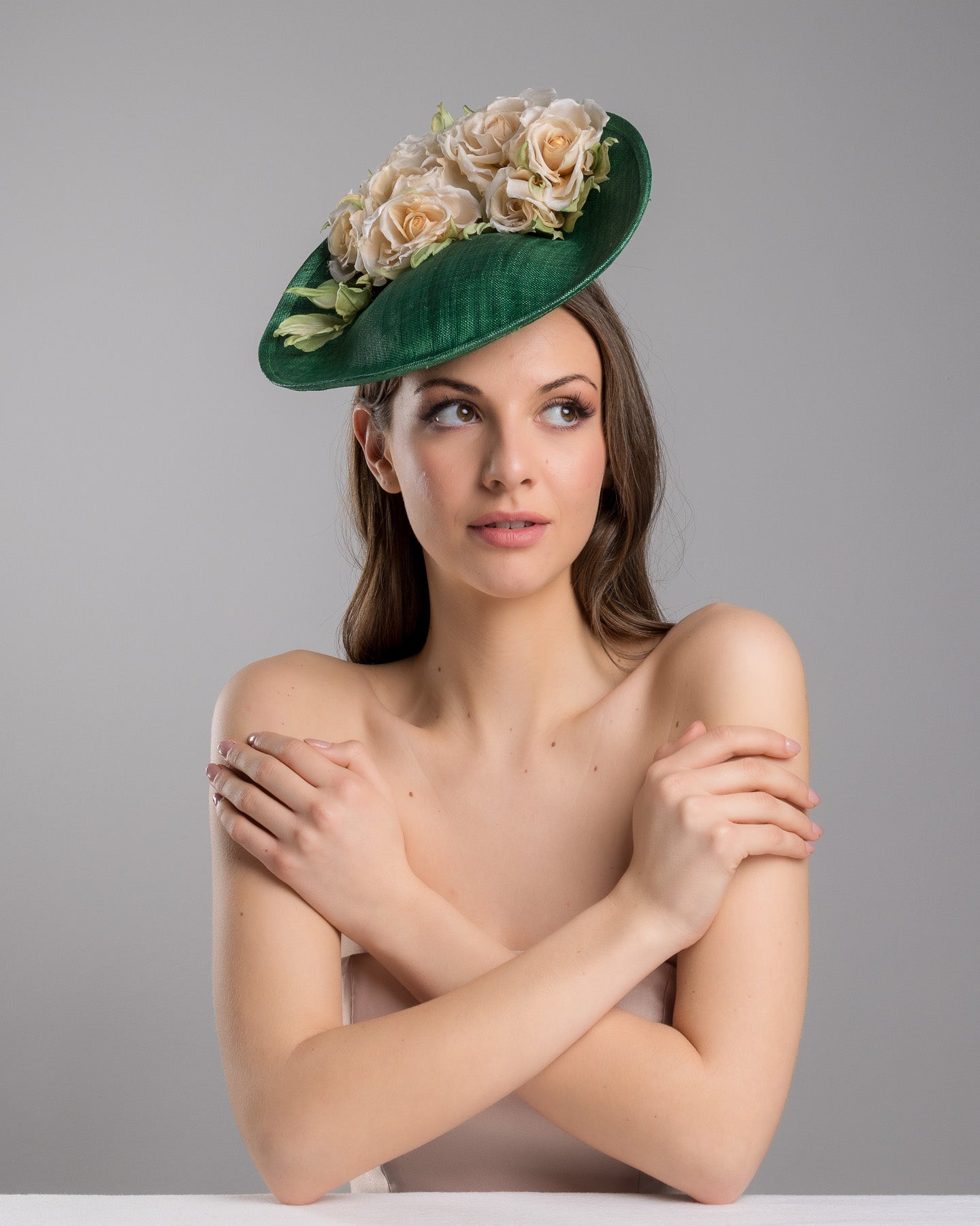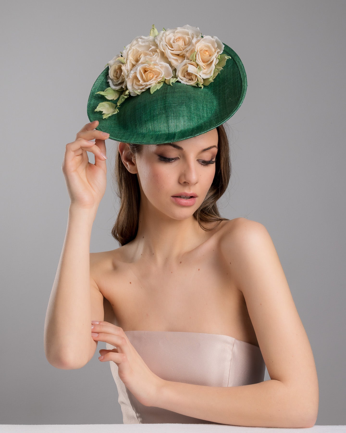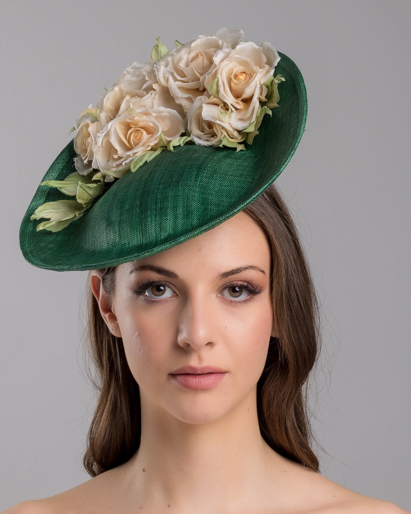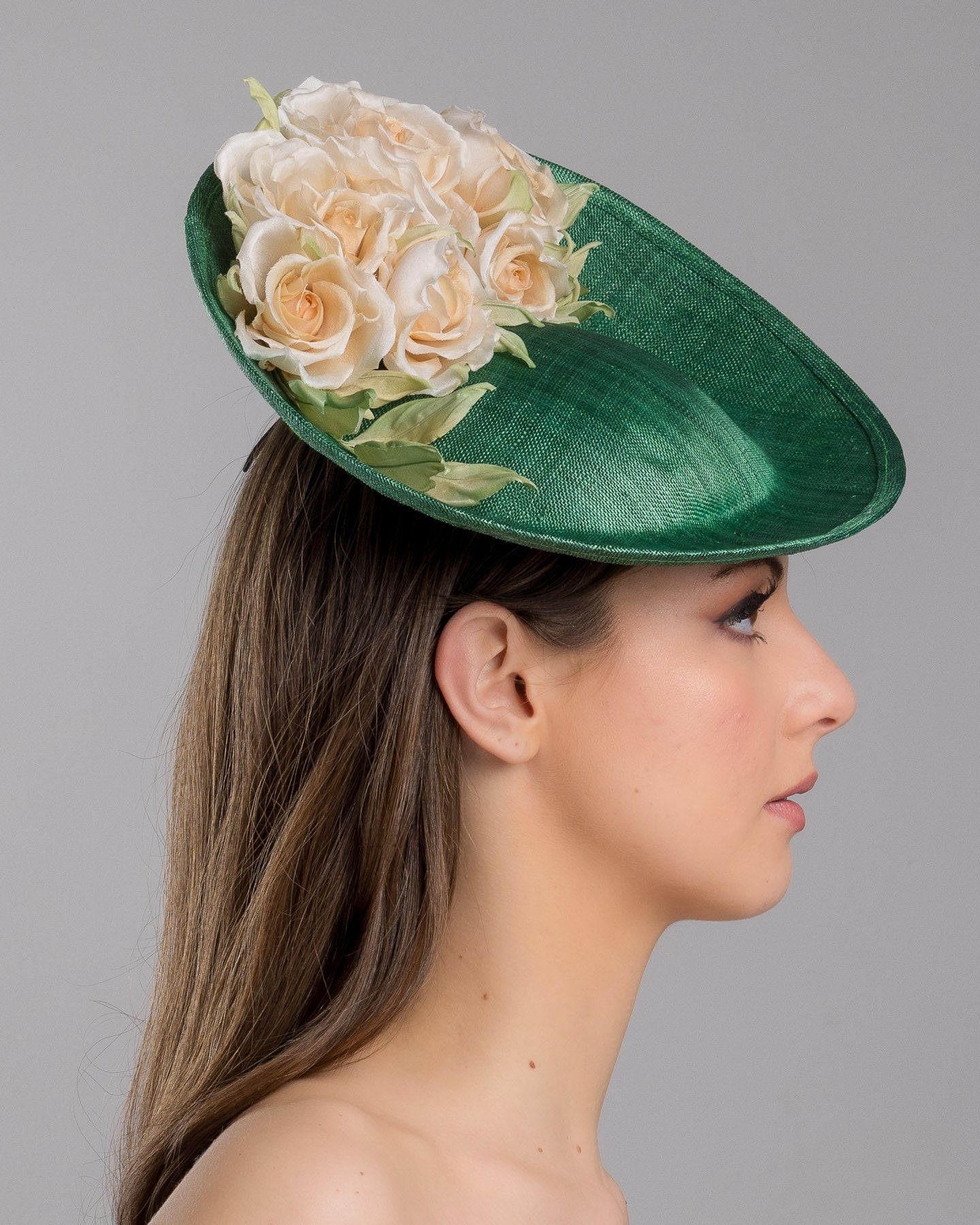 This green saucer fascinator hat exemplifies the best in millinery craftsmanship, ideal for a mother of the bride or any fashionable attendee. The silk roses are handcrafted, ensuring each petal and leaf is ideally placed to create a natural and lifelike appearance. The arrangement of the roses atop the green saucer base gives the hat a dynamic and three-dimensional quality, making it a standout piece that complements traditional and contemporary outfits.