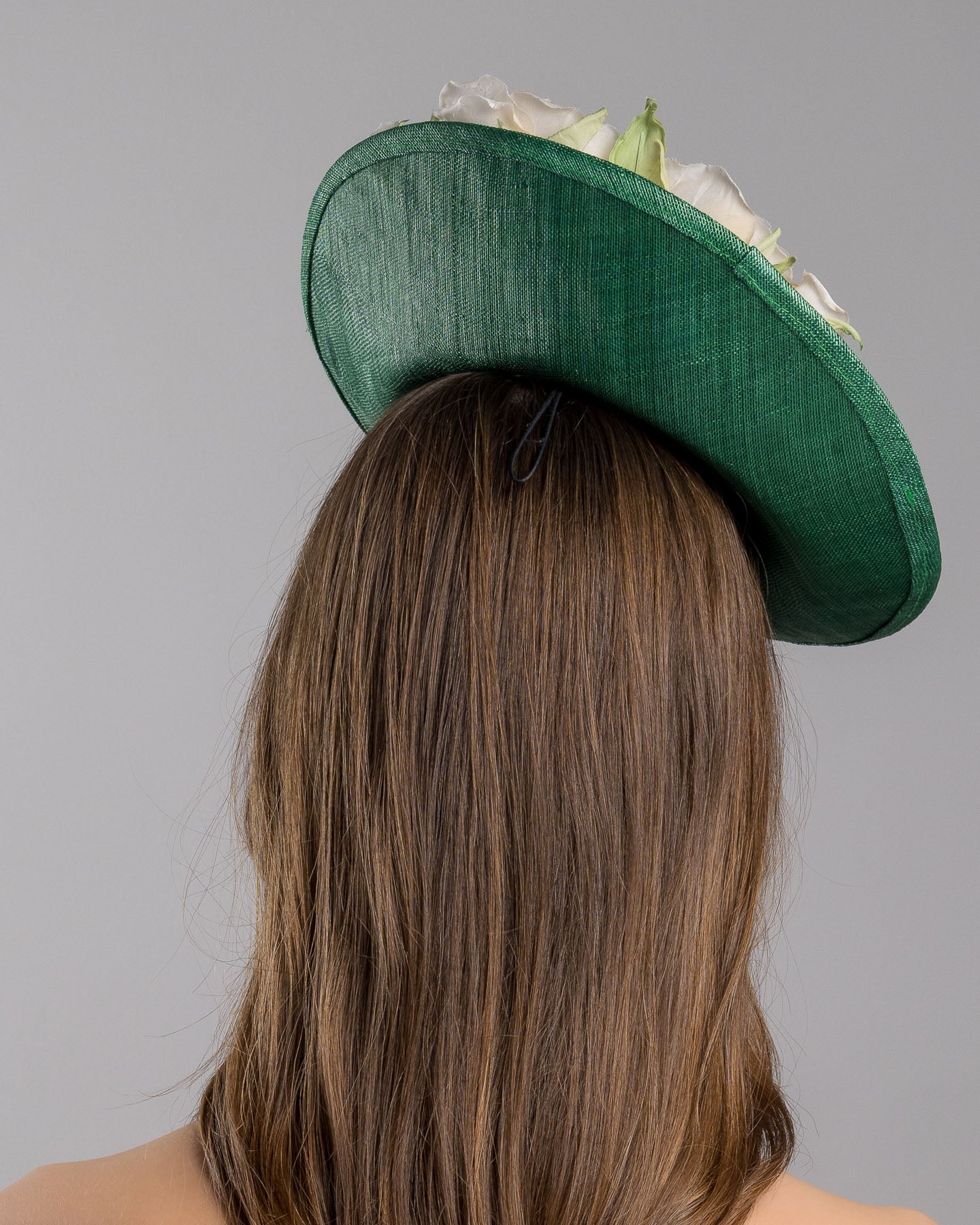 This saucer-style green hat with silk roses is a classic and fashionable accessory, perfect for making a statement at prestigious events like Royal Ascot. The hat's deep green base provides a striking contrast to the soft cream silk roses, creating a harmonious and eye-catching design. This green fascinator hat is designed to be worn tilted on the head, adding an element of sophistication and elegance to the wearer's ensemble.