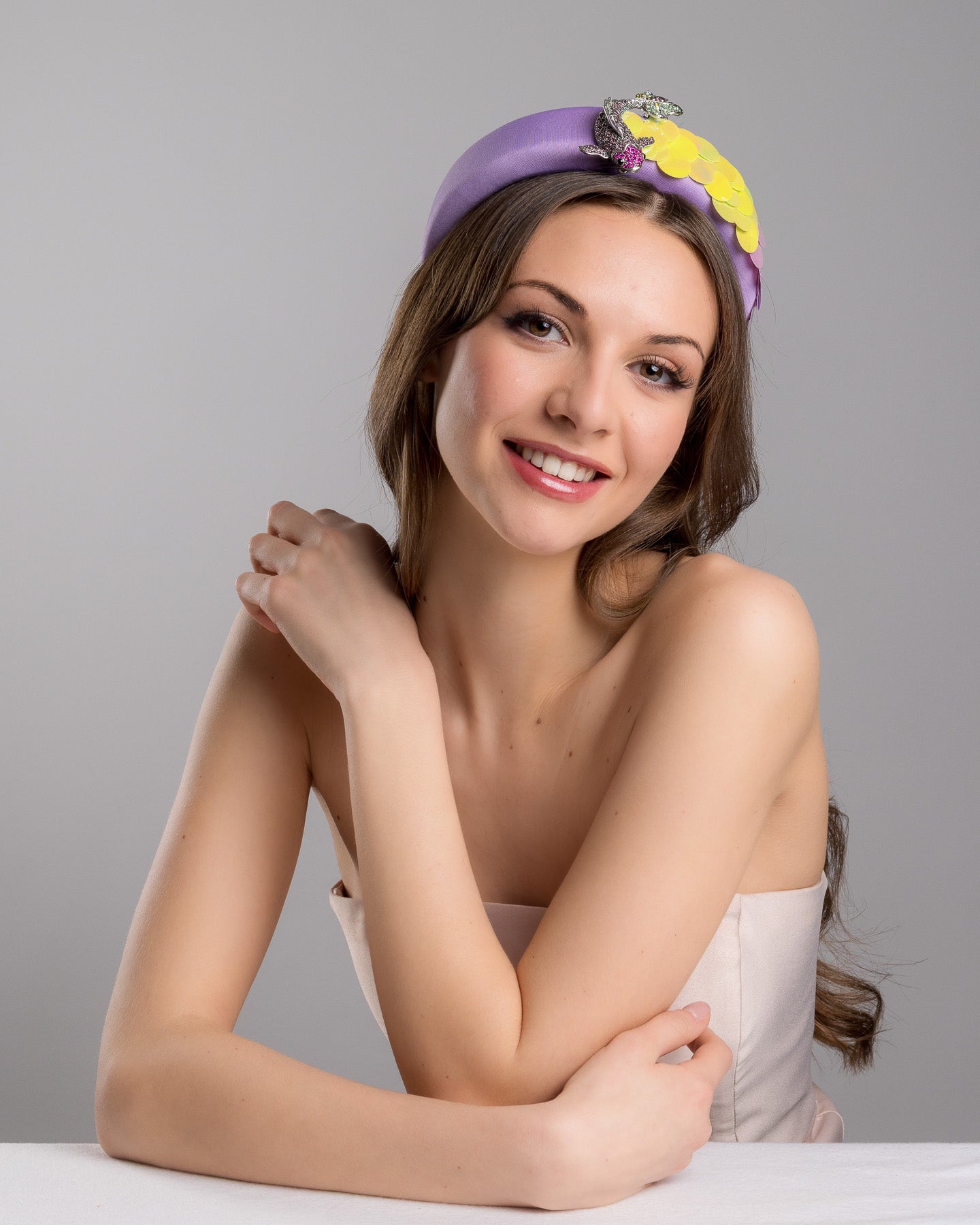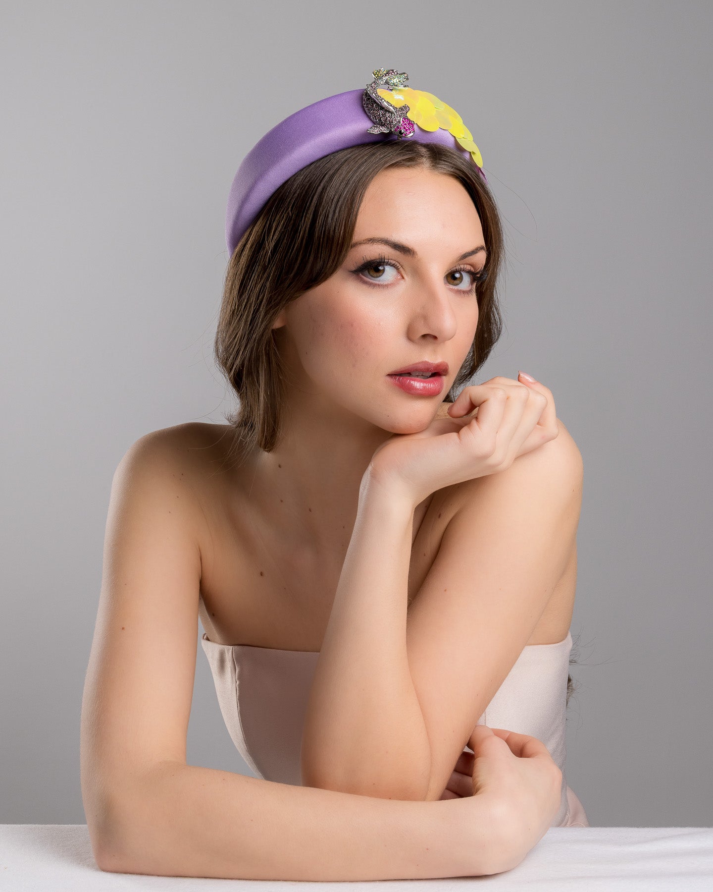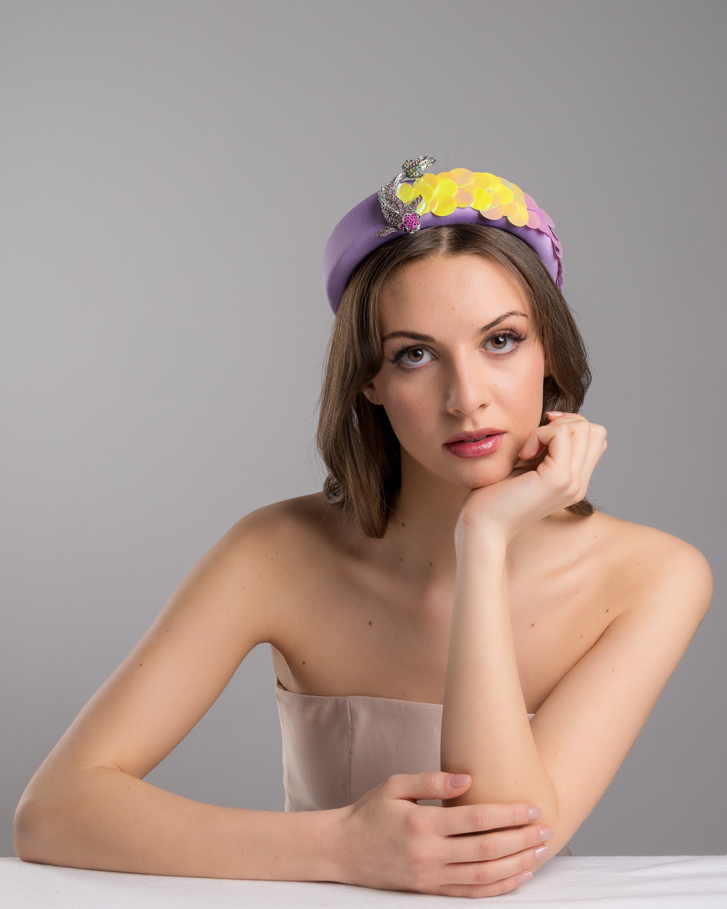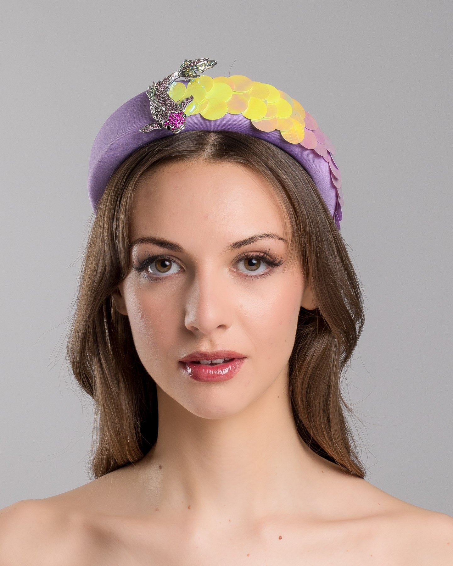 Description: High lilac headband, embroidered with green and yellow large sequins and a pink shaded koi brooch.