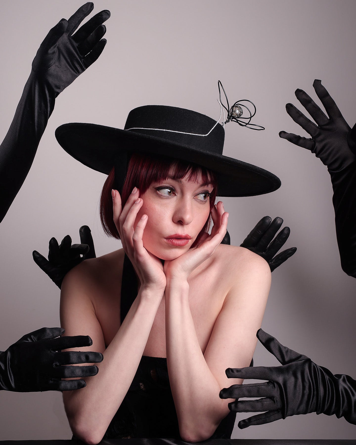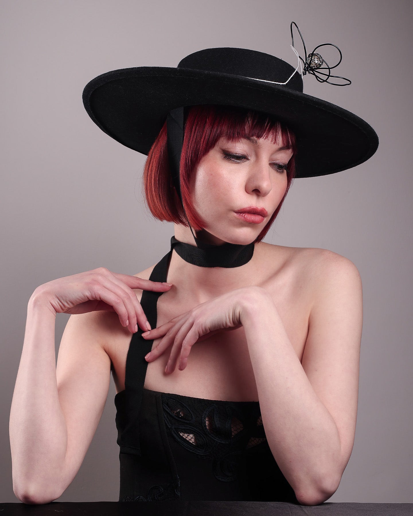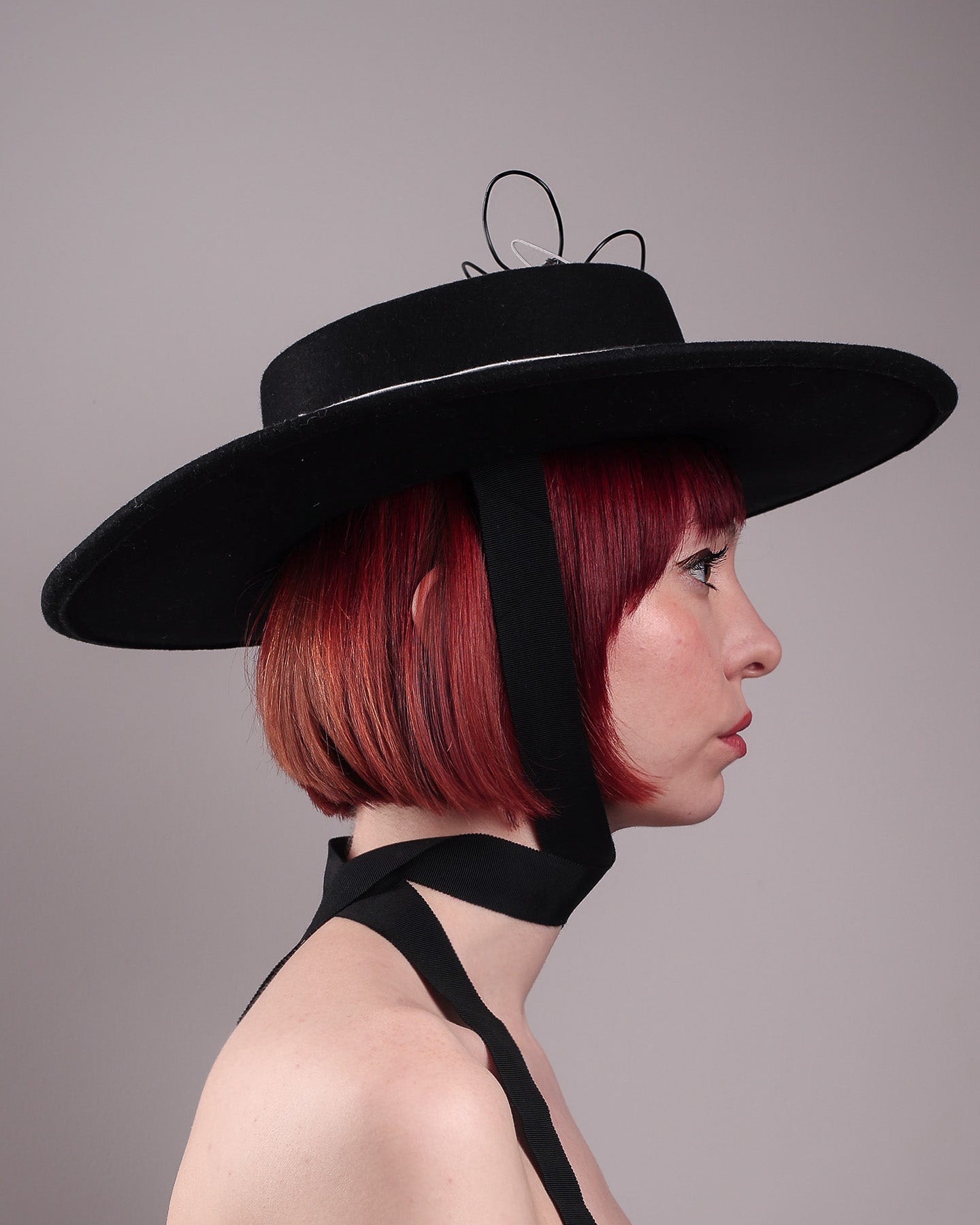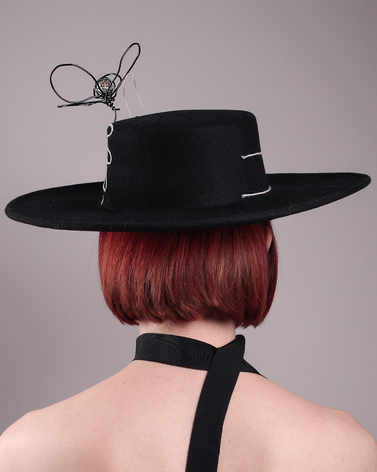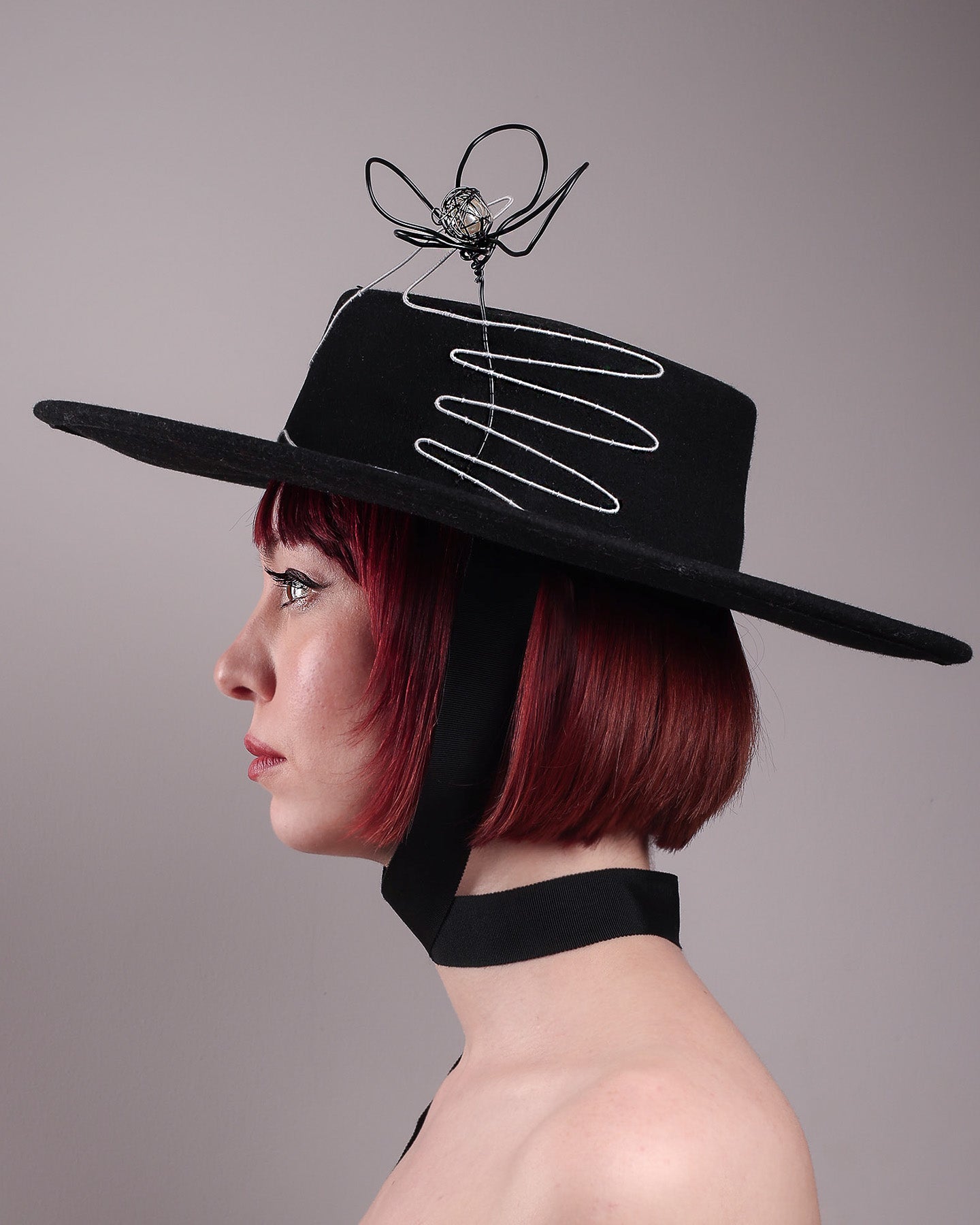 Unapologetically graphic, the Lune wide-brim boater hat transforms classic millinery into wearable art. Crafted in deep black felt, the hat's crown is detailed with an hand-stitched outline of a hand—an abstract nod to surrealist elegance—encircling a wire ornament that loops skyward like an unruly ribbon flower or whispered thought. The drama is balanced by the sleekness of its flat, wide brim and architectural silhouette.