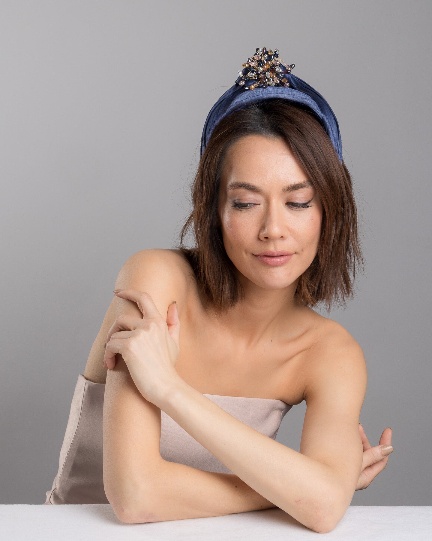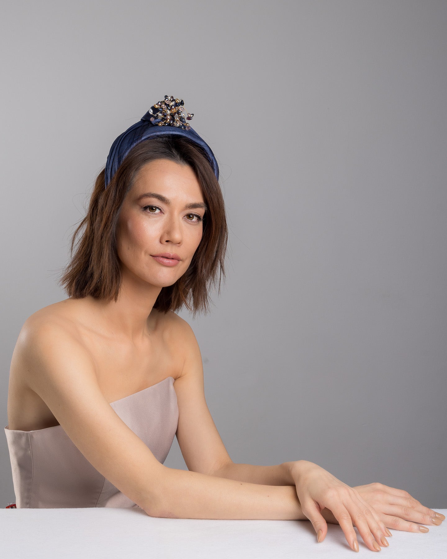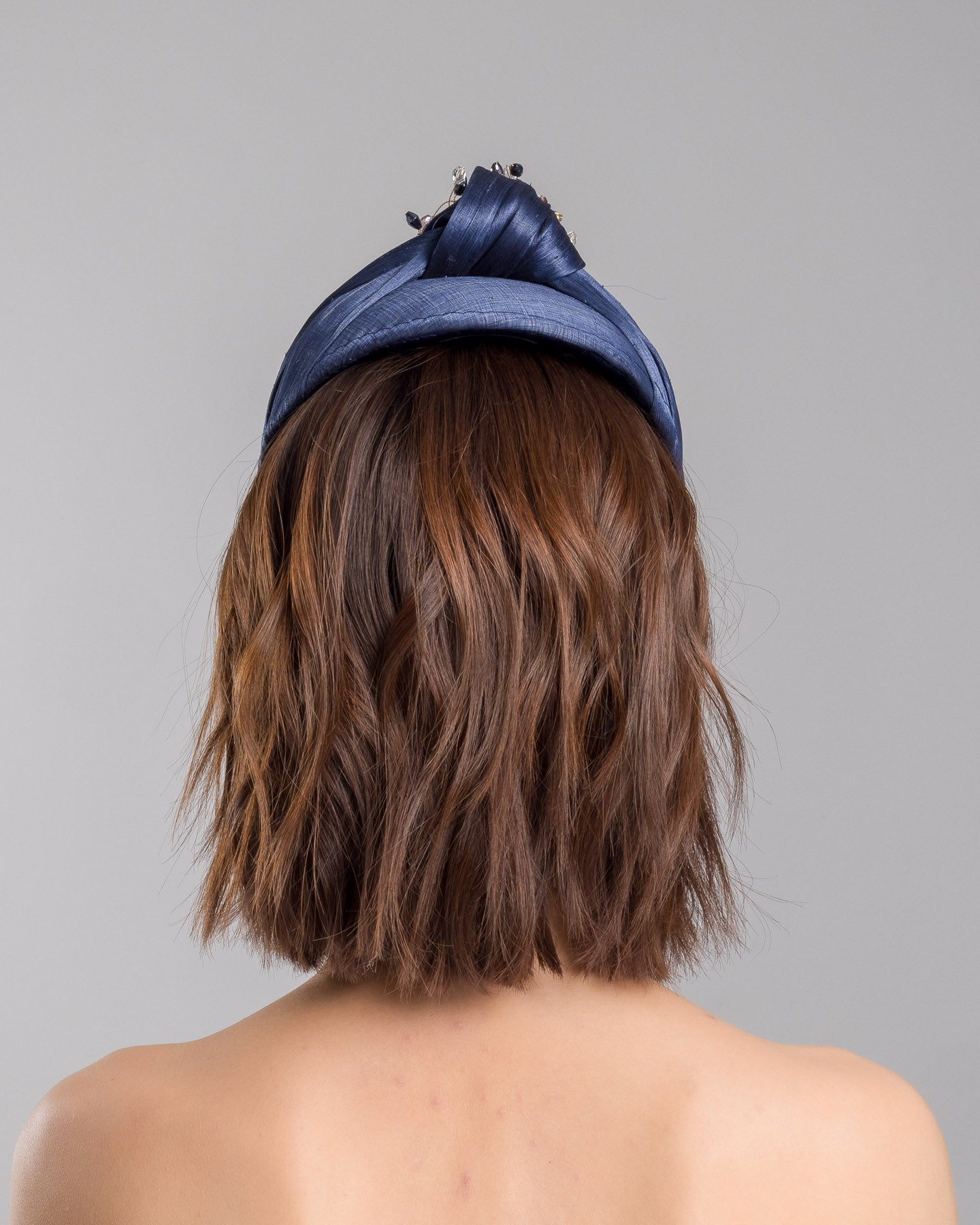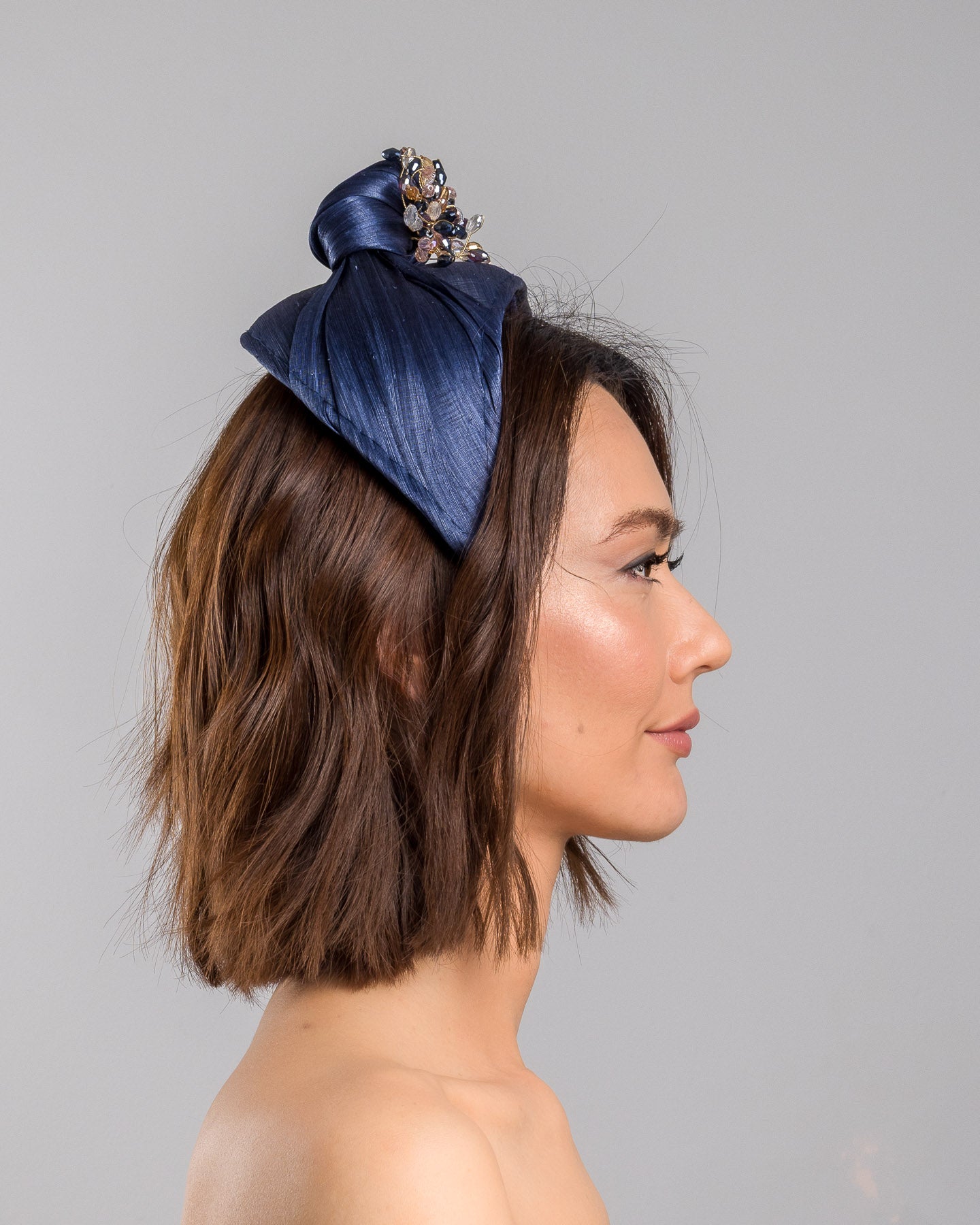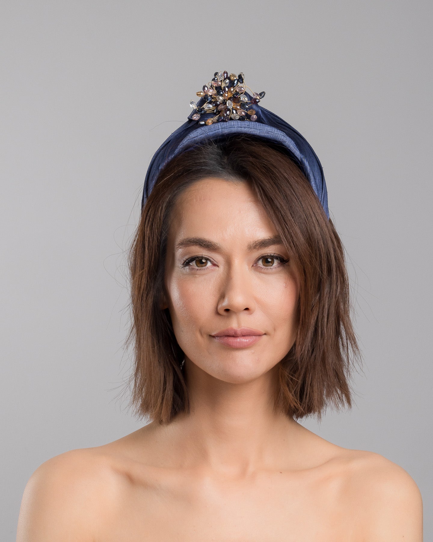 Honor is a refined navy blue headband designed for understated impact. Crafted in rich silk, the softly padded silhouette sits elegantly on the crown, offering height and structure without overpowering the face. At its centre, a hand-embellished cluster of crystals and faceted stones forms a delicate starburst, catching the light with subtle brilliance.