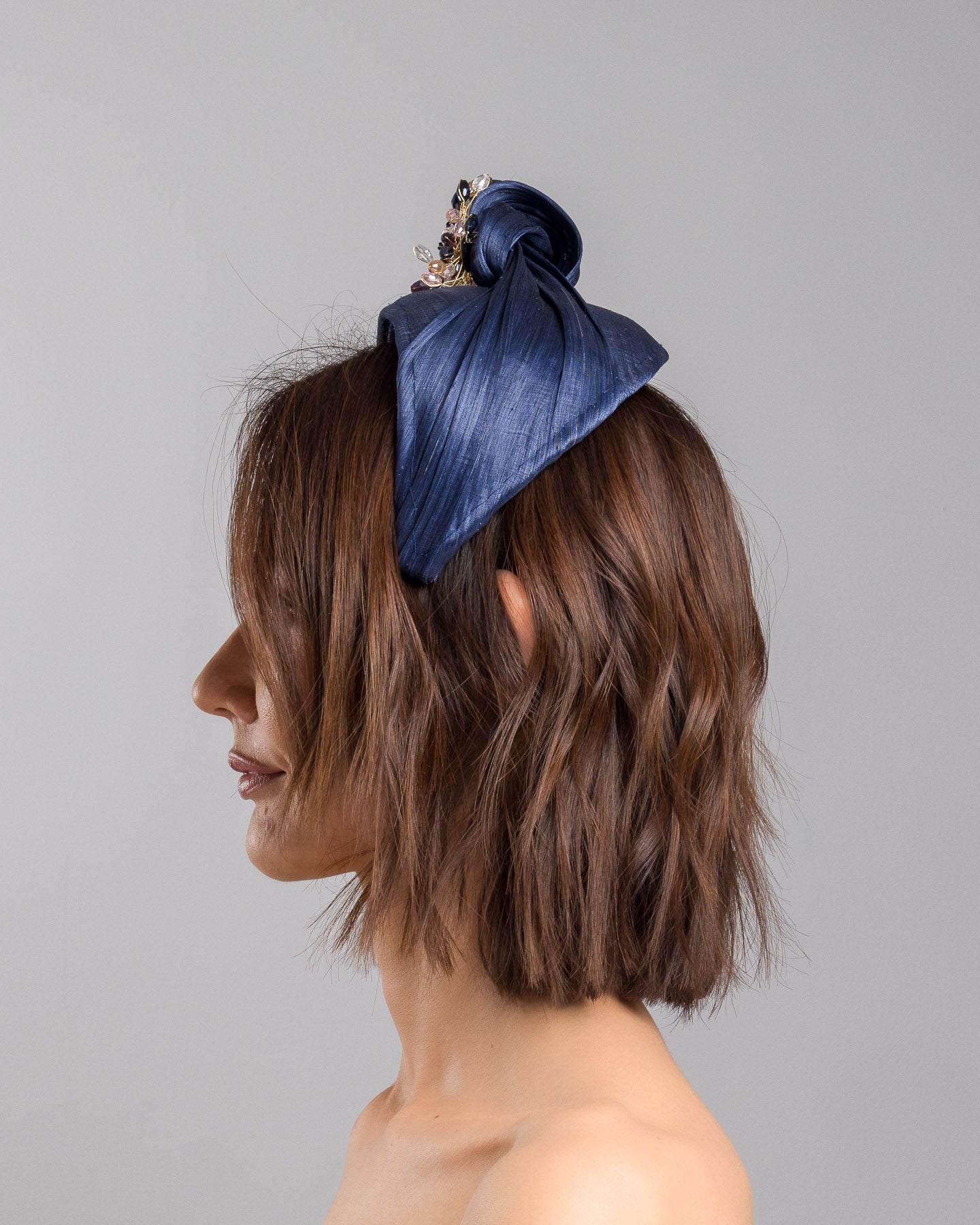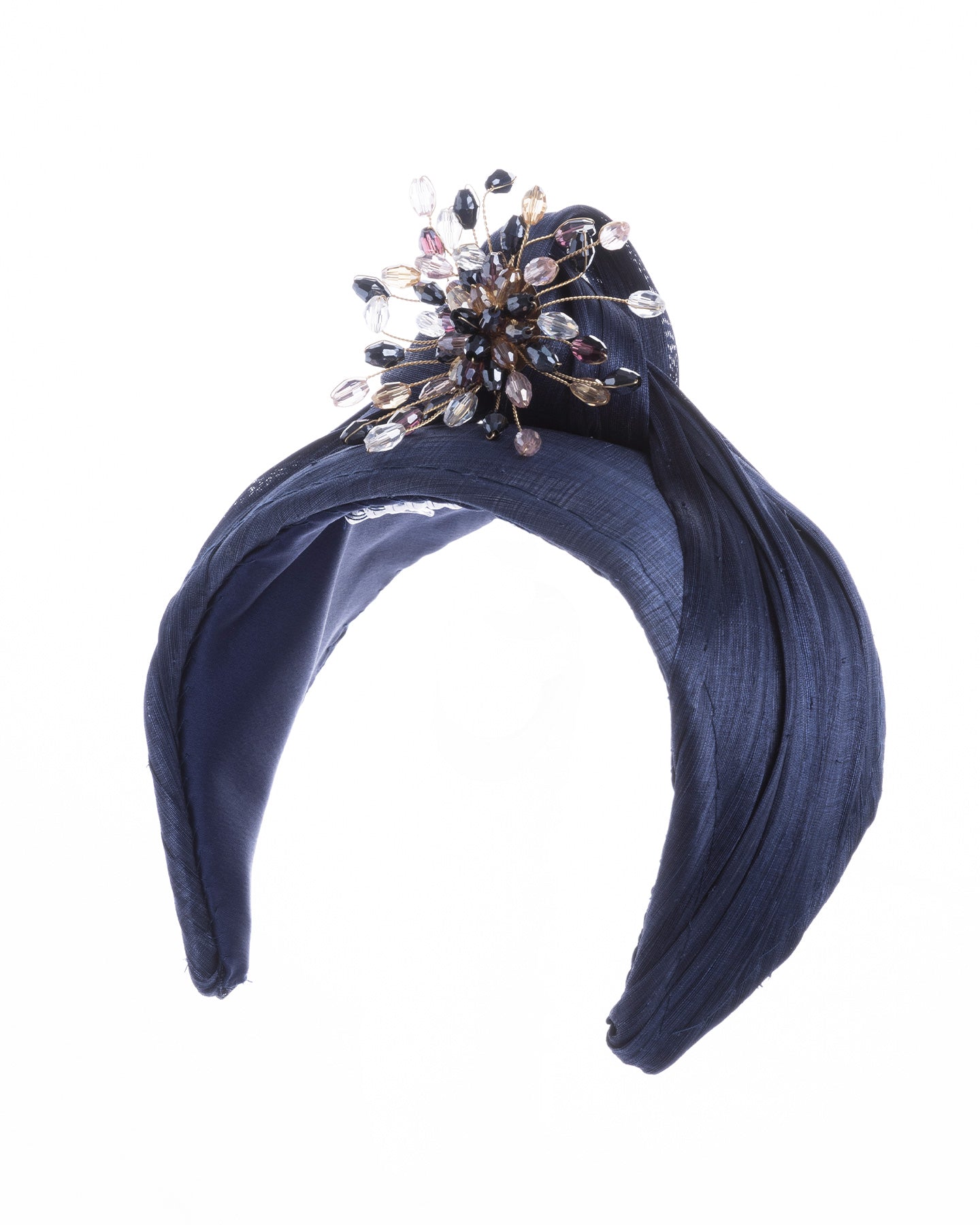 Description: Navy blue structured half-hat in textured fabric, featuring a sculptural twisted silhouette and embellished with a statement crystal burst brooch in gold, smoky, and blush tones.