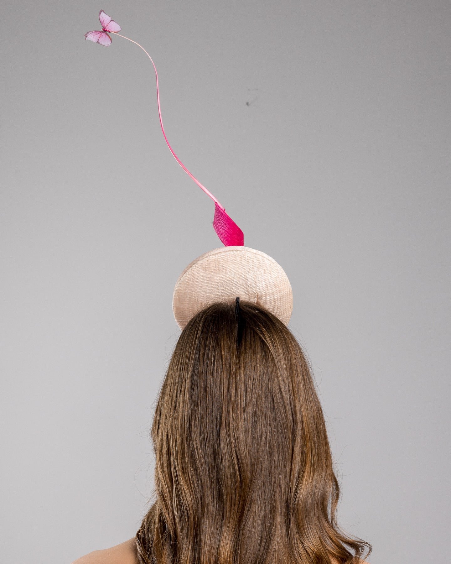 The light pink fascinator culminates in a delicate butterfly that is perfectly balanced, as if caught in mid-flight. The butterfly is a universal emblem of transformation and beauty, symbolising that with poise and grace, one can rise above the mundane and turn the everyday into a canvas of personal expression and style.