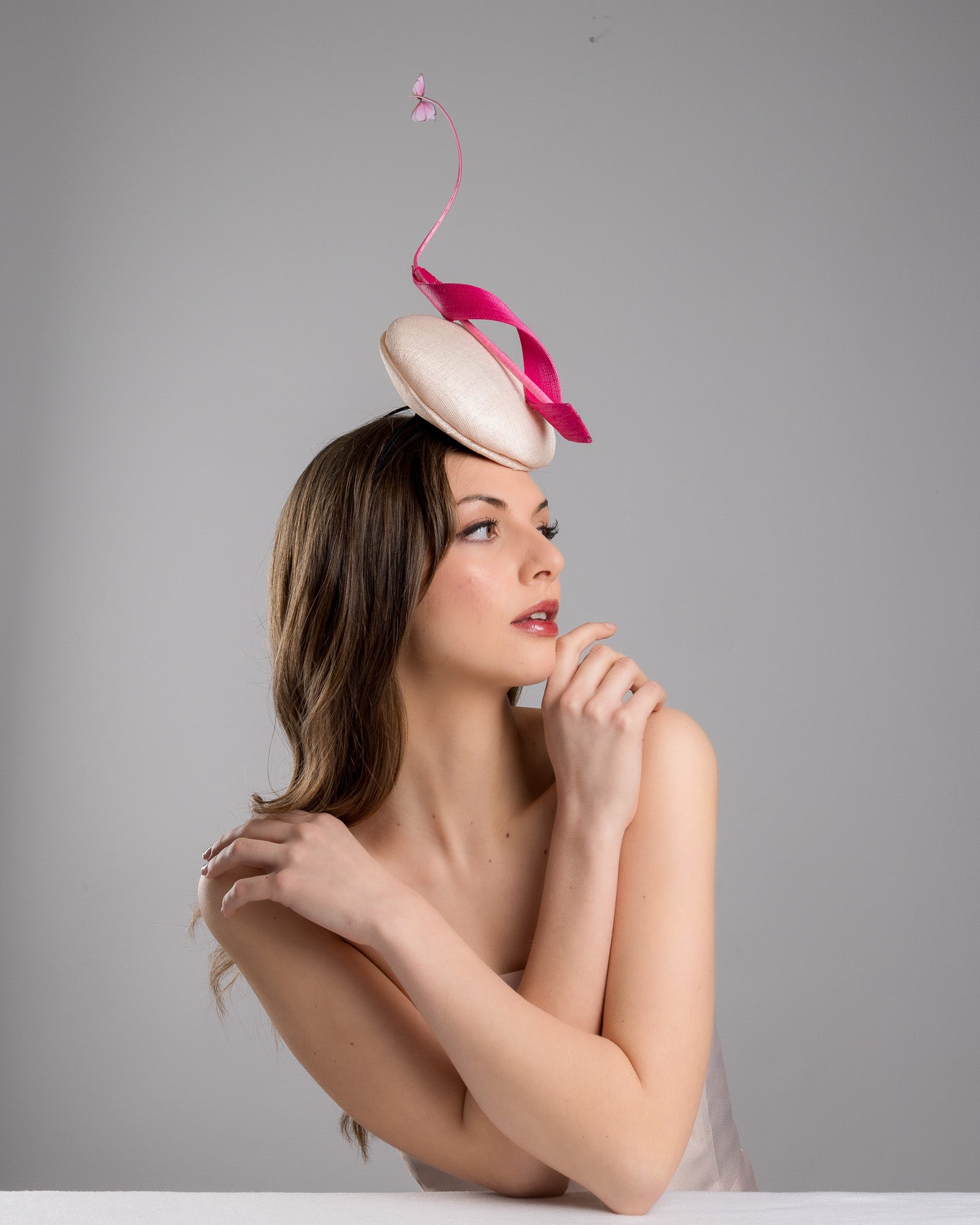 This pink button shaped fascinator exudes a touch of whimsical elegance and showcases the artistry of accessory design. It features a circular base in a soft pink shade, from which a captivating spiral twirls upwards confidently. The sinuous ribbon, in a richer and more vibrant pink shade, swirls around itself, creating a harmonious contrast in both colour and texture with the base.