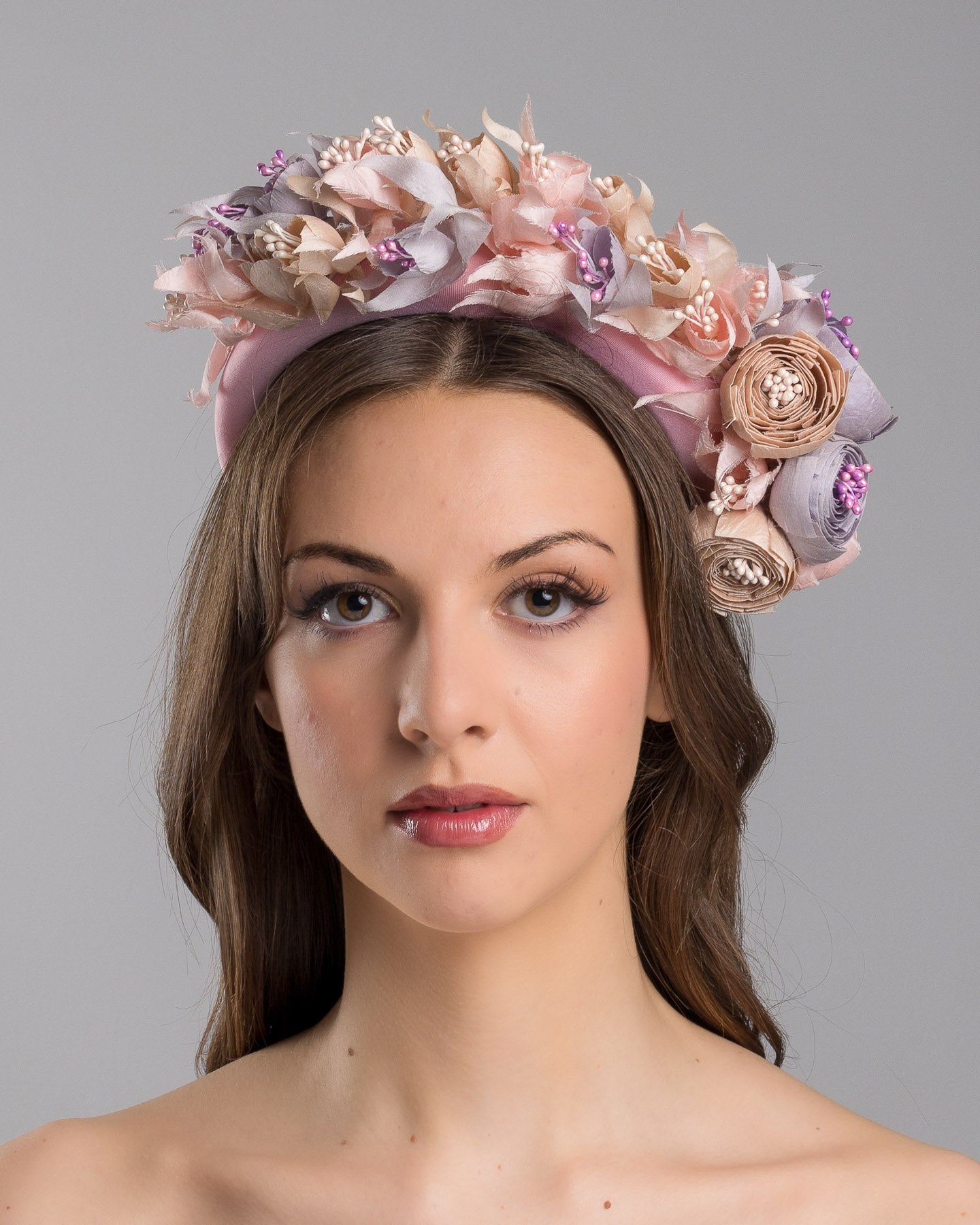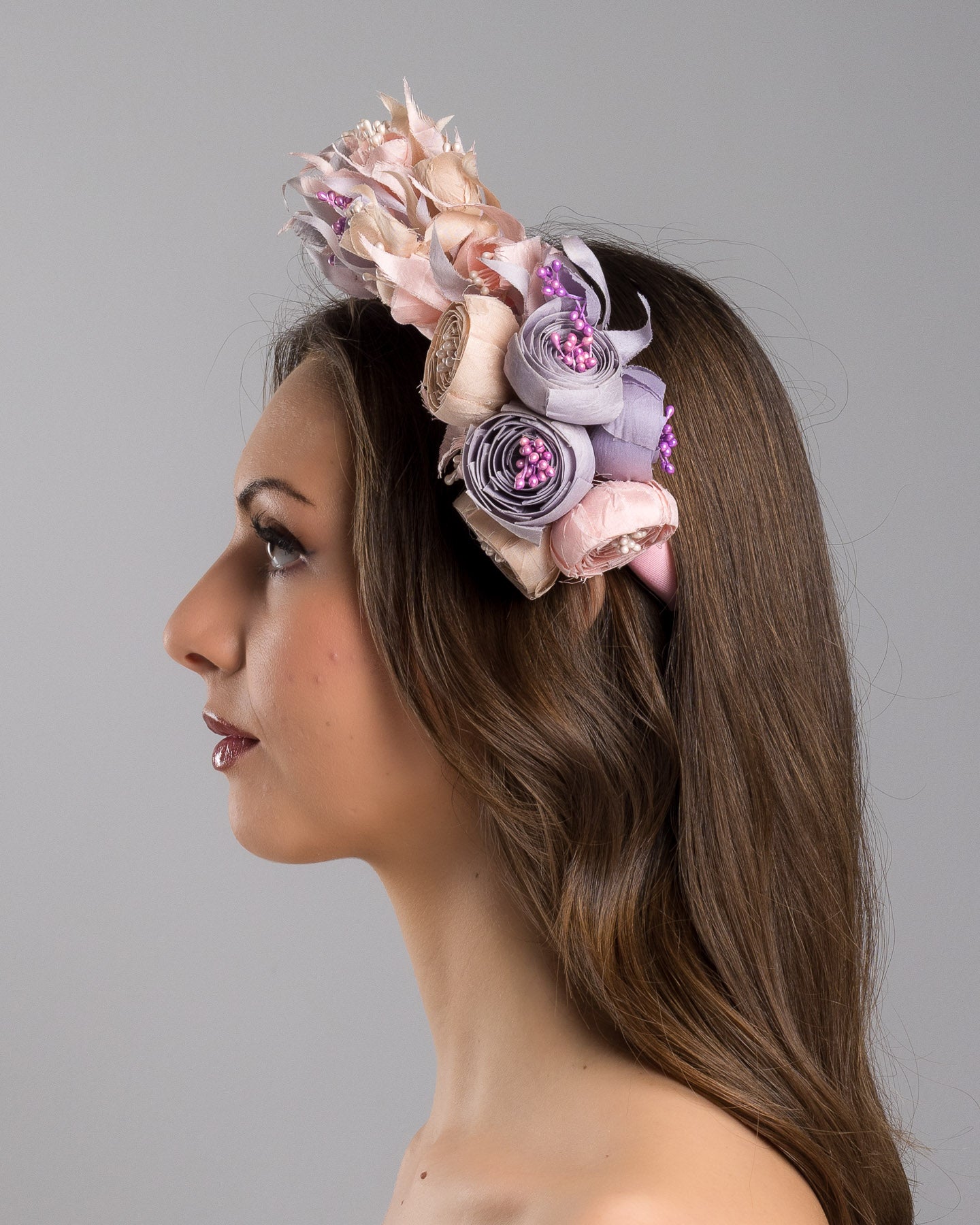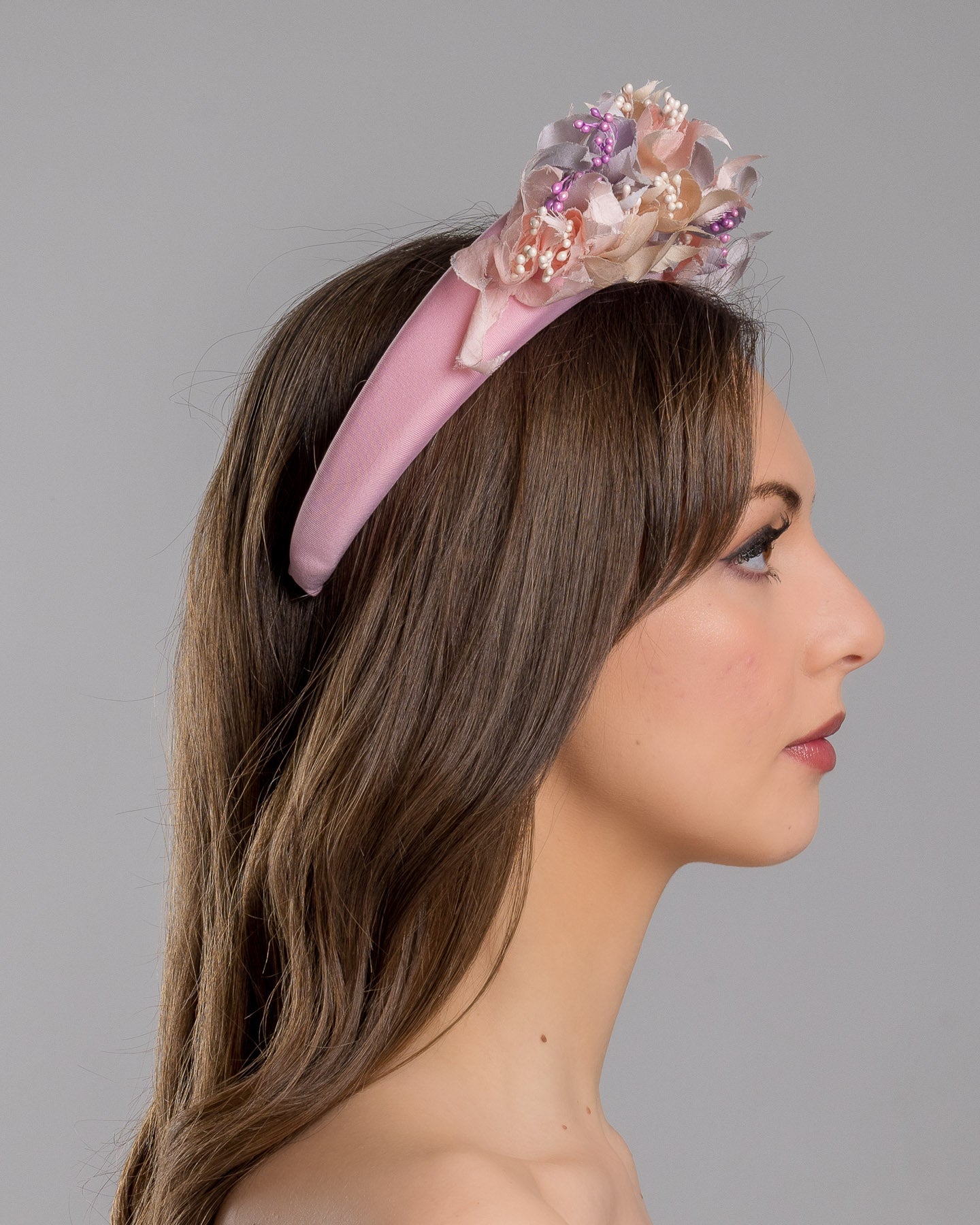 Description: High pink headband decorated with lilac, pink and ecru bouquet of peony and fuchsia flowers.