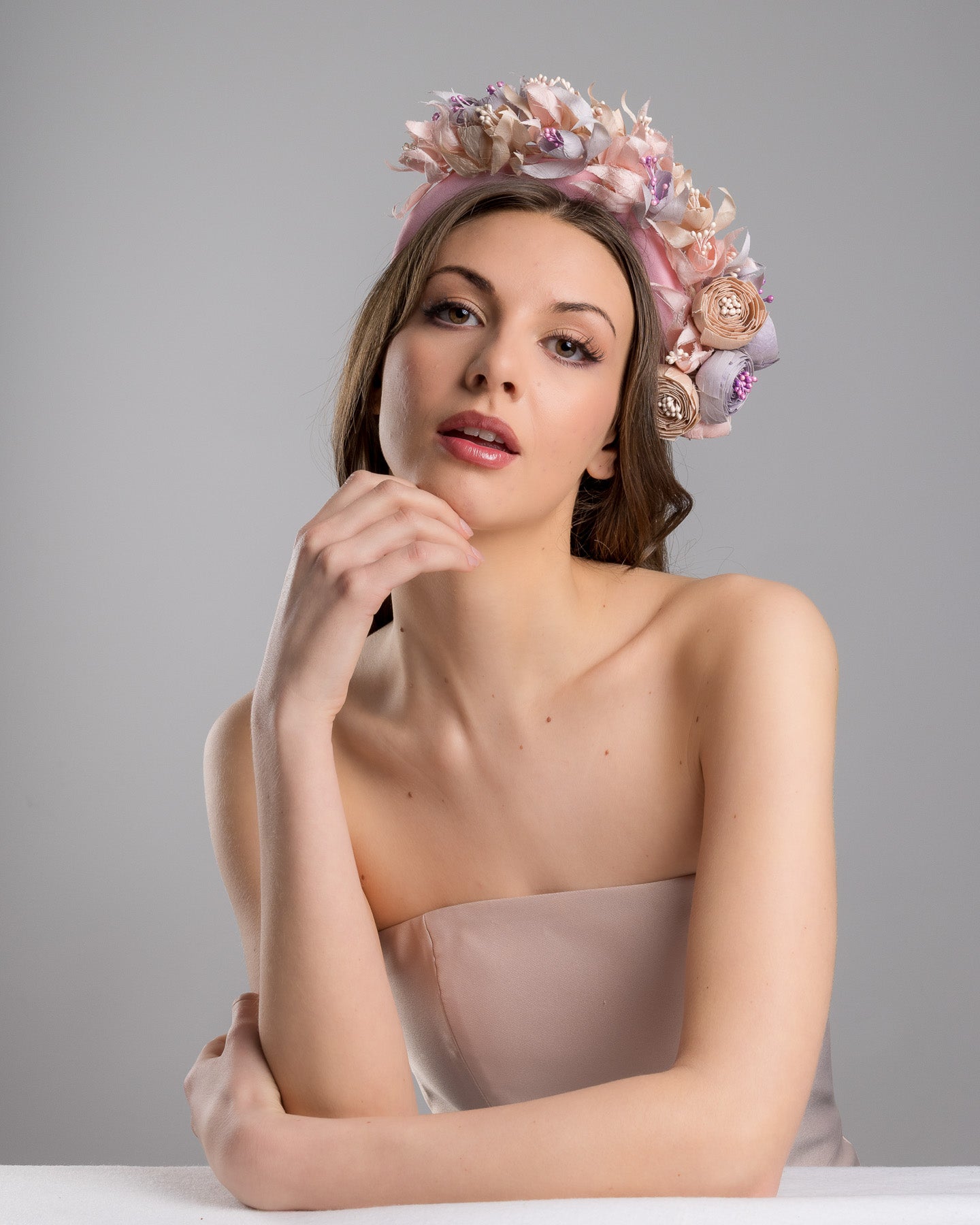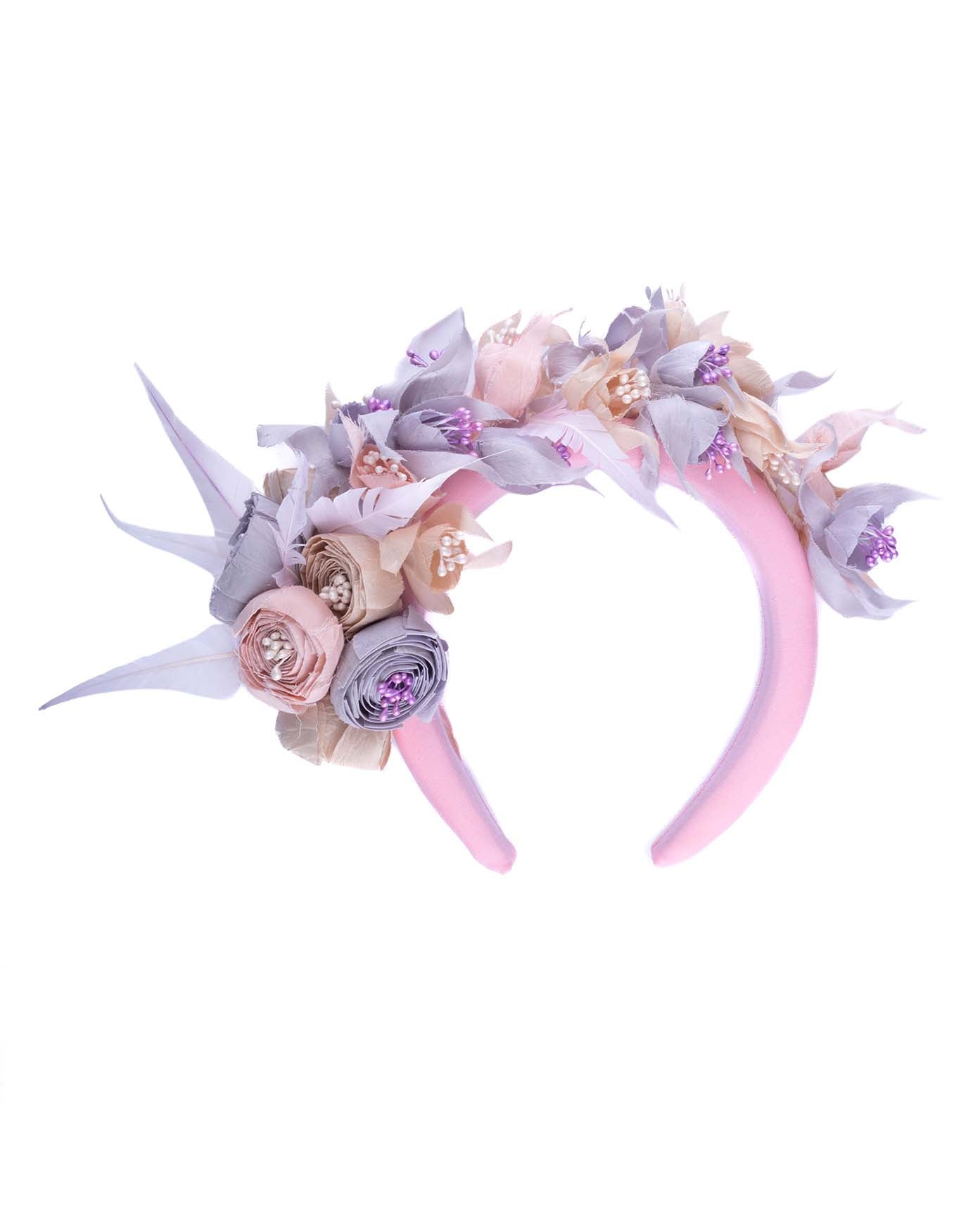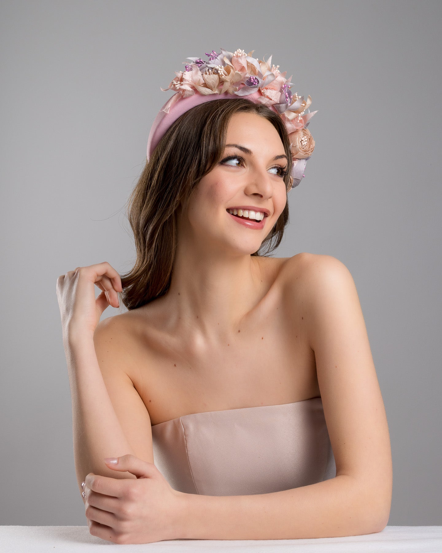 Description: High pink headband decorated with lilac, pink and ecru bouquet of peony and fuchsia flowers.