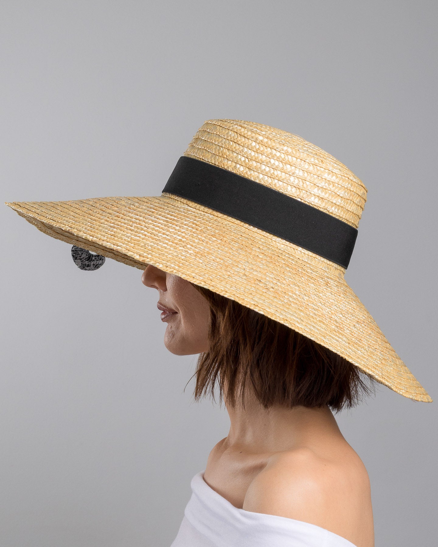 Kael is a wide brim straw sun hat with a playful twist. The natural woven base is finished with a classic black band, giving it a clean and timeless foundation. Draped over the brim, a handcrafted black cat appliqué with vivid green eyes stretches across the surface, turning a traditional silhouette into something unexpected and full of character.