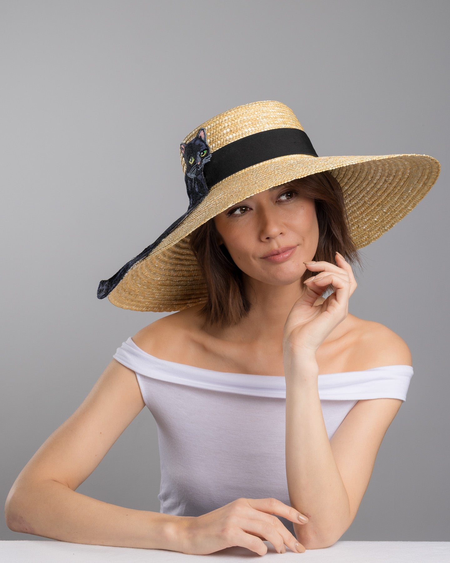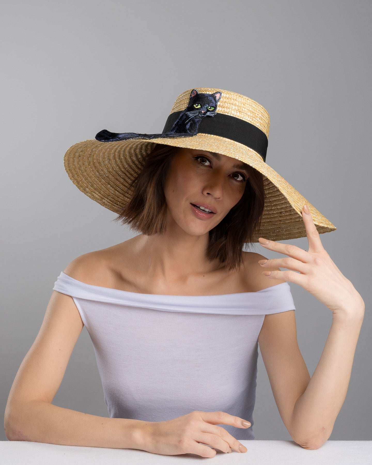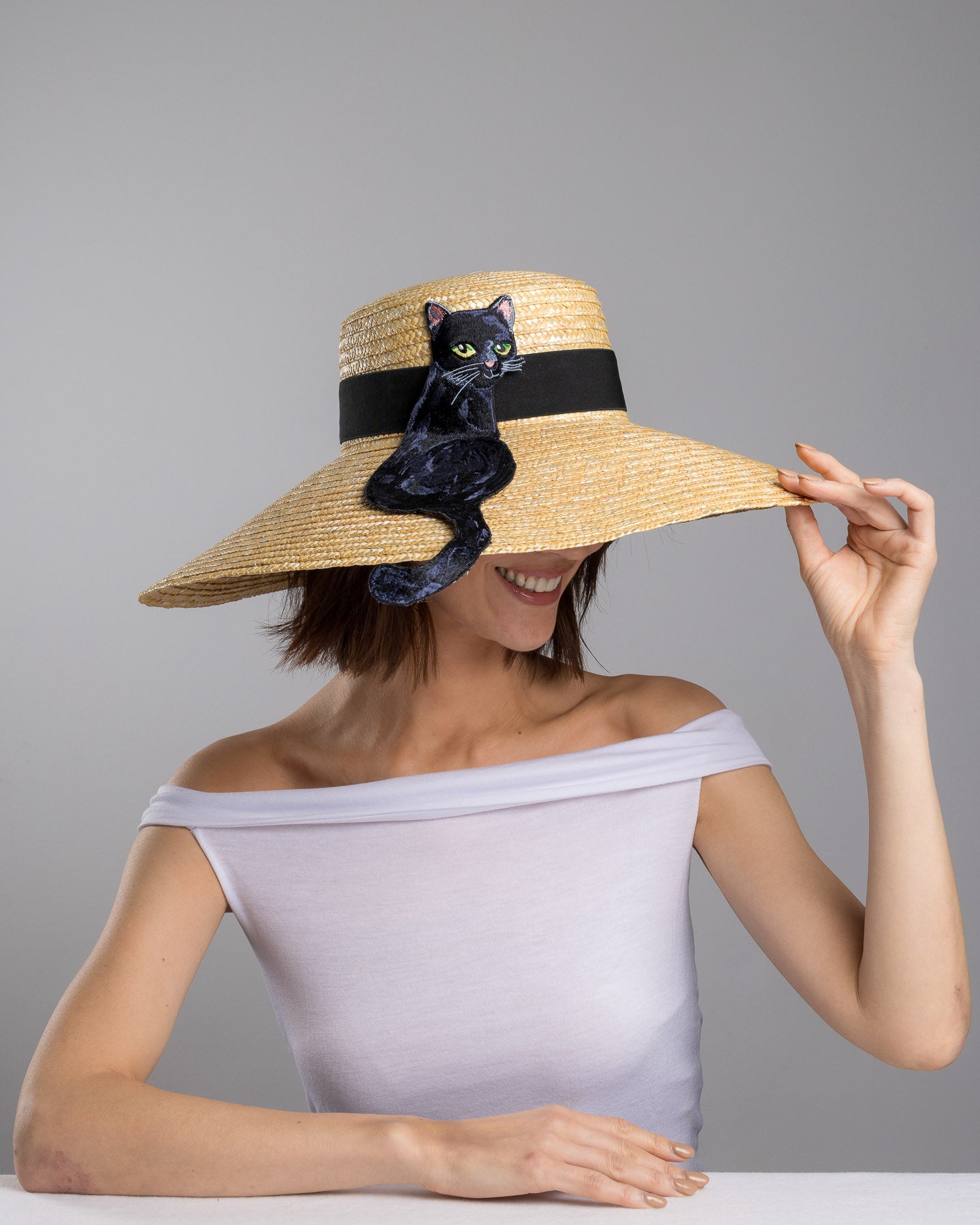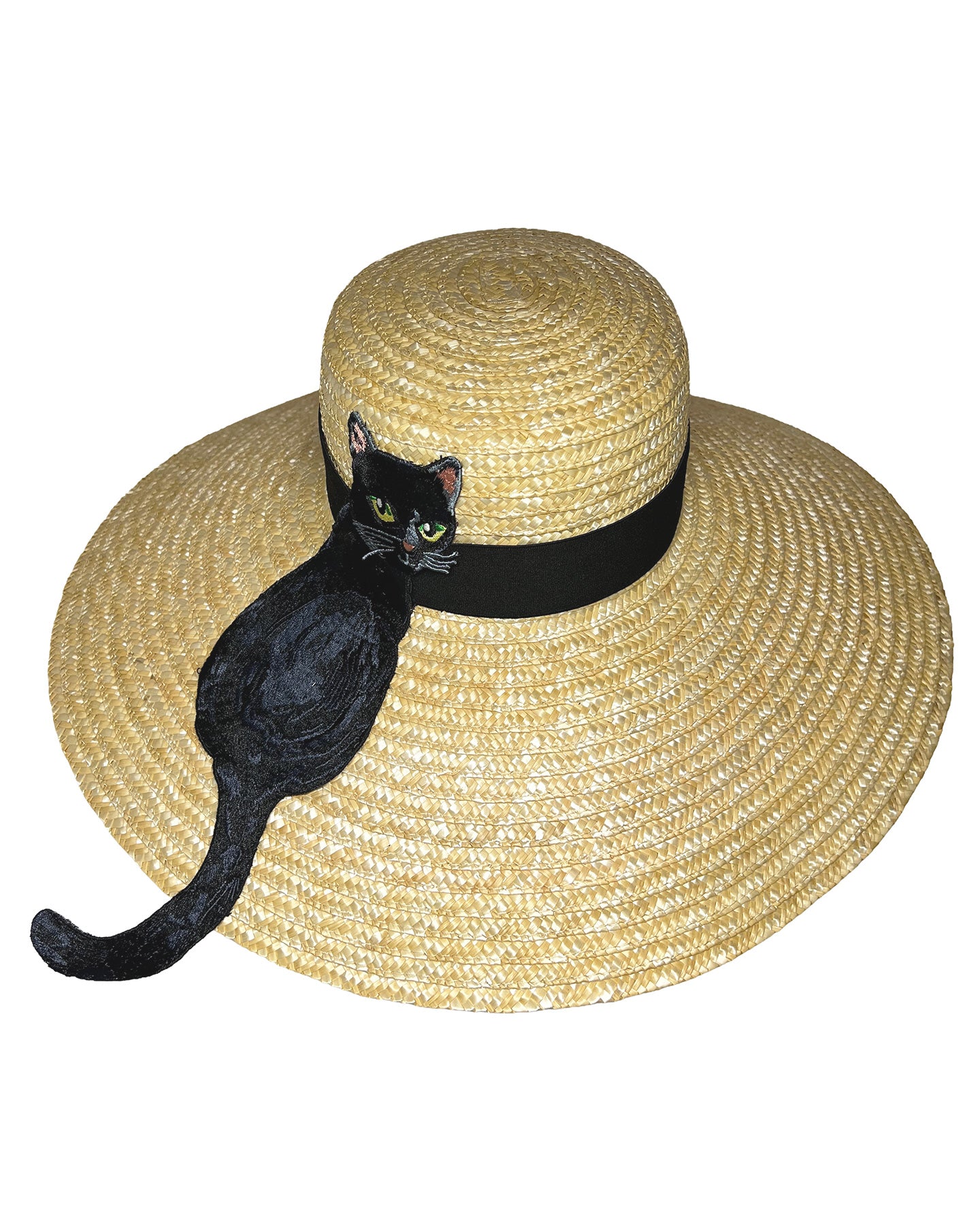 Description: Natural woven wide brim straw hat with a wide brim and black grosgrain ribbon band, featuring a large black cat appliqué with green eyes draped over the crown and brim.