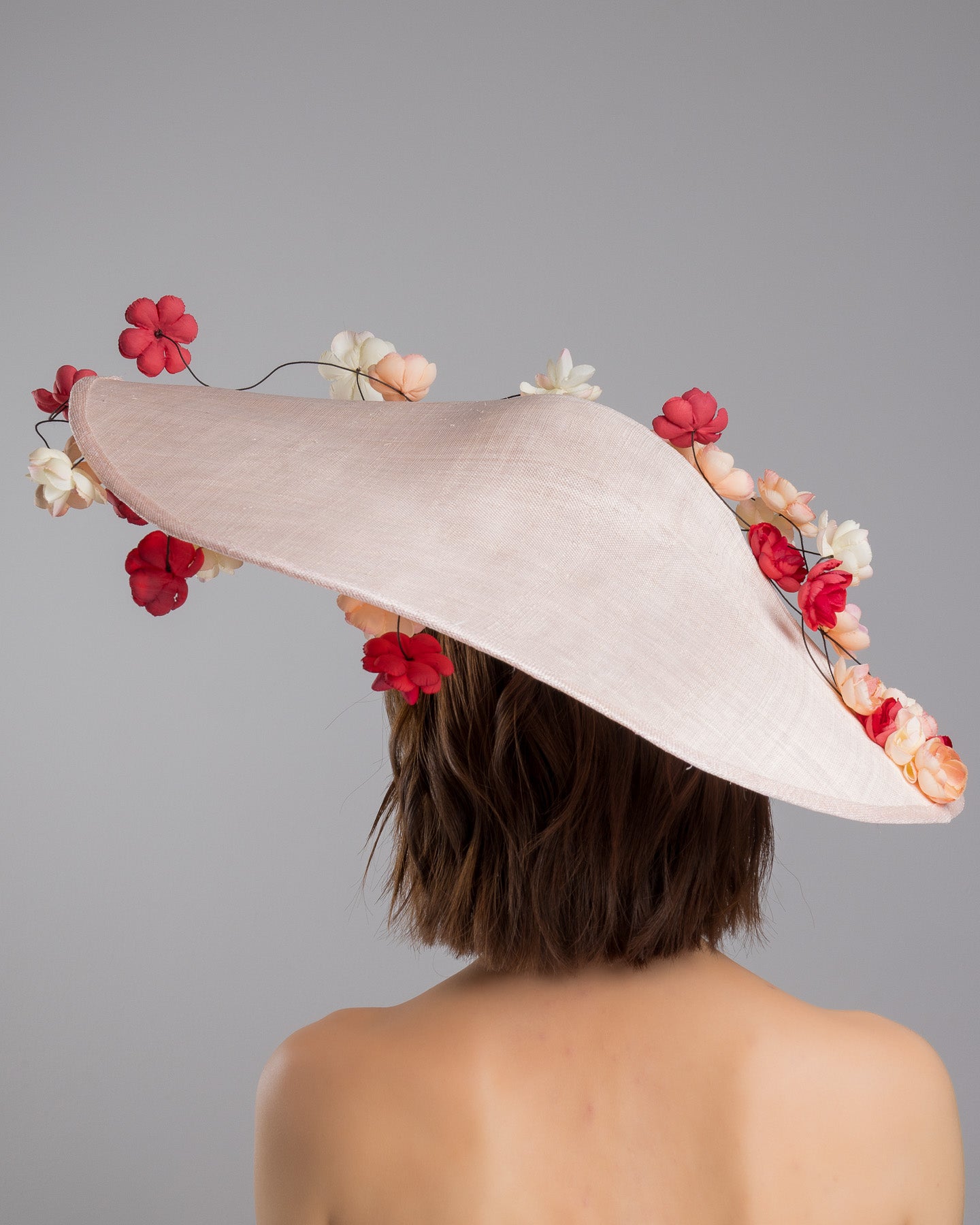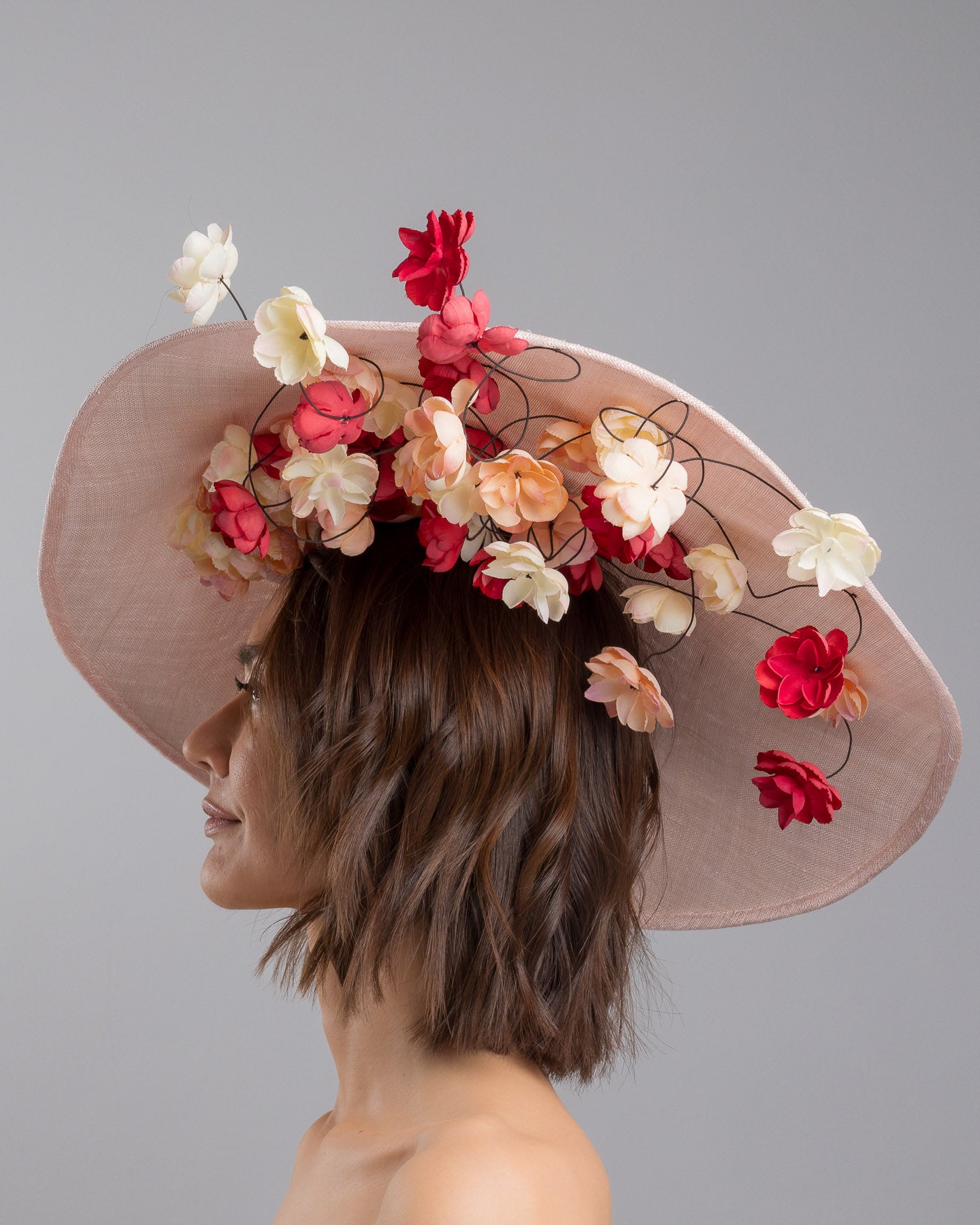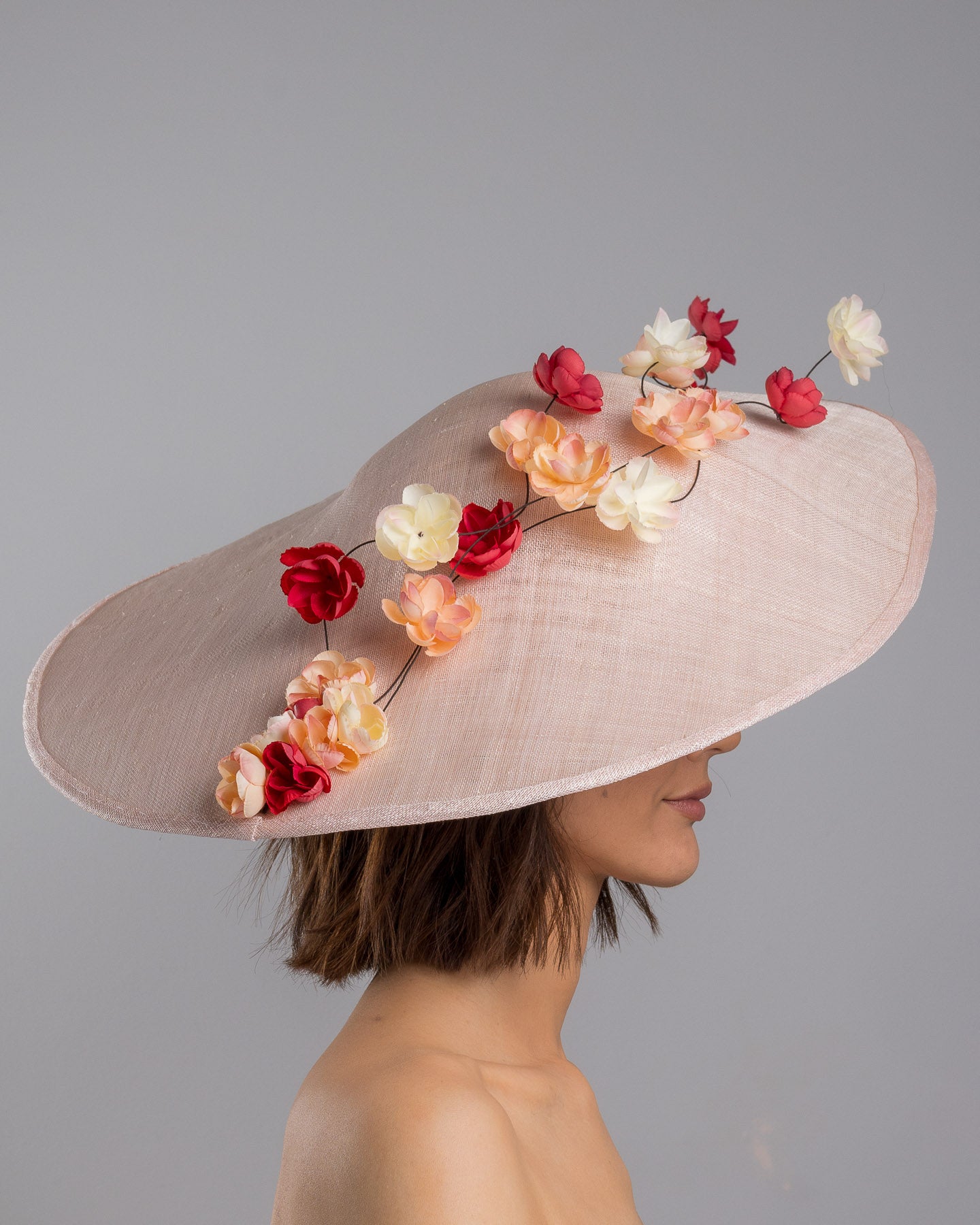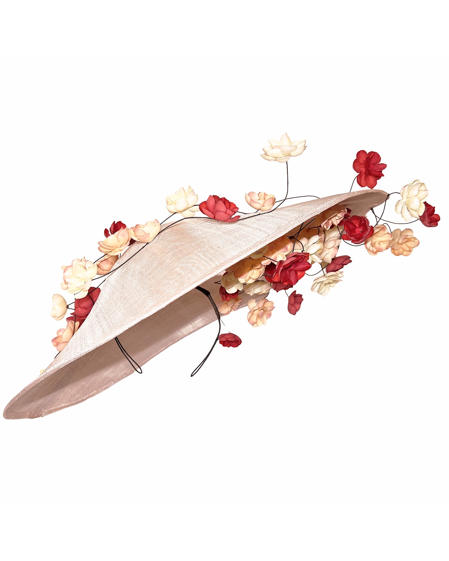 Description: Soft blush sinamay base hat with an elegant sculpted brim, adorned with cascading clusters of cream, peach, and deep red flowers on fine wired stems, creating a romantic, floating garden effect.