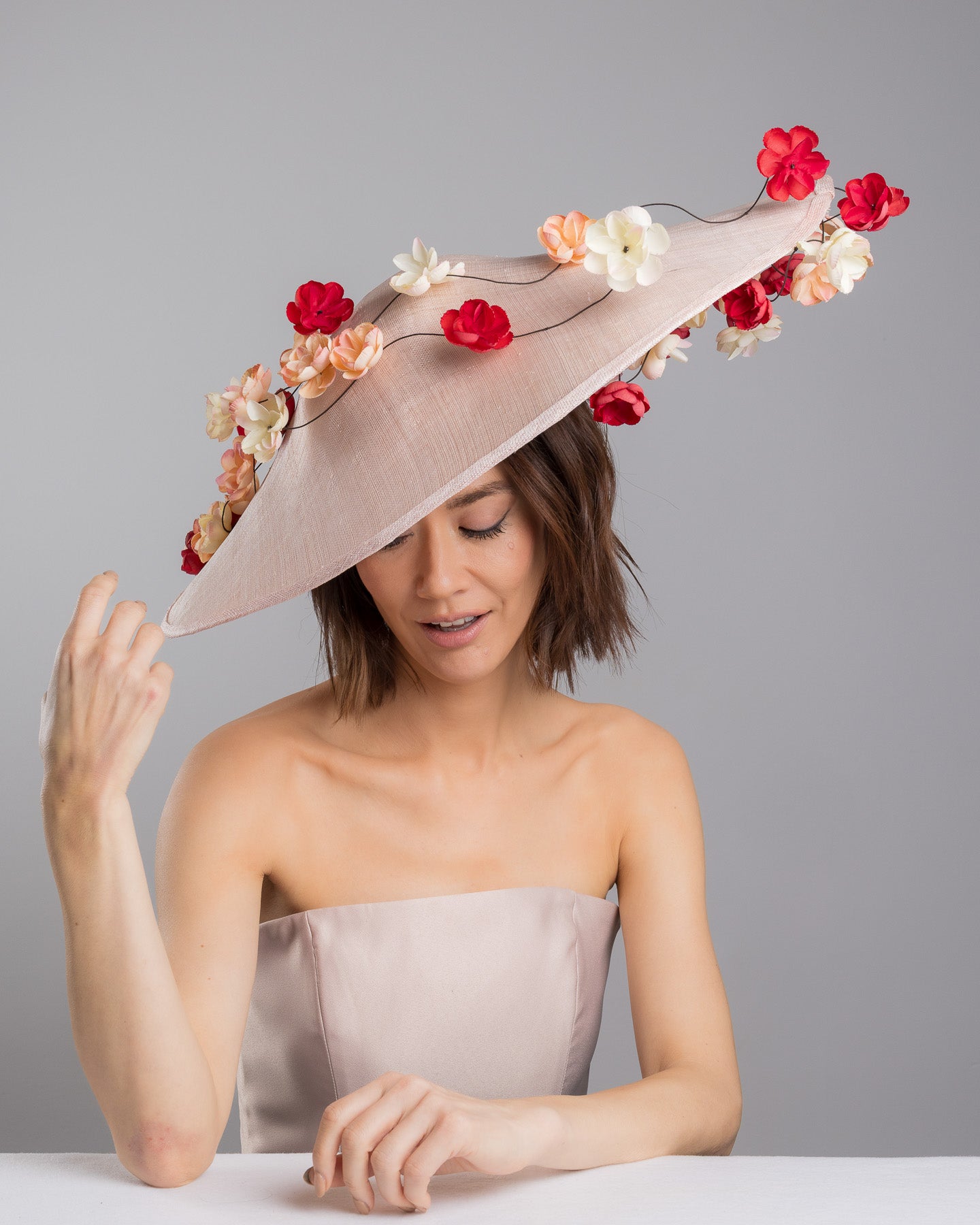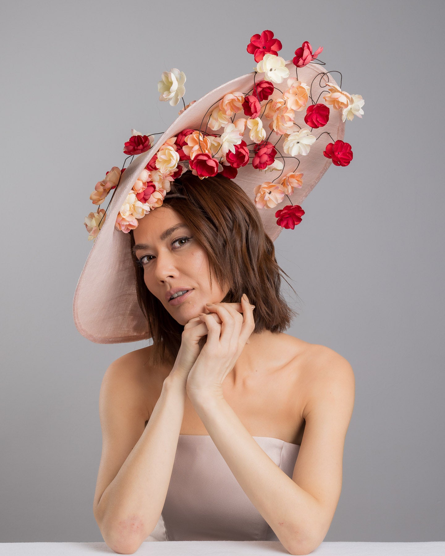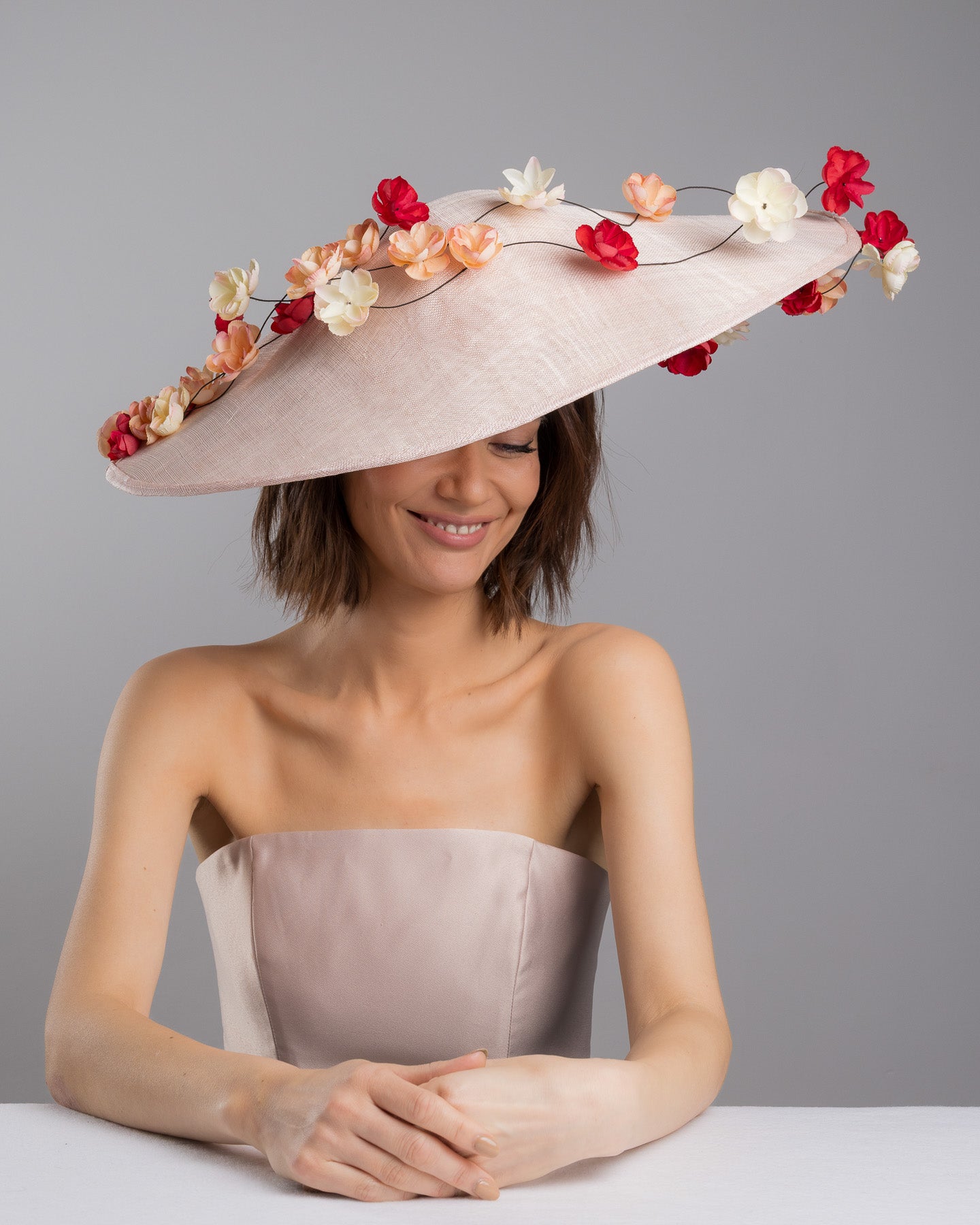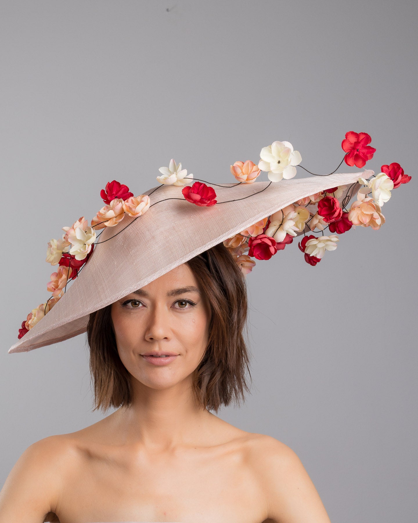 Description: Soft blush sinamay base hat with an elegant sculpted brim, adorned with cascading clusters of cream, peach, and deep red flowers on fine wired stems, creating a romantic, floating garden effect.