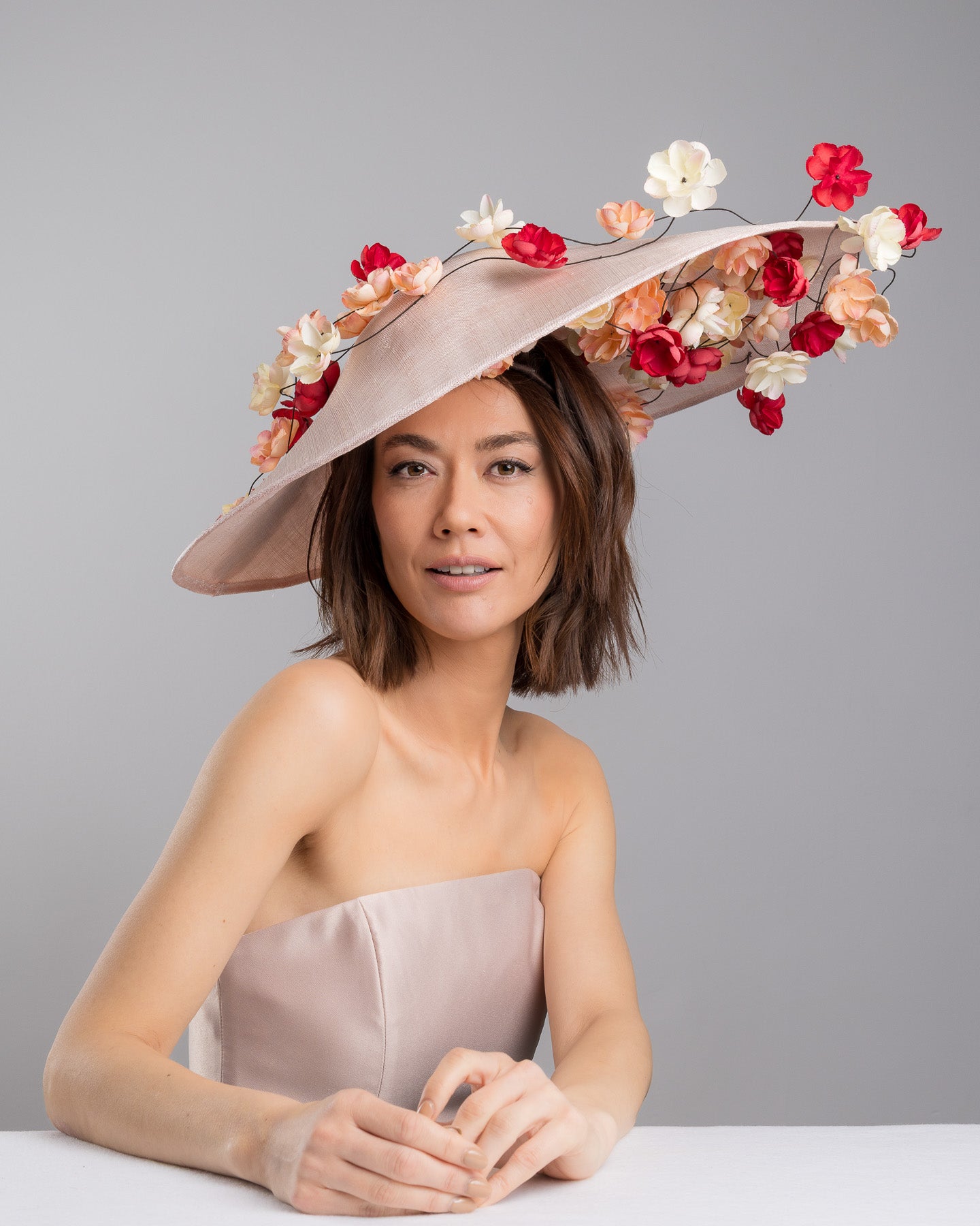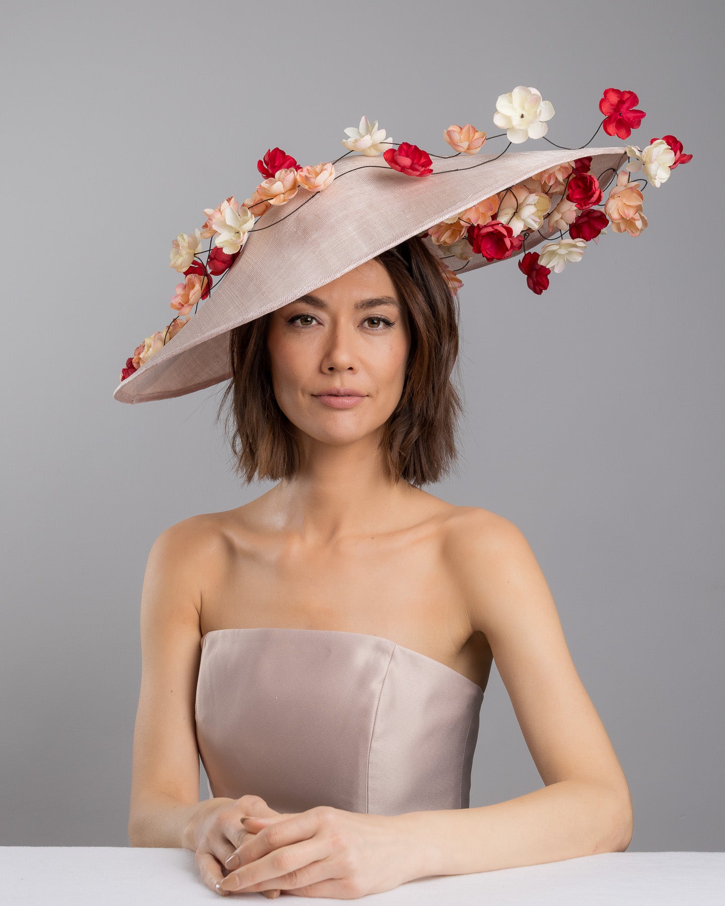 Rivane is a statement wide brim hat crafted in soft blush sinamay, adorned with an abundance of hand-placed florals in shades of ivory, peach, and vibrant red. Delicate wired stems allow the blossoms to float and extend beyond the brim, creating movement, dimension, and a romantic sense of drama from every angle.