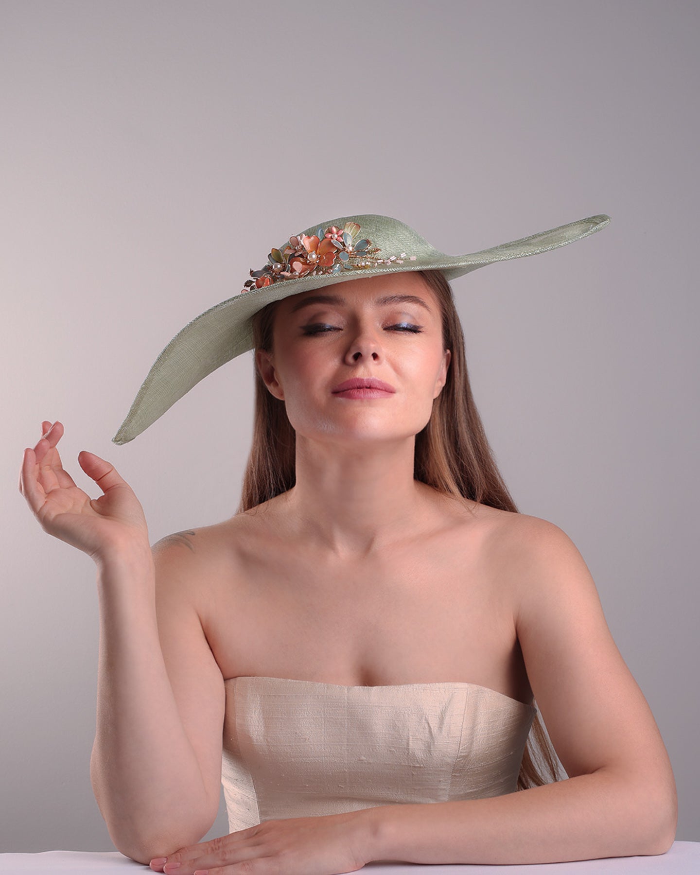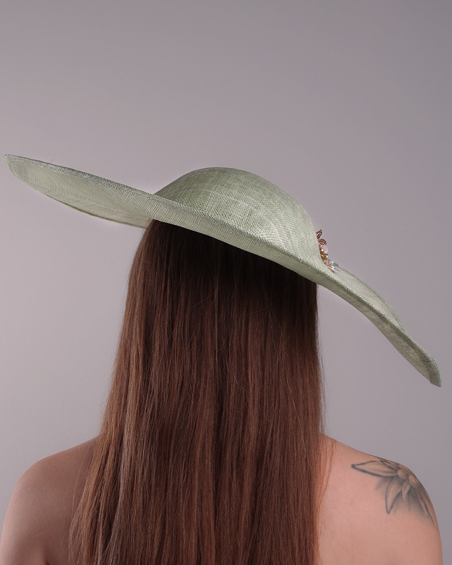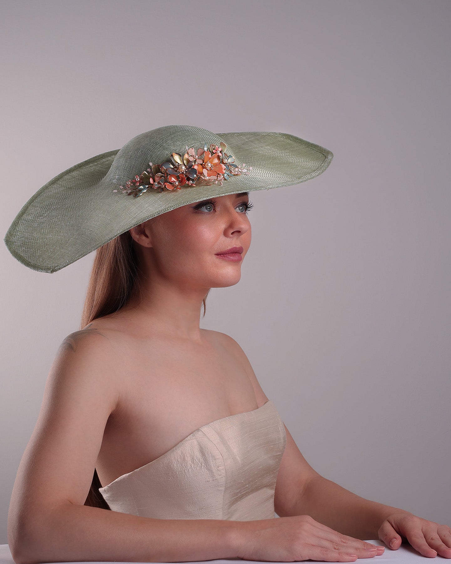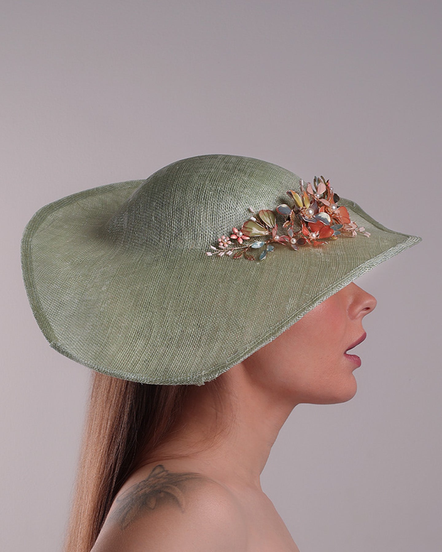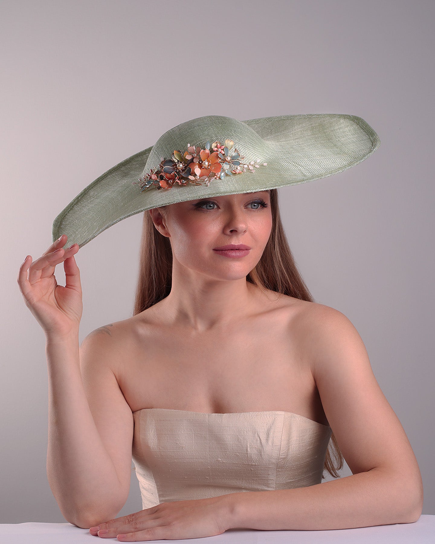Description: Green wide brim long hat, tilted to the right side swings upwards to the lefts side with a curve. Front top right side of the hat is decorated with multi colour resin flowers. Fitted to the head with wire headband and elastic.