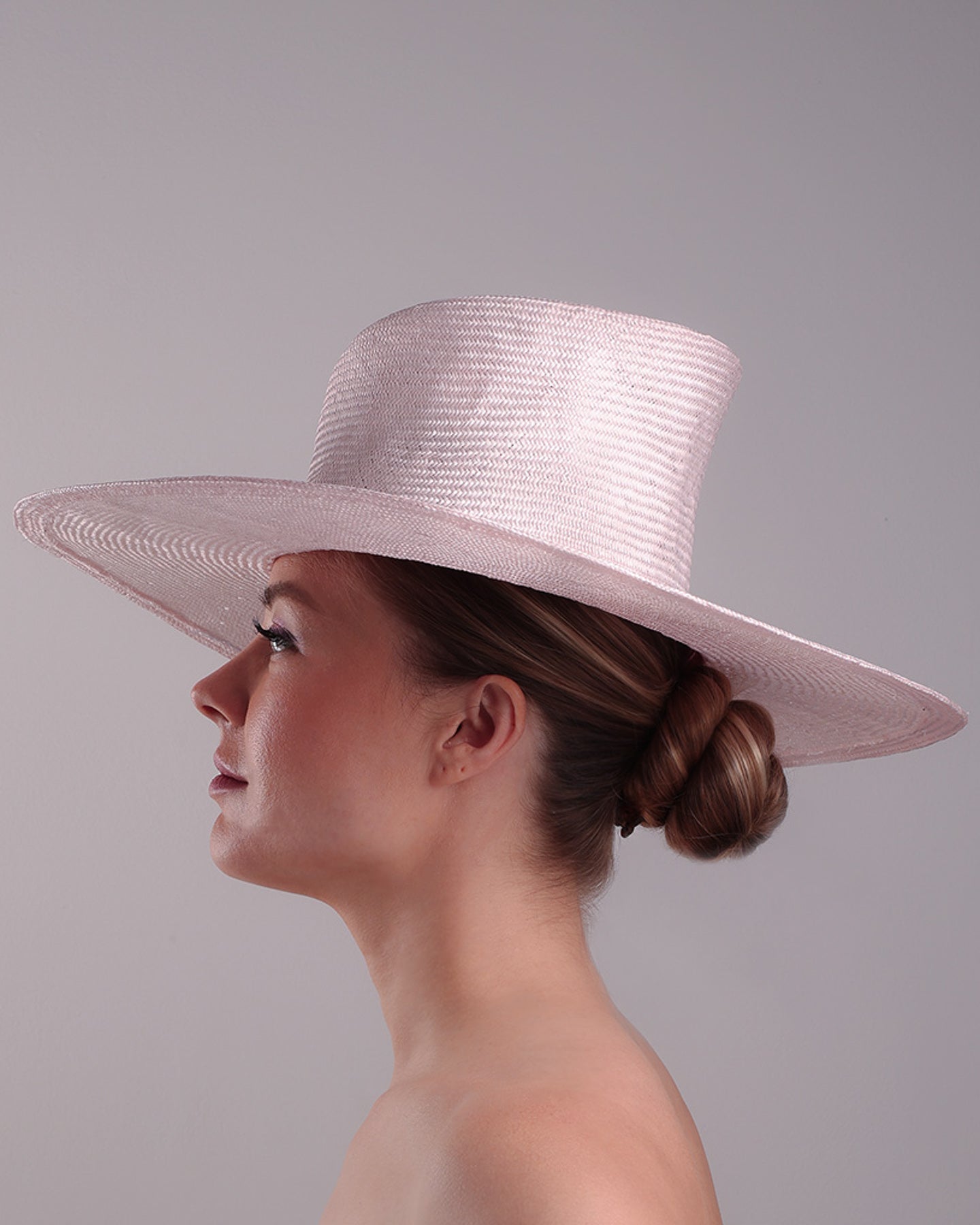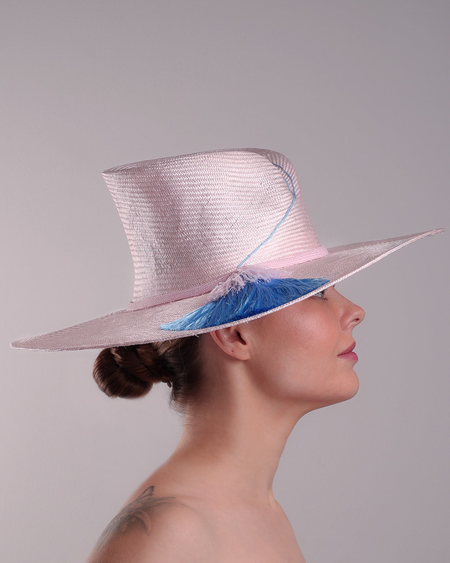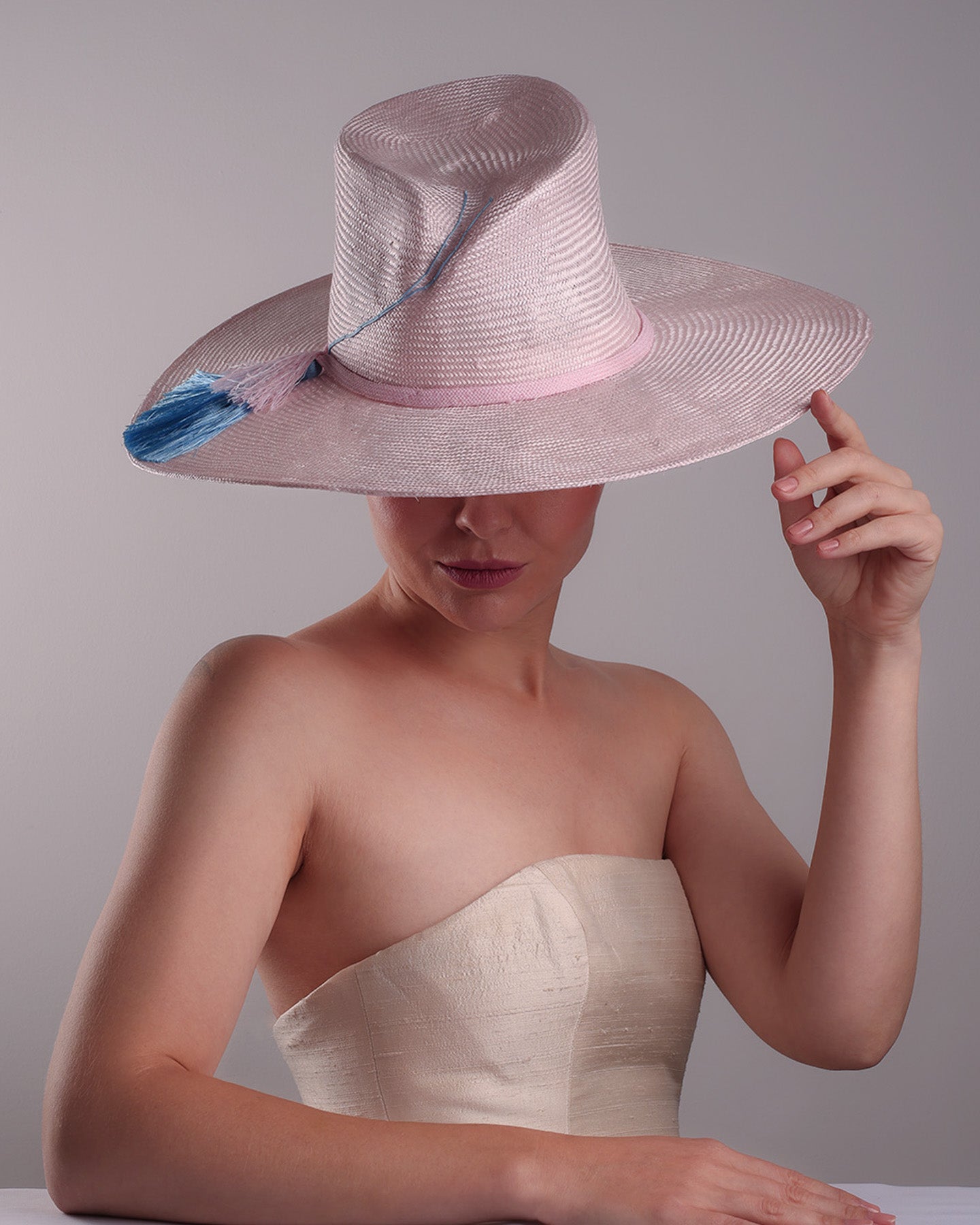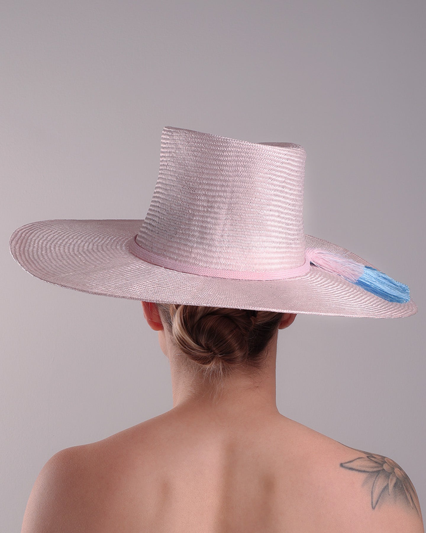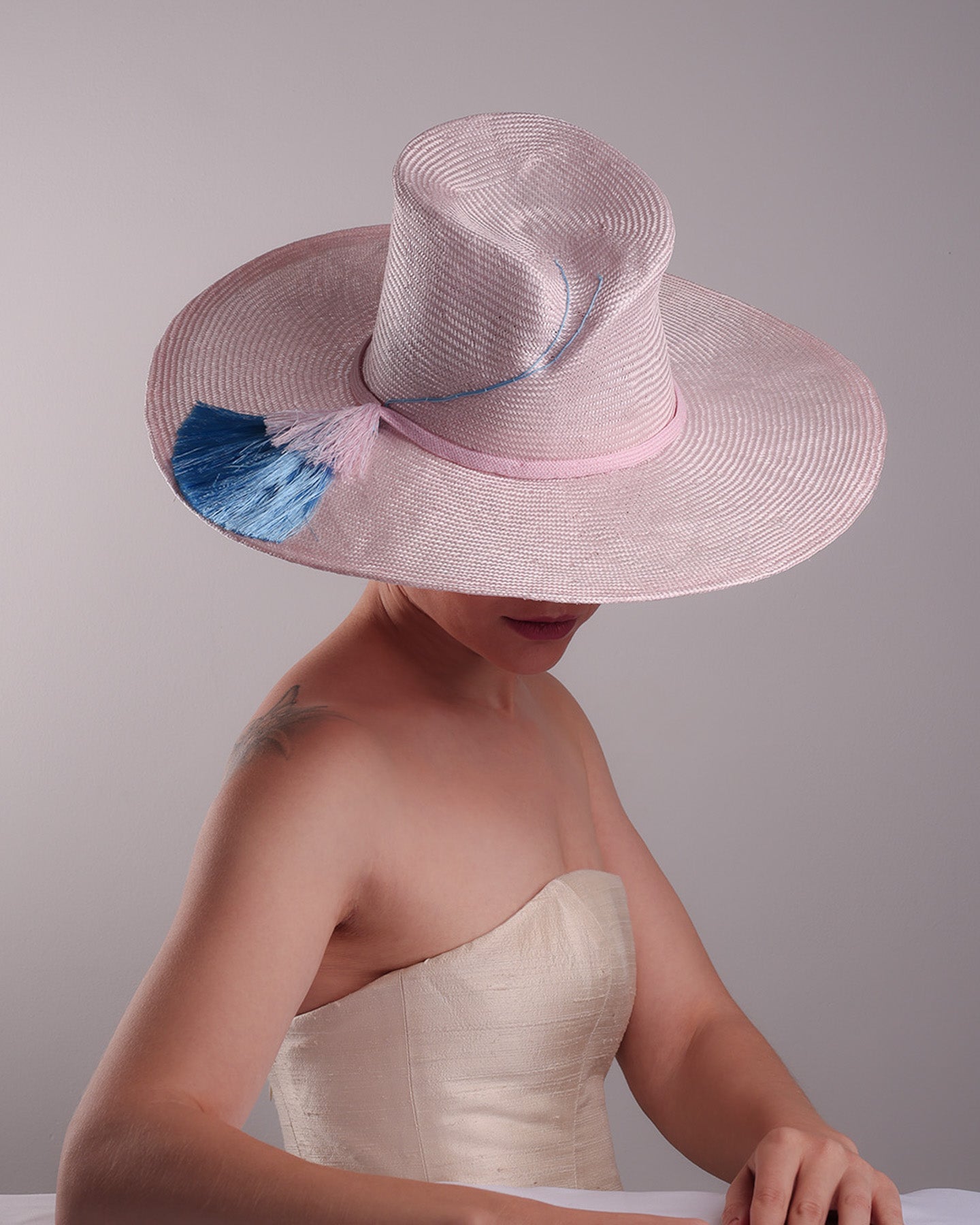 Description: The parasisal pink wide flat brimmed hat with high curved crown, decorated with layered pink on top of a blue silk tassels.