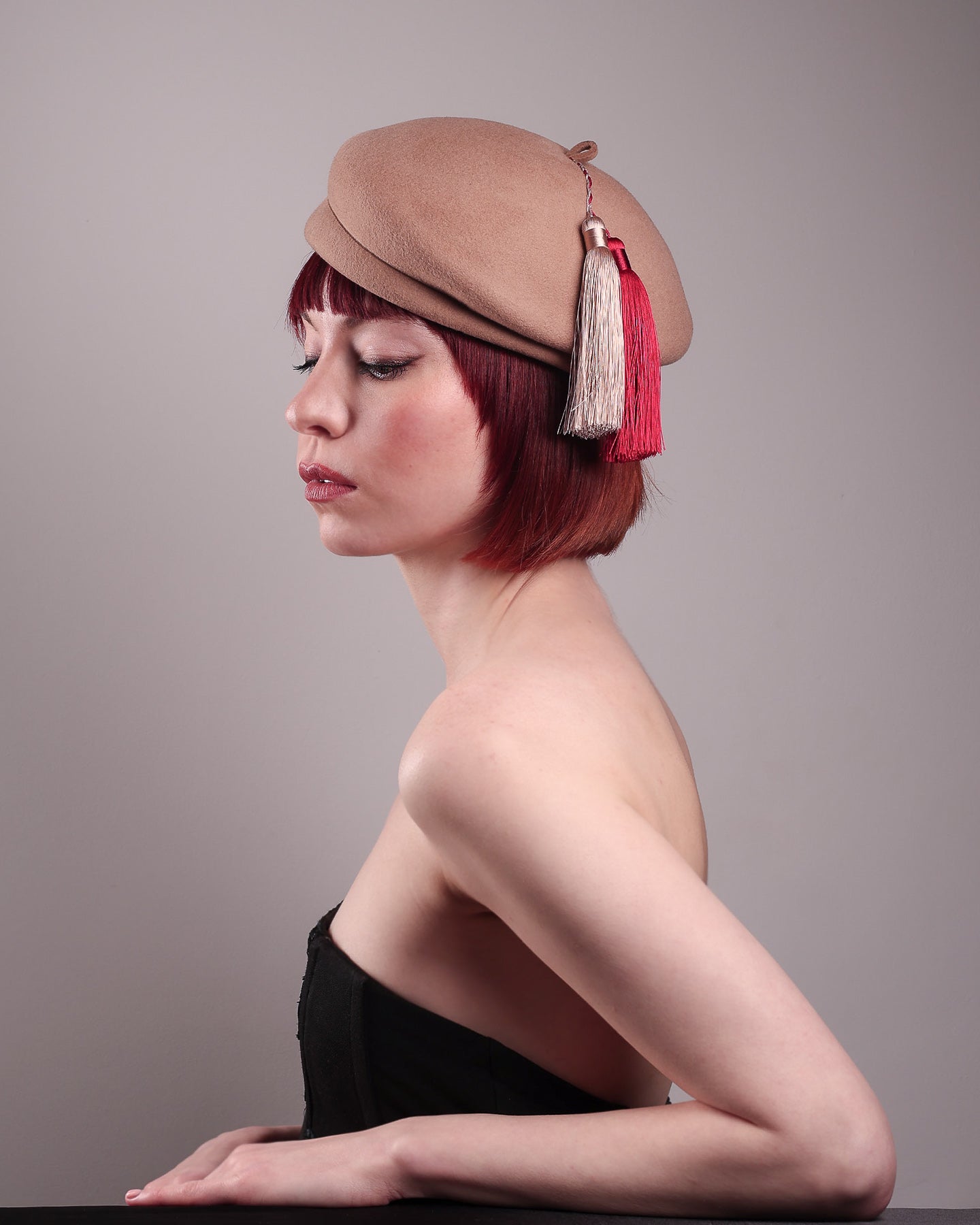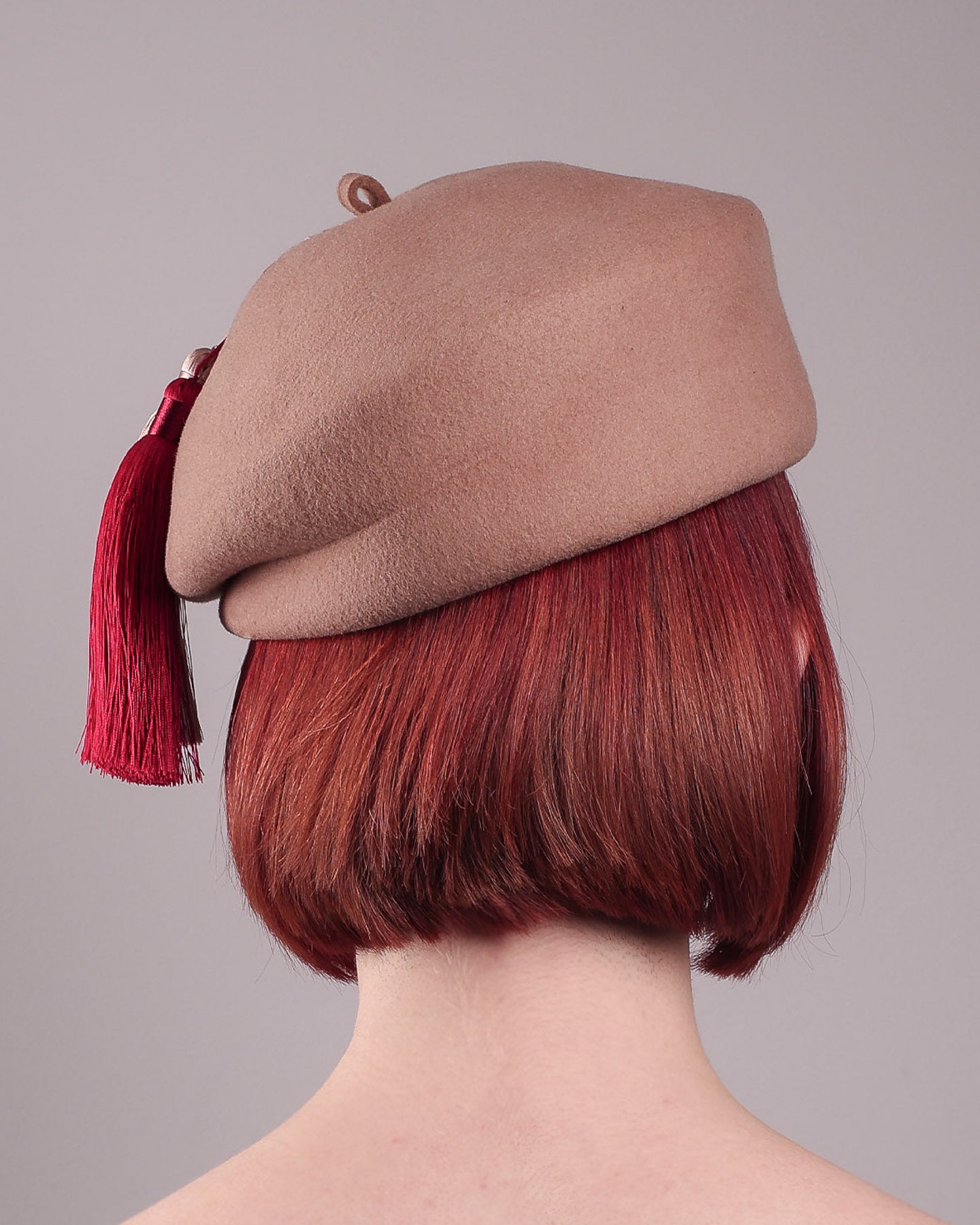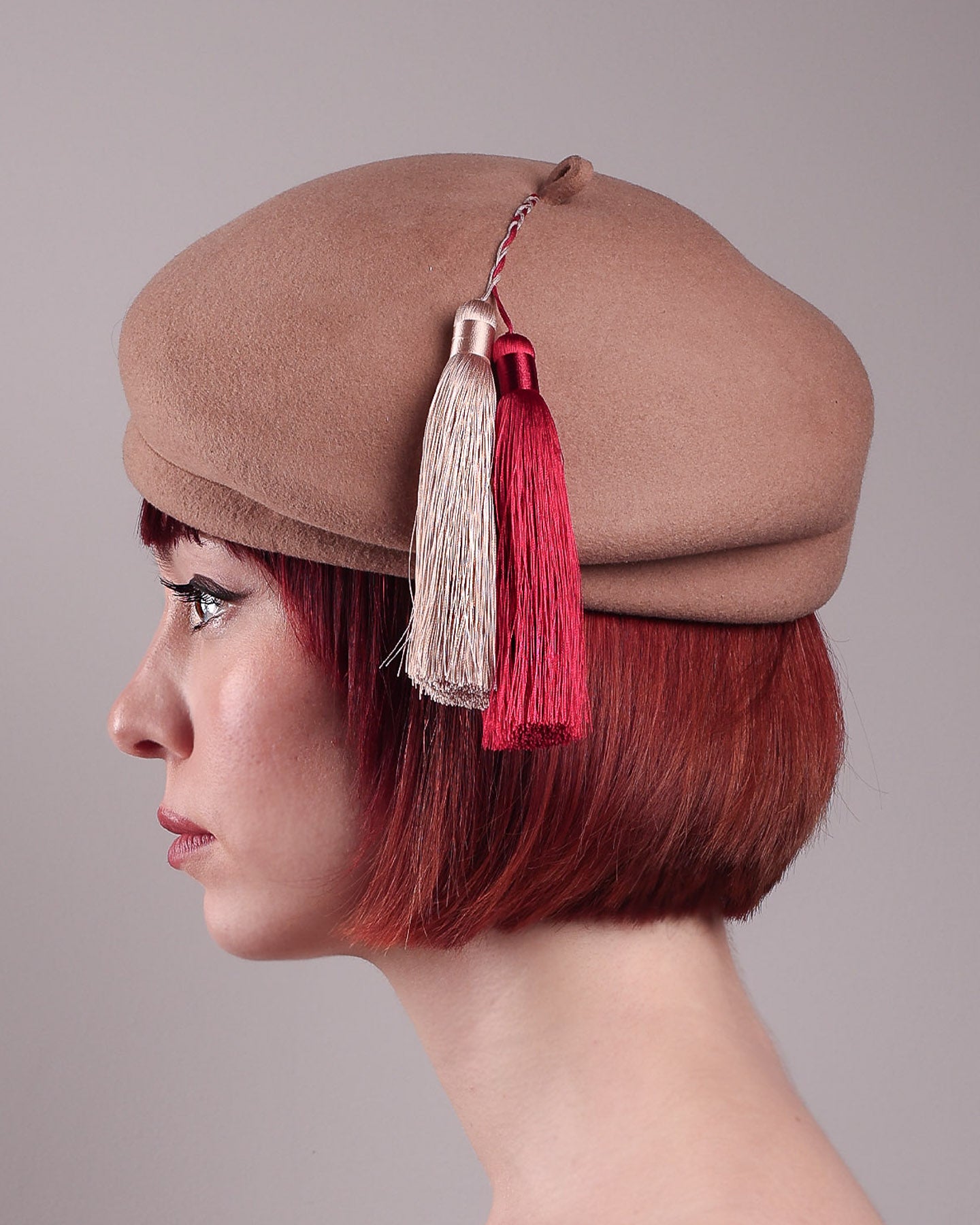 Playful yet poised, the Elera Beret Hat adds a touch of unexpected charm to cold-season style. Crafted from smooth camel wool felt, this structured beret features a dramatic two-tone tassel in crimson and cream, gently draped to one side from a polished metallic accent.
