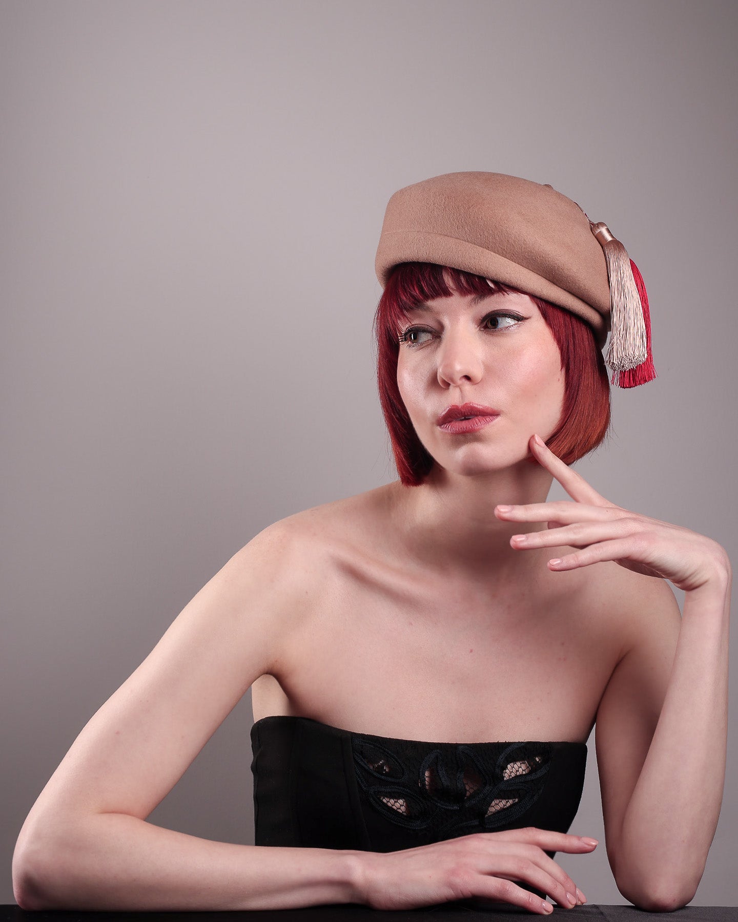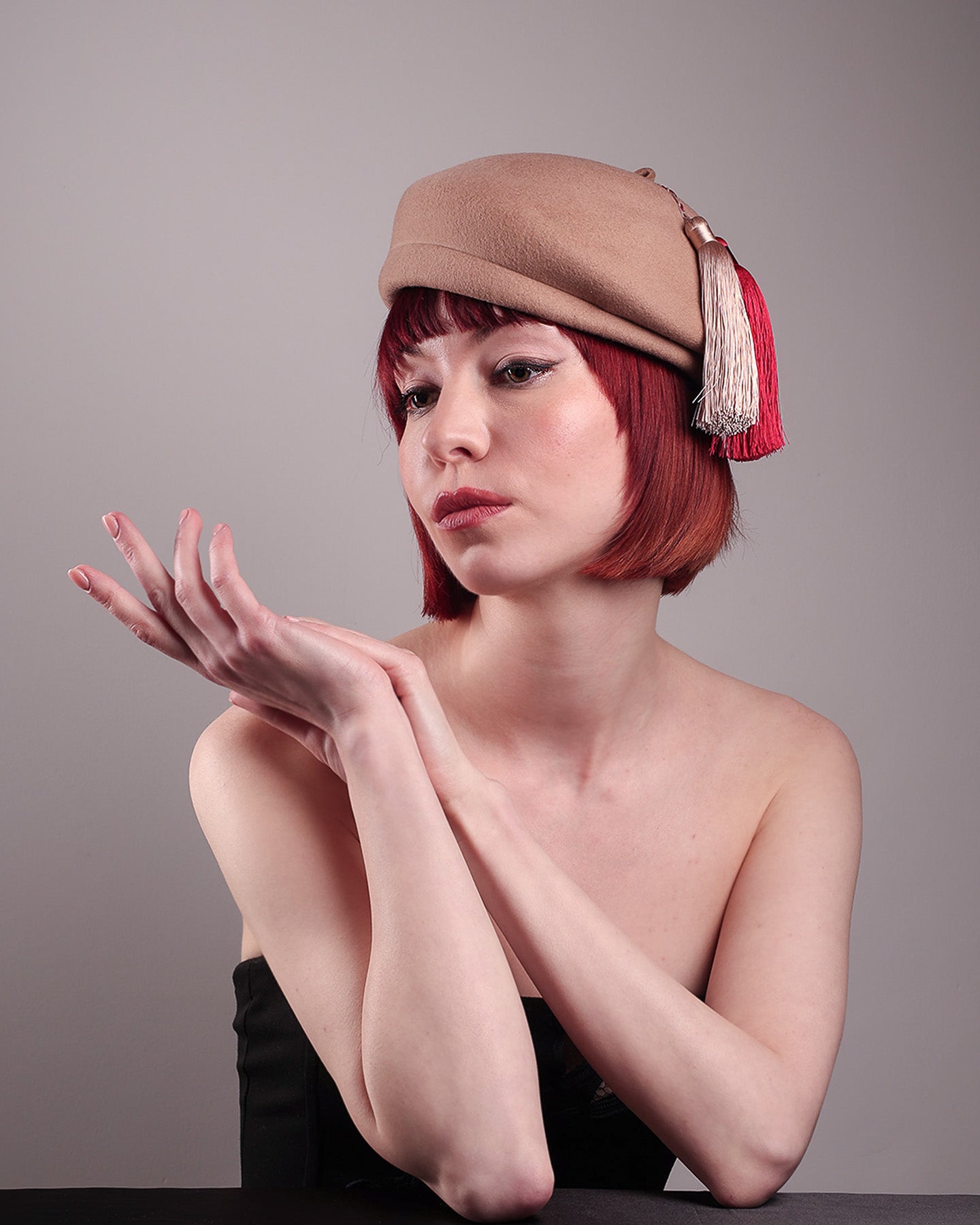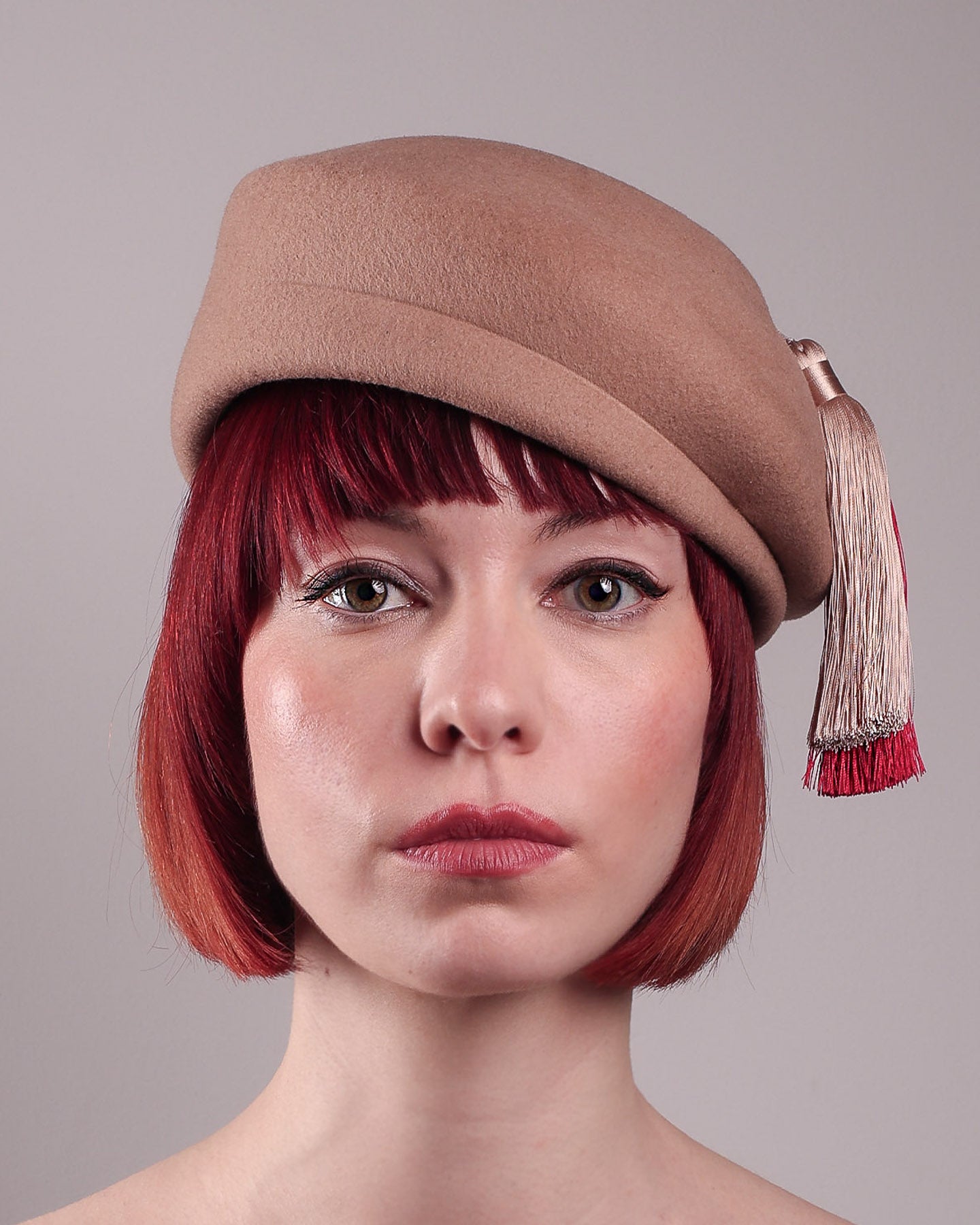 Playful yet poised, the Elera Beret Hat adds a touch of unexpected charm to cold-season style. Crafted from smooth camel wool felt, this structured beret features a dramatic two-tone tassel in crimson and cream, gently draped to one side from a polished metallic accent.