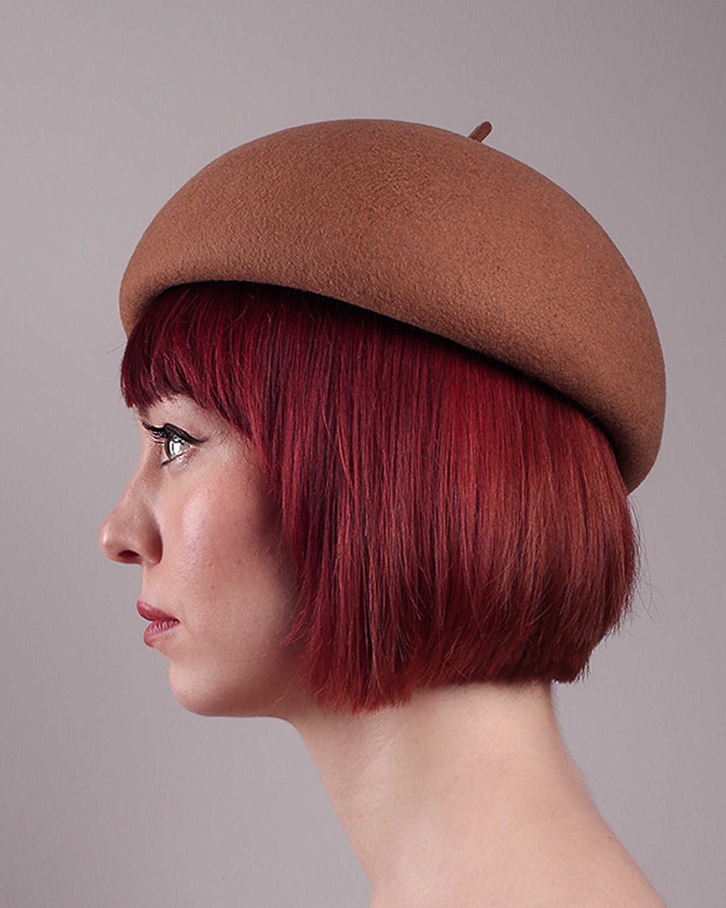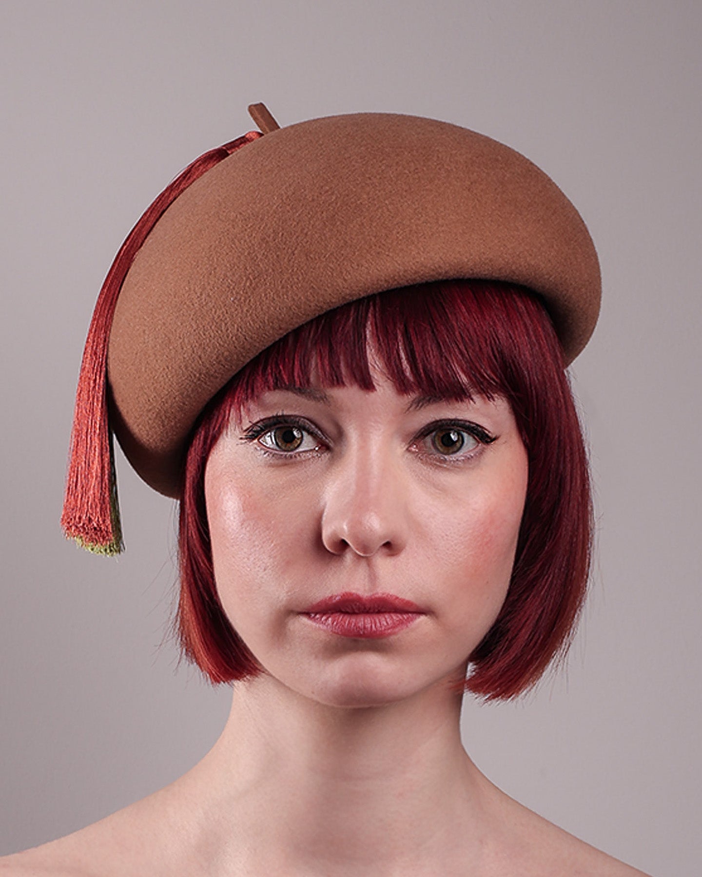 Whimsical and full of character, the Faye Beret Hat reinvents winter accessorising with a playful nod to traditional tassel detailing. Handcrafted in cinnamon-toned wool felt, its clean beret shape is topped with an oversized dual-tone tassel in zesty chartreuse and burnt orange, creating a striking contrast against the warm neutral base.