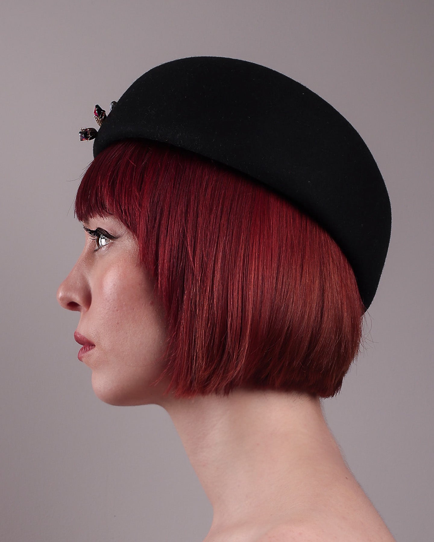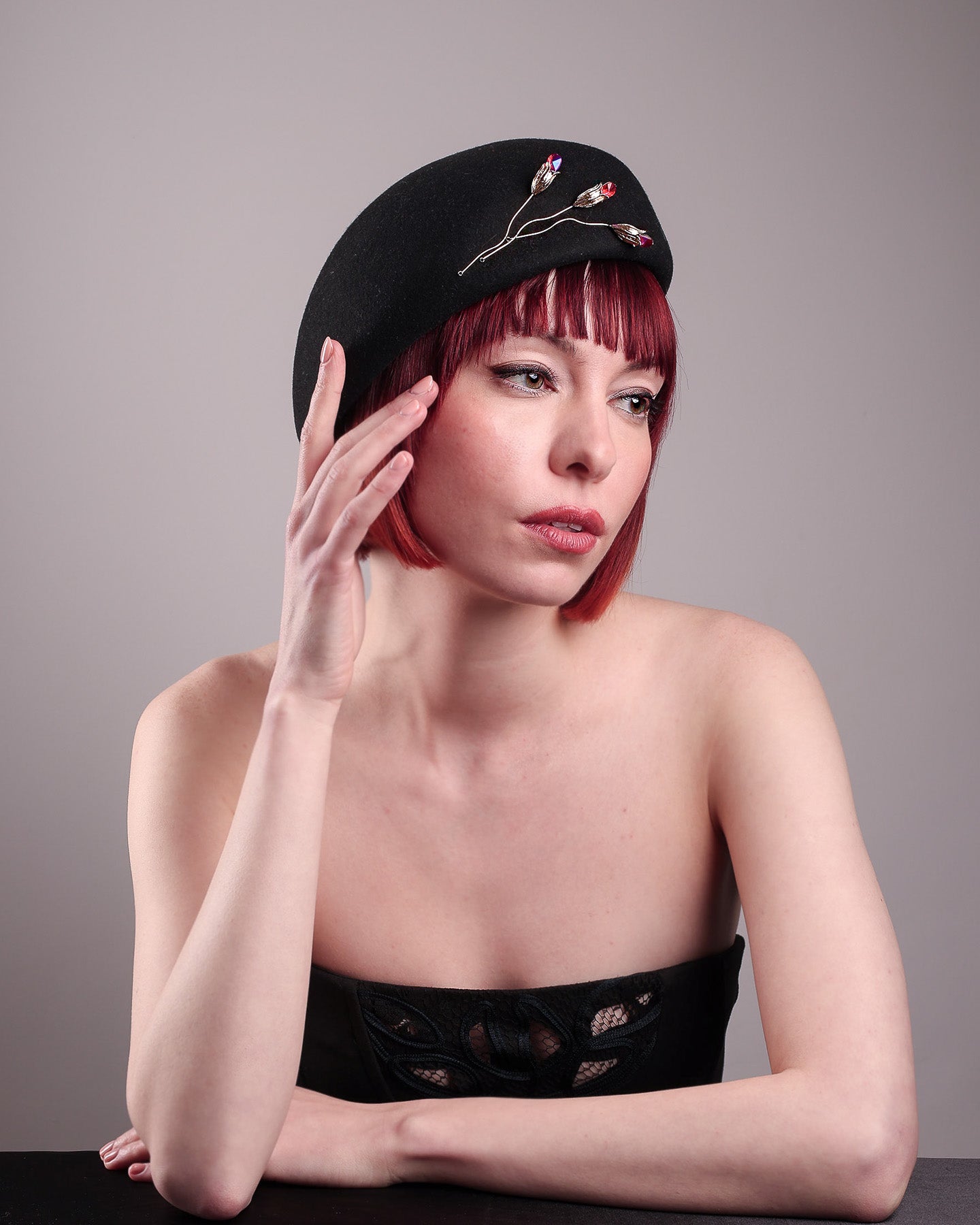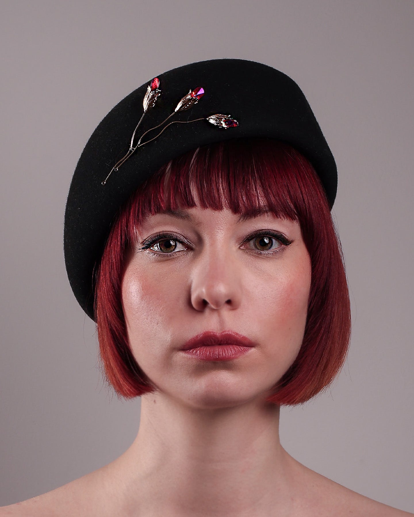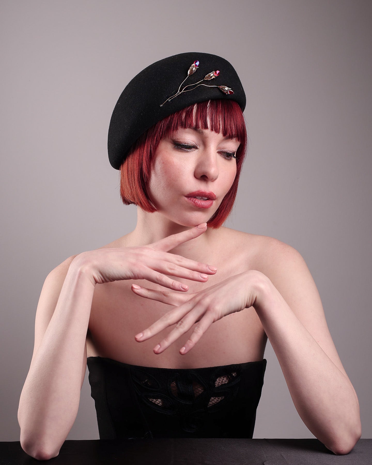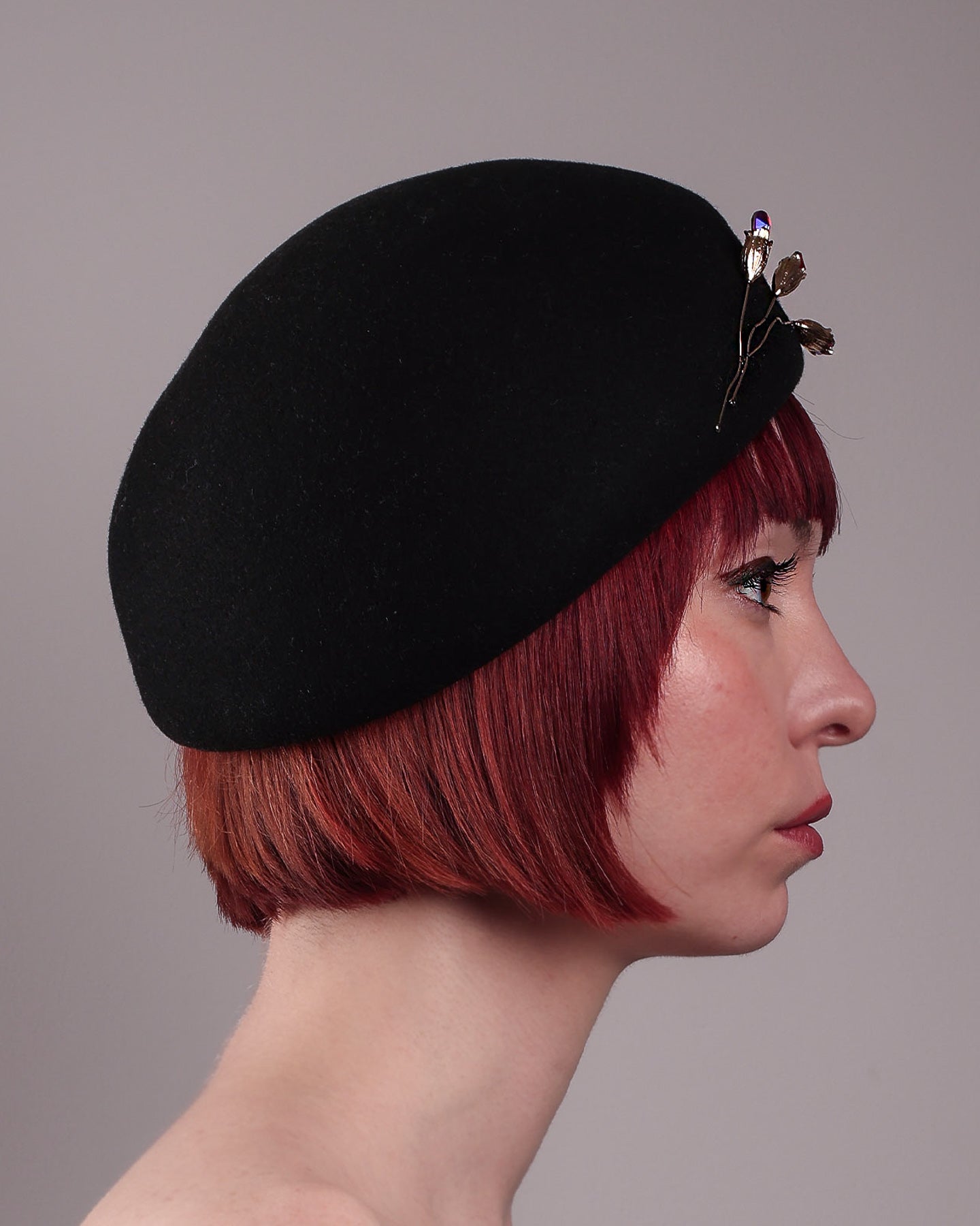 Elegant in form and delicate in detail, the Roselle Beret Hat offers a sophisticated nod to Parisian charm with a contemporary twist. Crafted from smooth black wool felt, its classic silhouette is elevated by a delicate metallic gold branch motif adorned with crystal-tipped buds that catch the light with subtle sparkle.