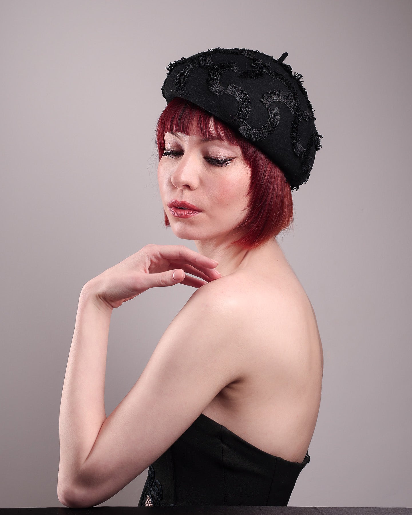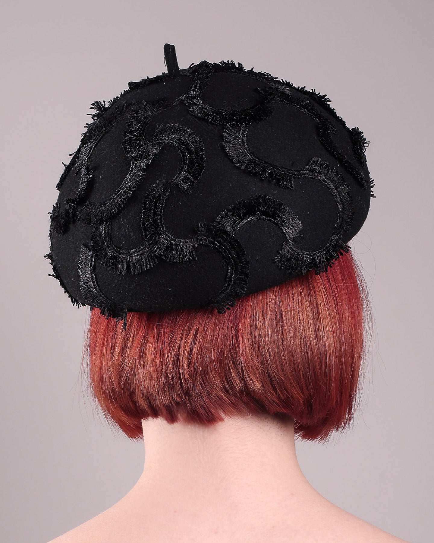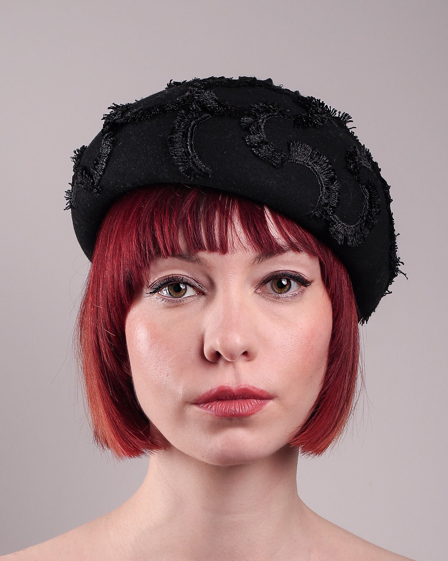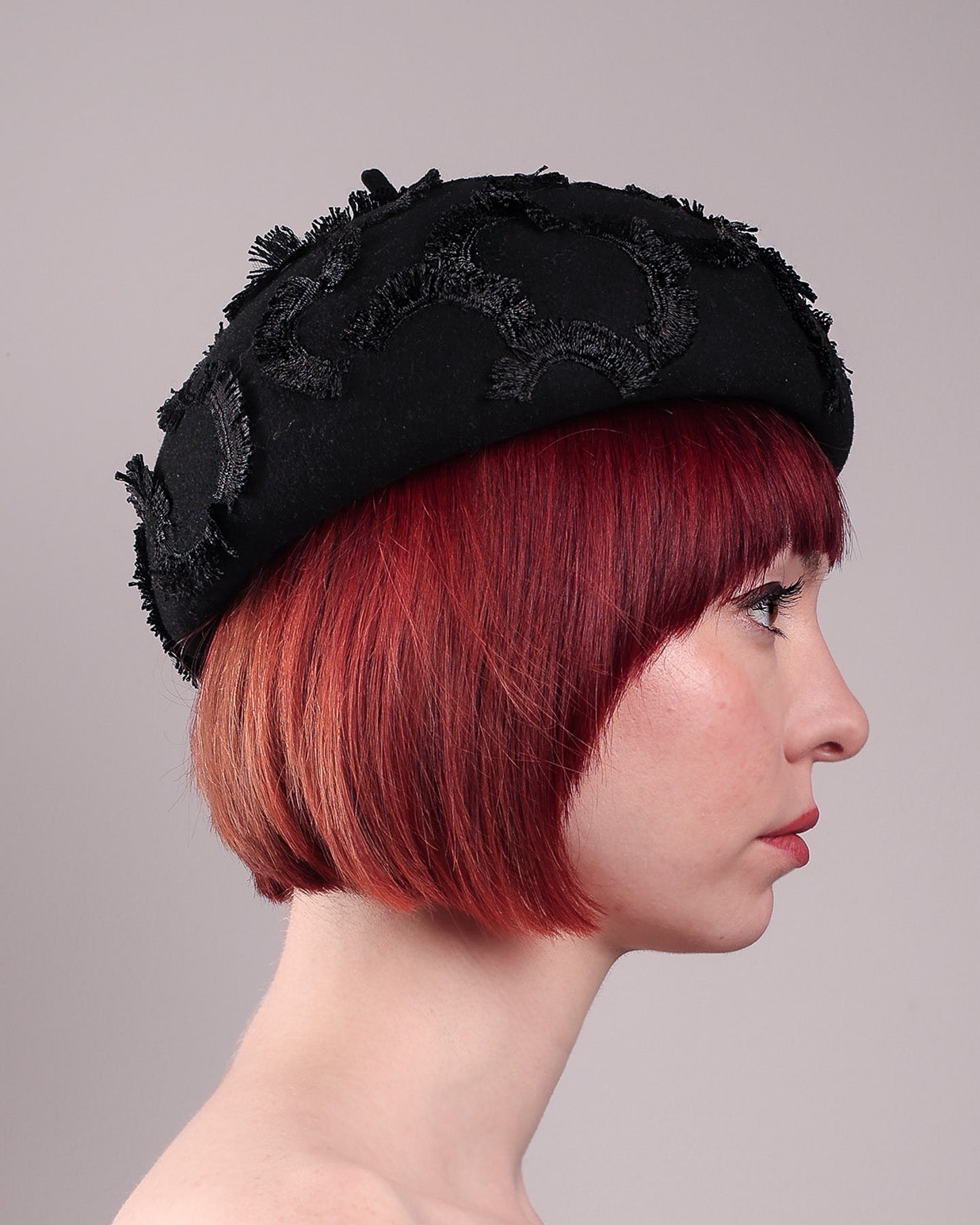 Dark, lace detailed, and undeniably refined, the Tilda Beret Hat is a study in texture and tone. Made from structured black wool felt, the rounded silhouette is embroidered with a raised abstract motif in tonal thread, creating a sense of depth without distraction. The result is a piece that feels subtle at first glance, yet reveals its complexity the closer you look.