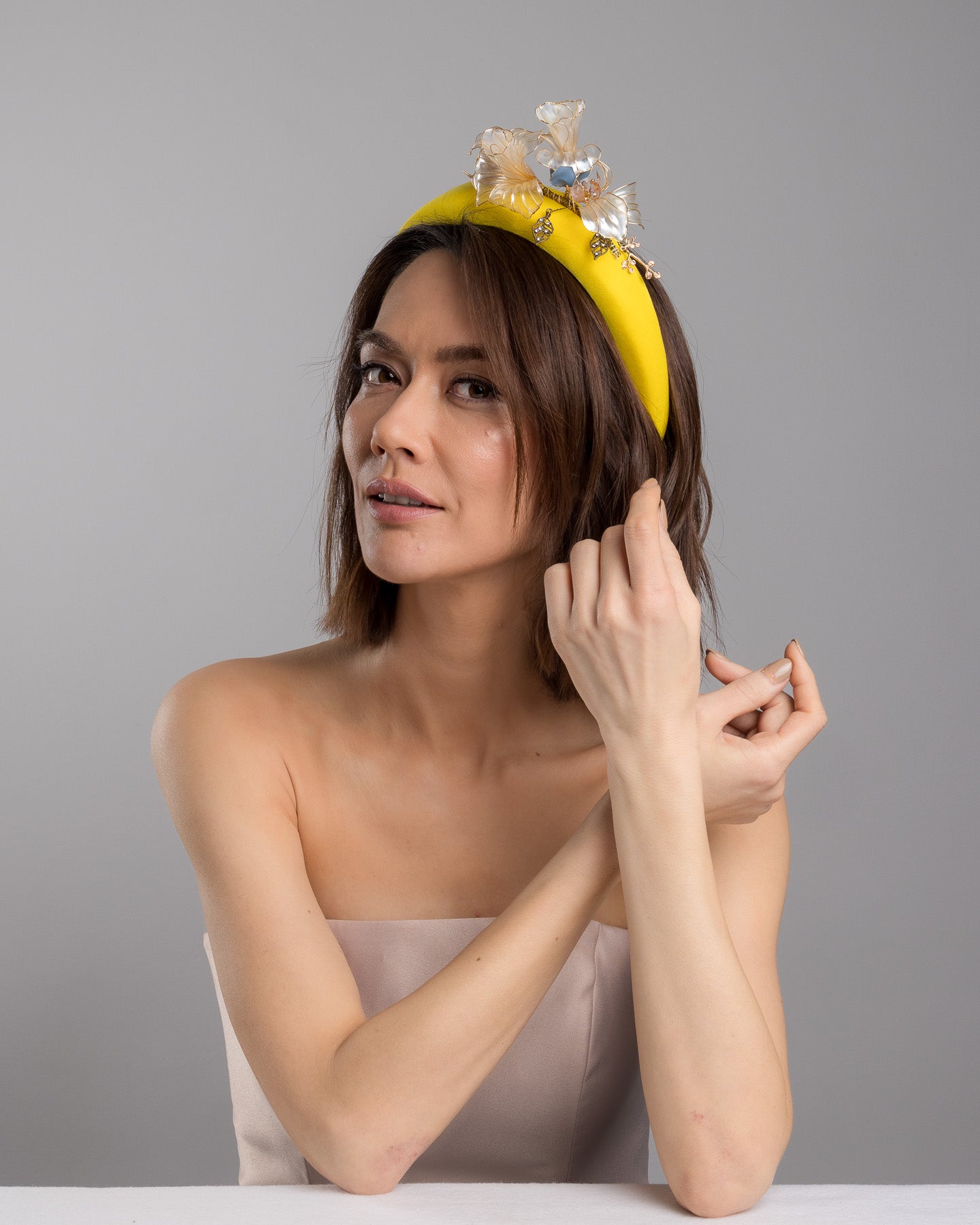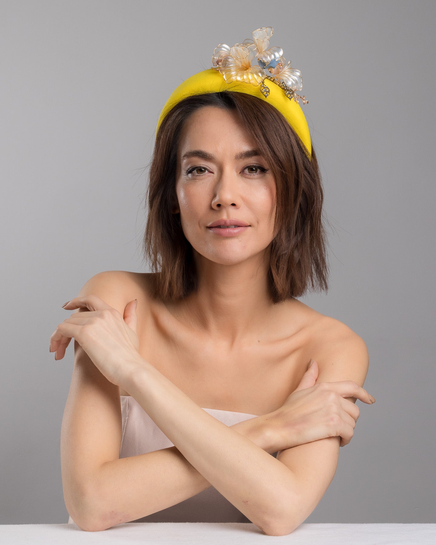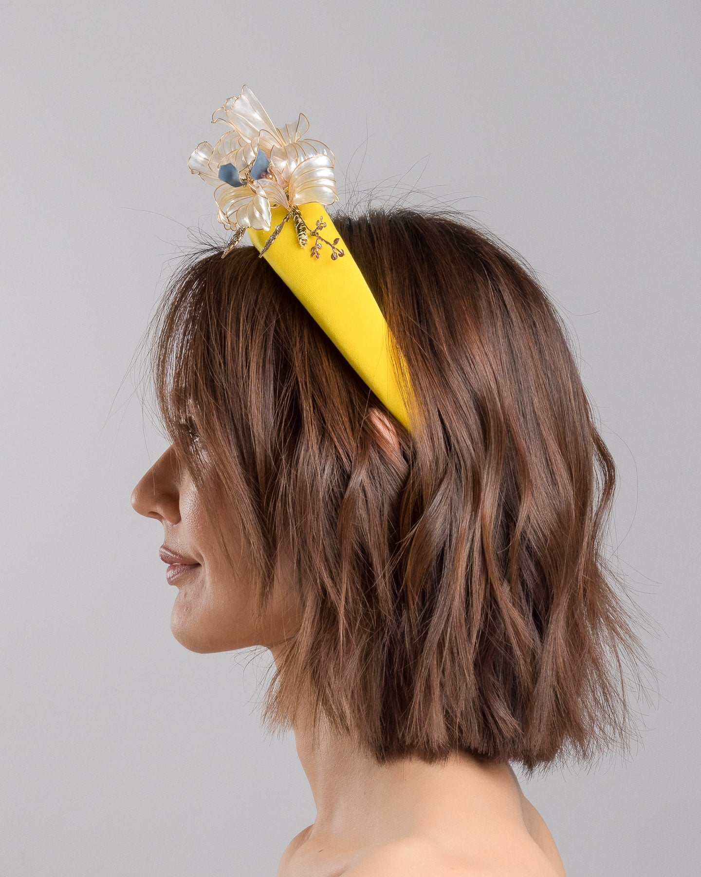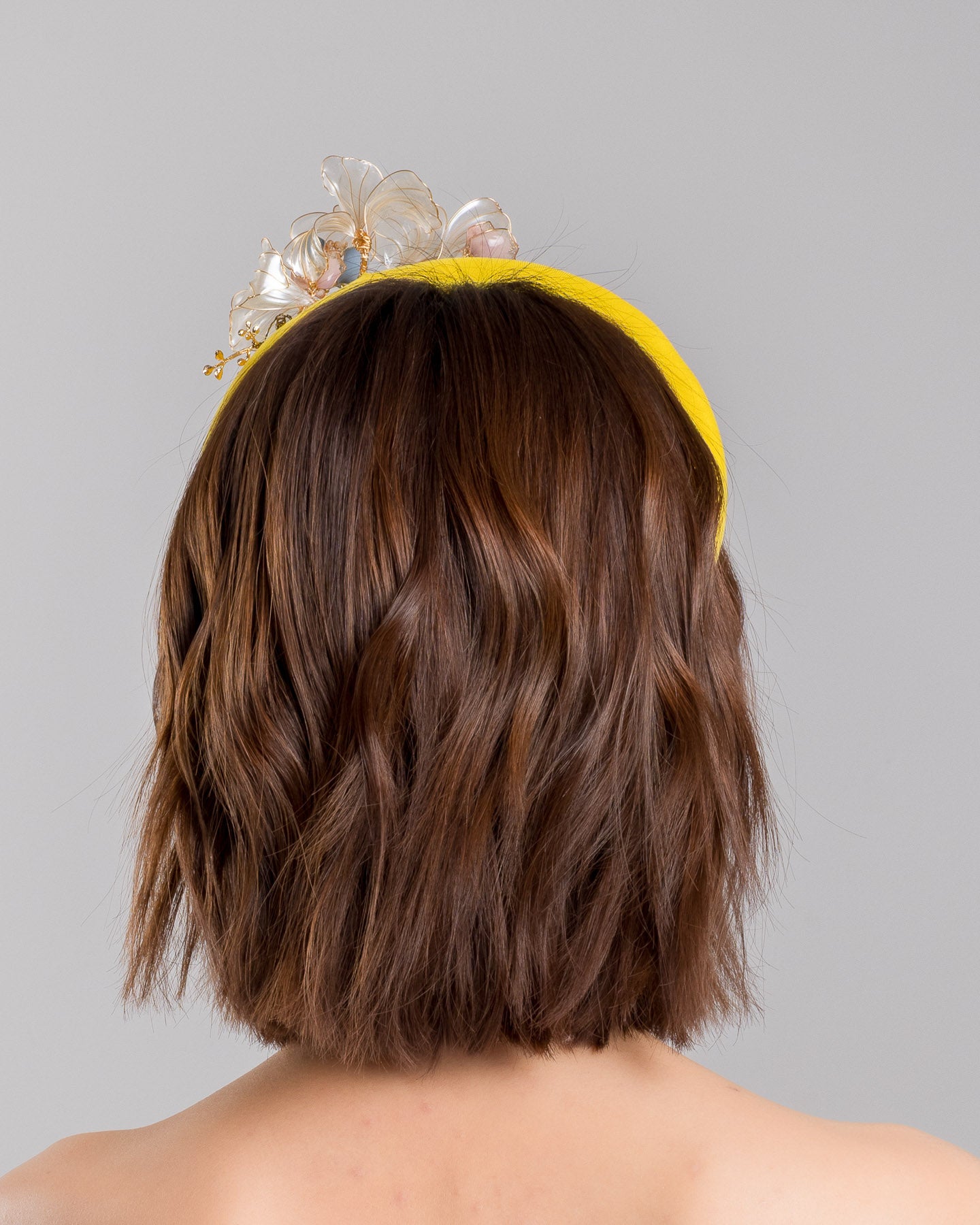 Description: High yellow headband decorated with wired sheer resin flowers and small metal adornments.